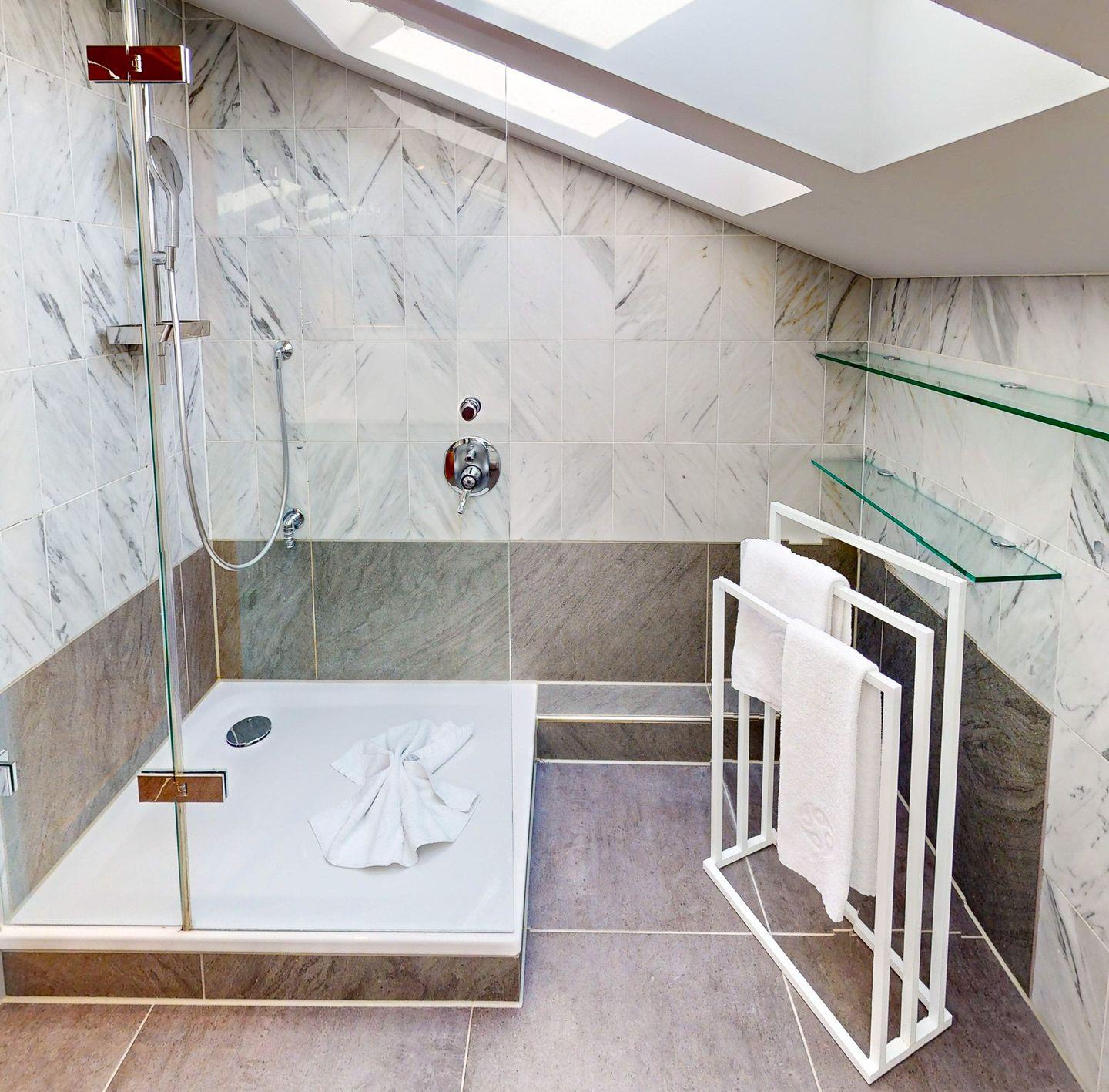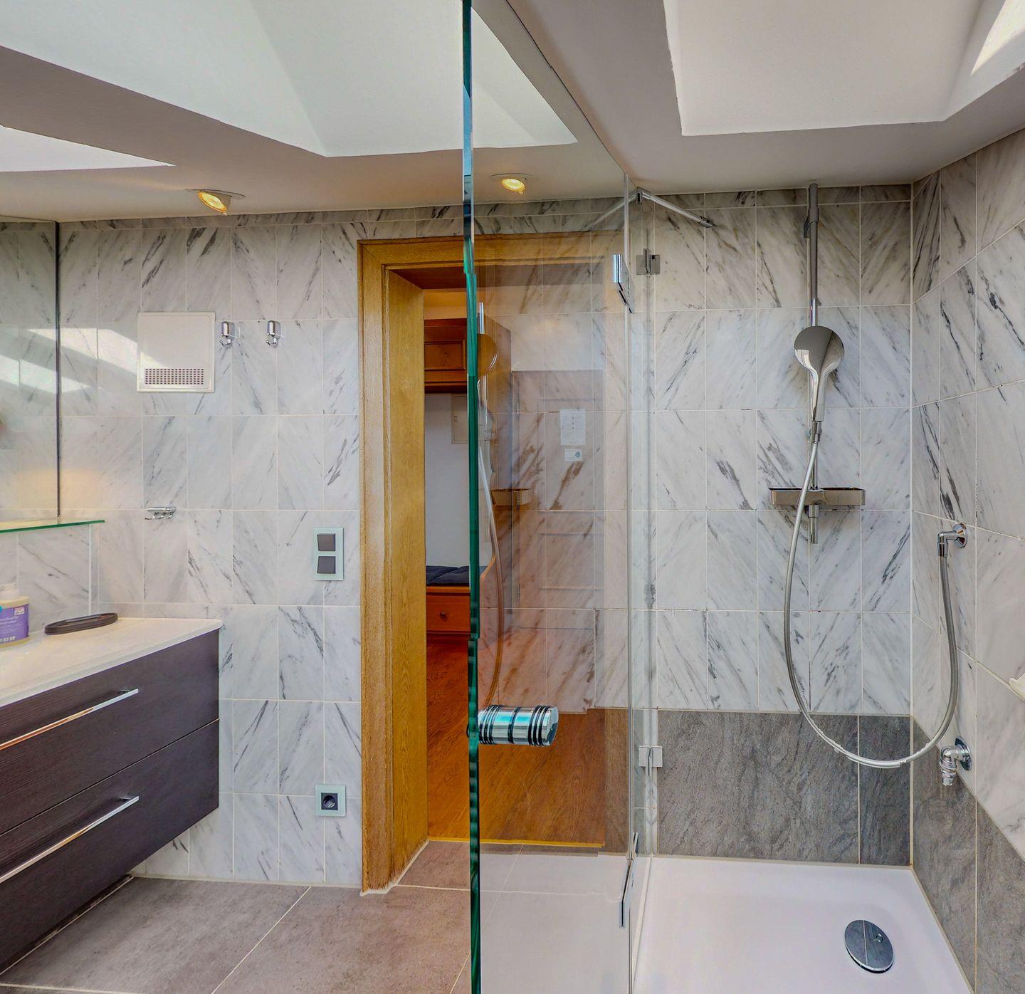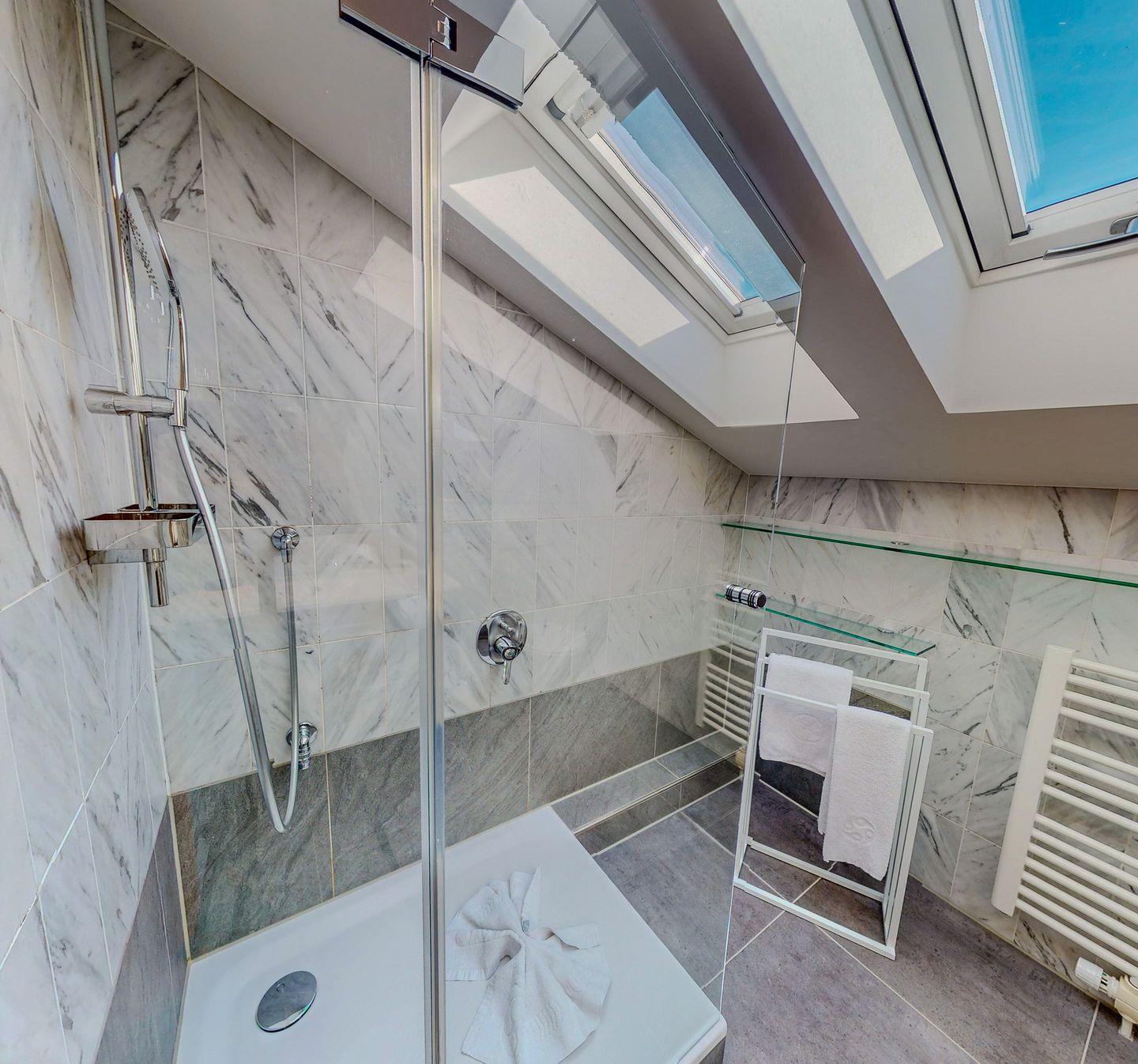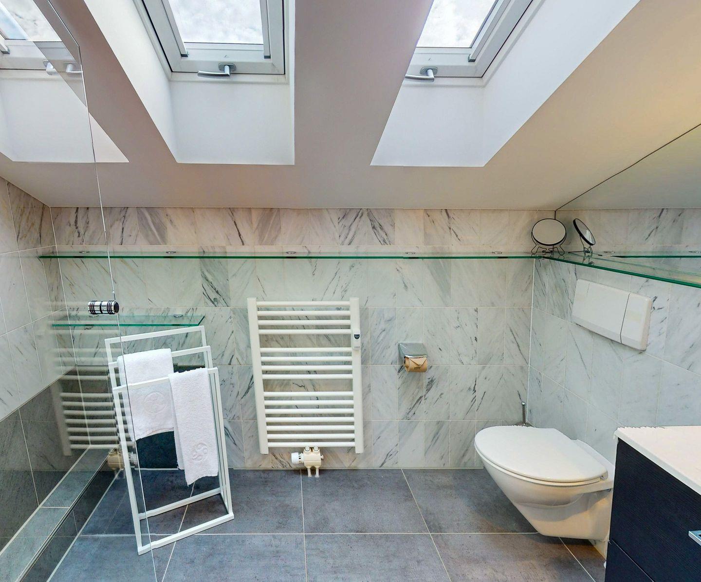 Das Badezimmer verfügt neben einer Toilette und Waschbecken auch über eine ebenerdige Dusche. Zwei Oberlichter sorgen für gute Beleuchtung mit Tageslicht. Ein separates Gäste-WC bietet auch bei einer Belegung mit 4 Personen zusätzlichen Komfort.