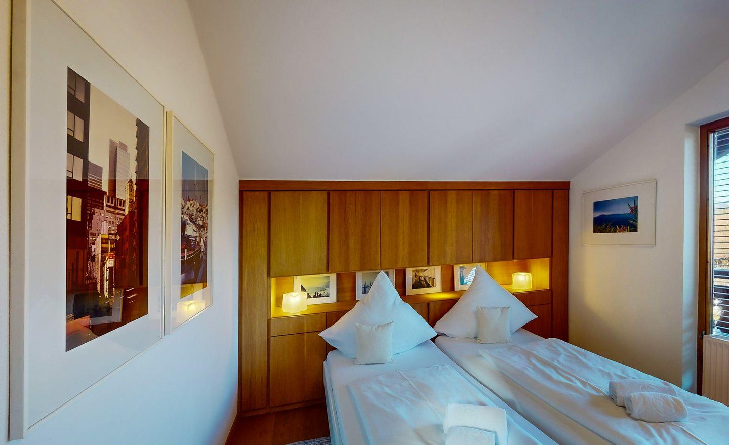 Das eigentliche Schlafzimmer bietet zwei Einzelbetten, die zusammengeschoben als Doppelbett oder separat genutzt werden können, ist mit maßgefertigten Holzschränken ausgestattet, von denen einer sowohl als Kopfteil für das Bett dient. Große Fenster durchfluten den Raum mit natürlichem Licht und bieten gleichzeitig Zugang zum zweiten Balkon, auf dem sich beim Frühstück die ersten Sonnenstrahlen genießen lassen.