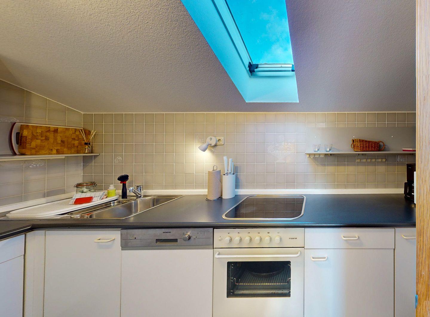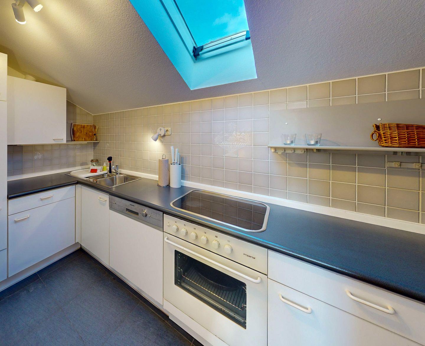 Die schlichte Küche ist mit modernen Geräten und allen wichtigen Utensilien ausgestattet. Hier finden Sie alles, um eigene Mahlzeiten zuzubereiten, die Sie sich am Esstisch in der einladenden Essecke außerhalb der Küche schmecken lassen können. Ein Oberlicht über der Küche lässt zusätzliches natürliches Licht einfallen und sorgt für ein helles und luftiges Raumgefühl.