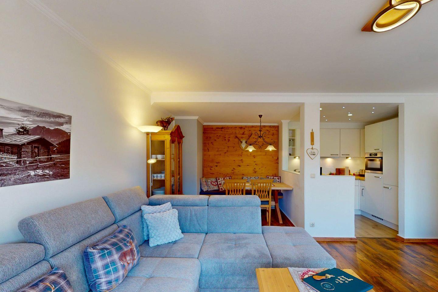 Freuen Sie sich auf ein geräumiges, lichtdurchflutetes Wohnzimmer, das mit einer gemütlichen Couch, einem Sessel und einem Essbereich ausgestattet ist. Perfekt, um entspannte Stunden vor dem Flachbild-Kabel-TV zu verbringen oder Musik über die Stereoanlage zu genießen. Das Sofa lässt sich bei Bedarf ausklappen und in einen bequemen Schlafplatz für 2 Personen umfunktionieren. Direkt angrenzend lädt der Südwestbalkon mit komfortablen Möbeln dazu ein, den Blick auf das beeindruckende Wettersteinmassiv und die Zugspitze schweifen zu lassen – ein idealer Ort, um die Sonne zu genießen und den Tag in Ruhe ausklingen zu lassen.