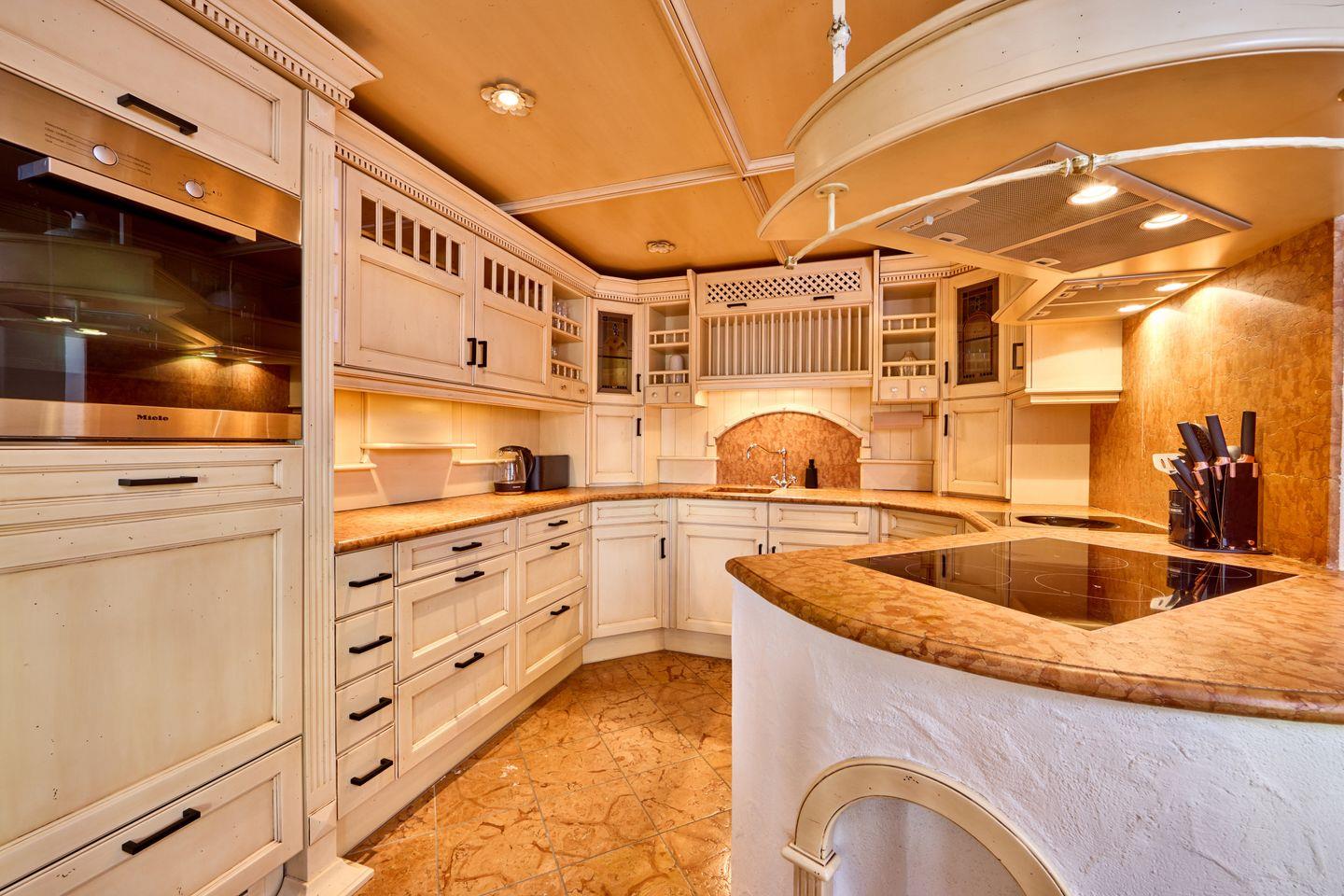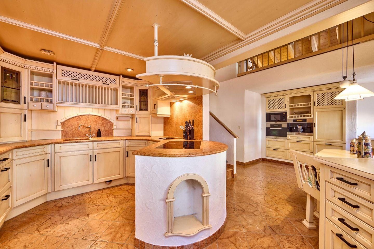 Die Küche besticht durch ihr einzigartiges, geschwungenes Design, das Funktionalität mit künstlerischem Flair verbindet und der Traum eines jeden Kochbegeisterten ist. Hochwertige Geräte sind nahtlos in die maßgefertigten Schränke integriert, und ein kleiner Esstisch bietet eine charmante Möglichkeit für Kaffee oder Frühstück zu zweit. Warme Holztöne und die innovative Aufteilung der Küche machen sie sowohl funktional als auch optisch ansprechend.