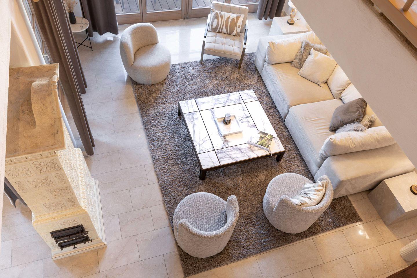 Sobald Sie eintreten, werden Sie vom Herzstück der Wohnung empfangen: einem offenen, sonnendurchfluteten Wohn- und Essbereich, in dem Eleganz auf Komfort trifft. Das Wohnzimmer ist mit einer einladenden Sofagarnitur ausgestattet. Hier können Sie sich mit Ihren Lieben entspannen oder einfach einen Abend vor dem Fernseher verbringen. Der offene Bereich im Obergeschoss schafft eine elegante und großzügige Atmosphäre. Raumhohe Fenster durchfluten den Raum mit Tageslicht und bieten einen malerischen Blick auf die Umgebung und die Landschaft.