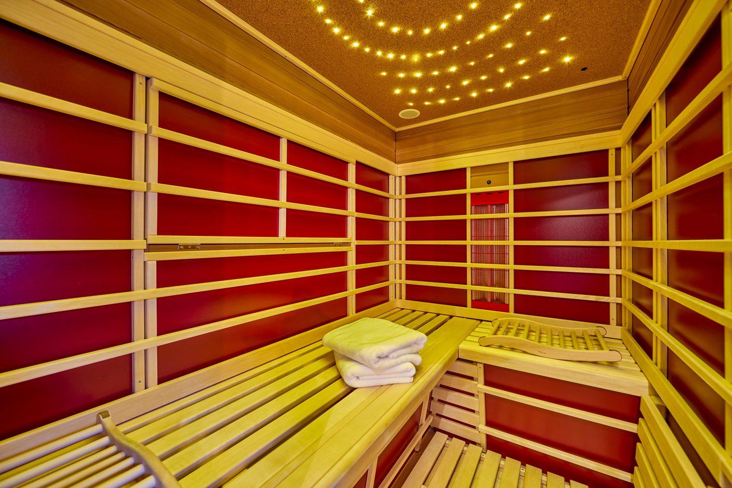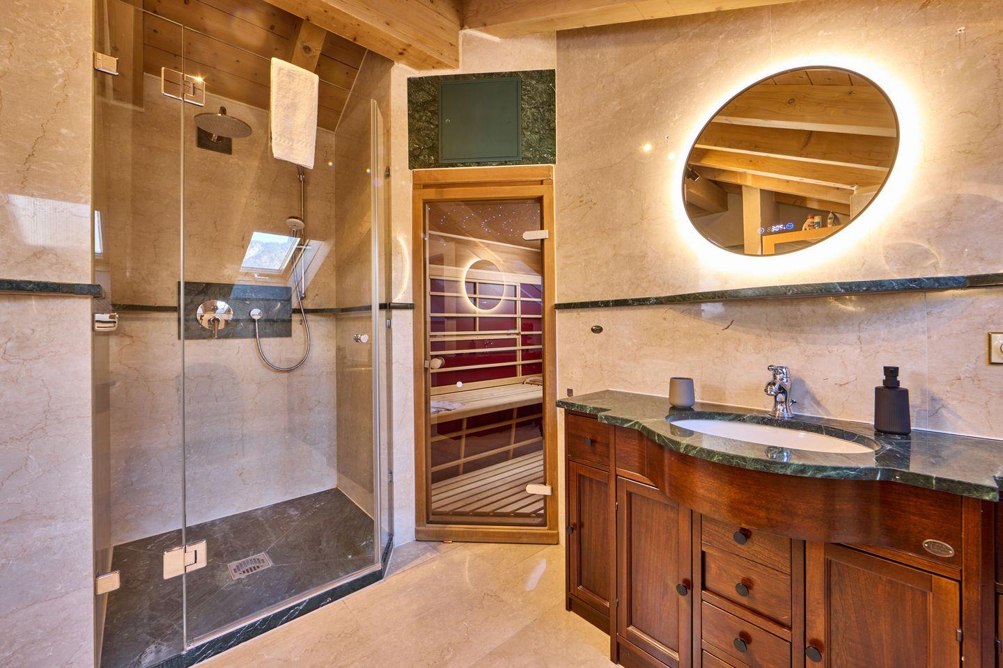 Der Luxus erstreckt sich auch auf das Badezimmer, welches eine ebenerdige Dusche mit Regenbrause, zwei elegante Waschtische und ein separates WC bereithalten. Dachfenster bringen natürliches Licht in den Raum. Materialien wie edles Holz und Marmor sorgen für einen Hauch von Eleganz. Eine Infrarot-Kabine bietet nach einem langen Tag in den Bergen oder der Erkundung der malerischen Stadt den idealen Weg, um sich zu entspannen.