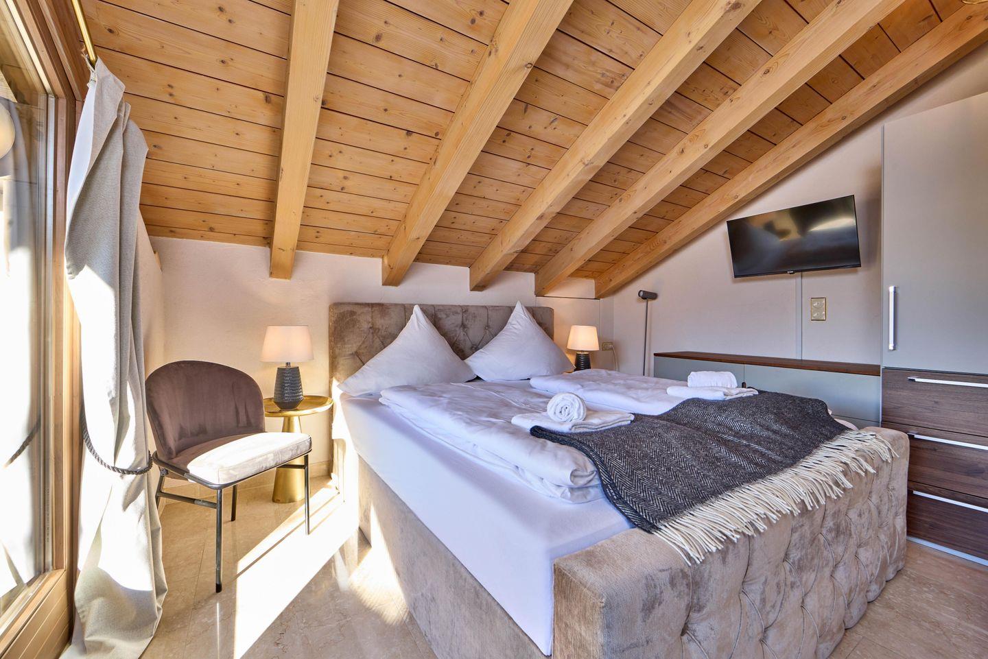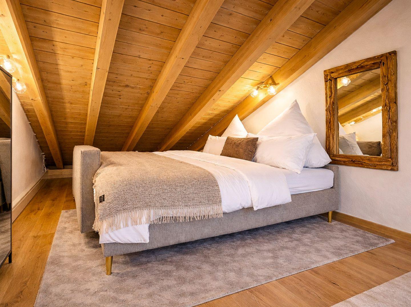 Über eine Treppe gelangen Sie zu den drei Schlafbereichen. Decken mit freiliegenden Holzbalken verleihen Charakter und Wärme, während strategisch platzierte Oberlichter viel Tageslicht in den Raum lassen. Ein Schlafbereich ist mit einem hochwertigen Doppelbett ausgestattet und bietet direkten Zugang zu einem der drei Balkone. Das zweite Schlafzimmer verfügt ebenfalls über ein bequemes Doppelbett und eine gemütliche Nische im Dachschrägenbereich, die sich ideal als ruhiger Rückzugsort eignet.