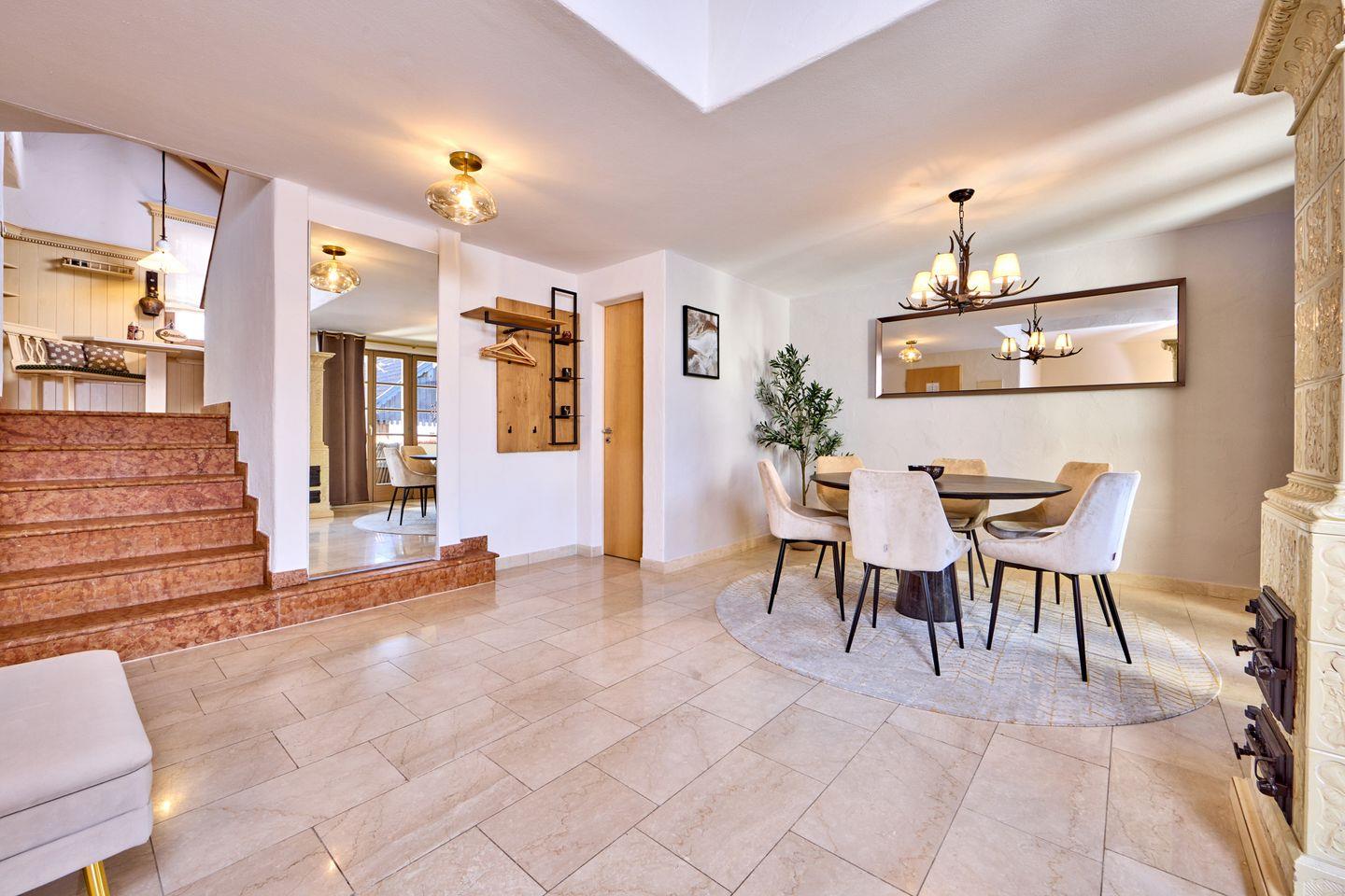Der Essbereich verfügt über einen eleganten Holztisch, der mit einem beeindruckenden antiken Schrank kombiniert ist. Moderne Beleuchtung und dekorative Elemente verleihen der traditionellen Einrichtung einen zeitgemäßen Touch. Angrenzend finden Sie eine kleine Garderobe und ein praktisches Gäste-WC.