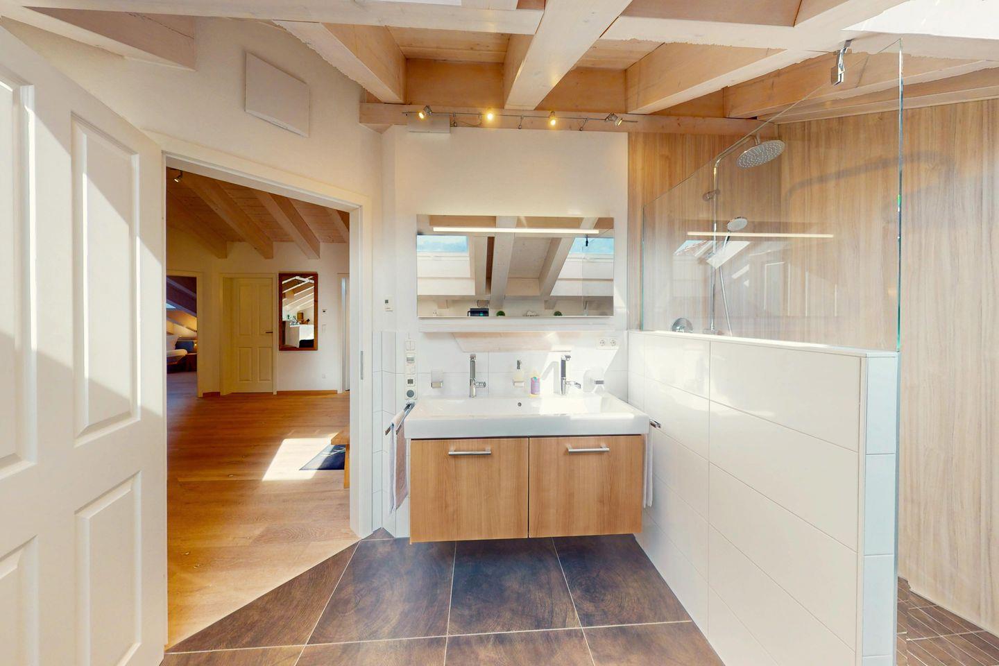 Die zwei Tageslichtbäder sind modern und komfortabel ausgestattet: Das kleinere Bad verfügt über Waschbecken, ebenerdige Dusche und WC, das größere über ein Doppelwaschbecken, eine ebenerdige Dusche, WC und Bidet.