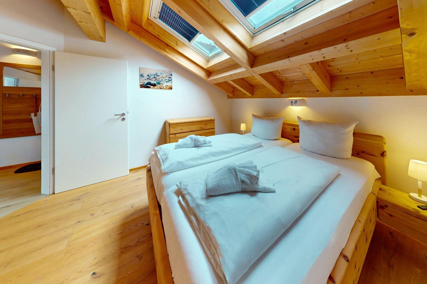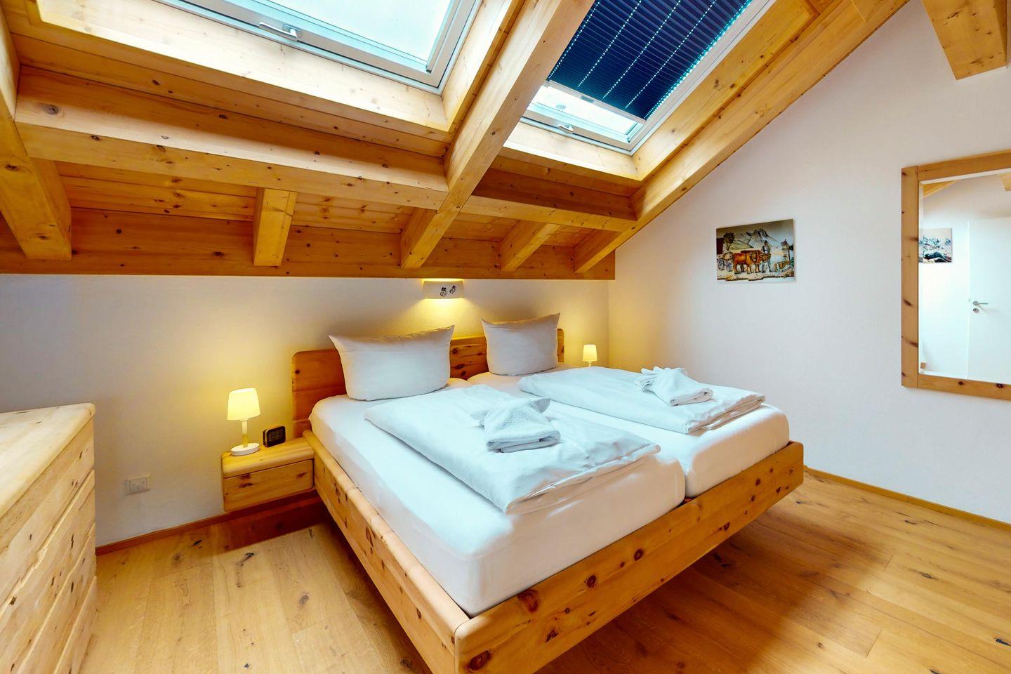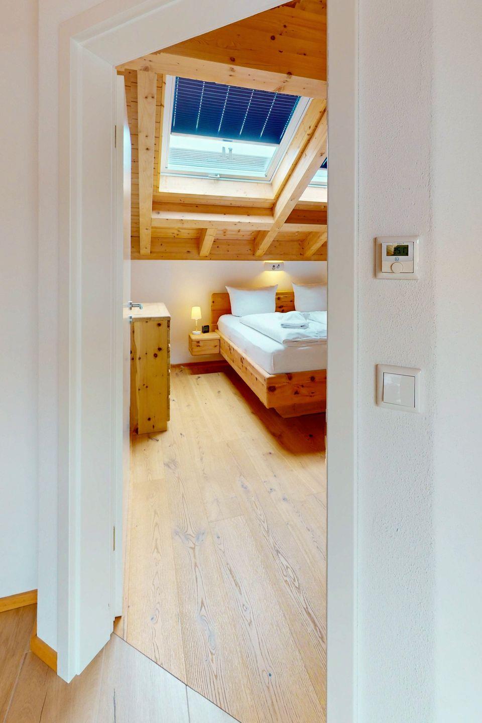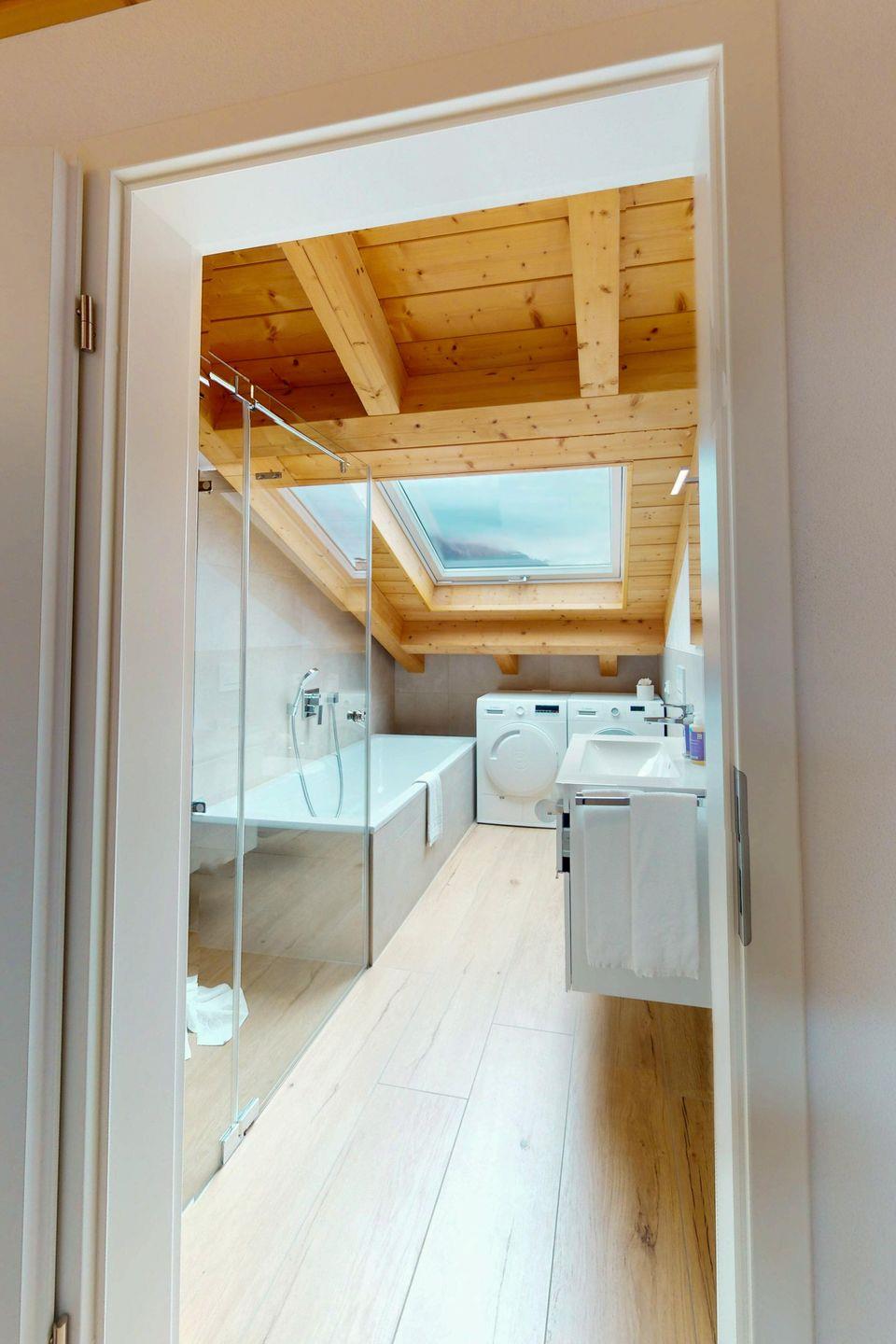 Im zweiten Schlafzimmer, umgeben von Zirbenholz-Möbeln und ebenfalls mit Fernseher ausgestattet, finden Sie ein gemütliches Doppelbett. Gegenüber befindet sich ein zweites Bad mit ebenerdiger Dusch und zusätzlicher Badewanne. Eine Waschmaschine und ein Trockner stehen Ihnen ebenfalls zur Verfügung und sorge für zusätzlichen Komfort und Flexibilität.