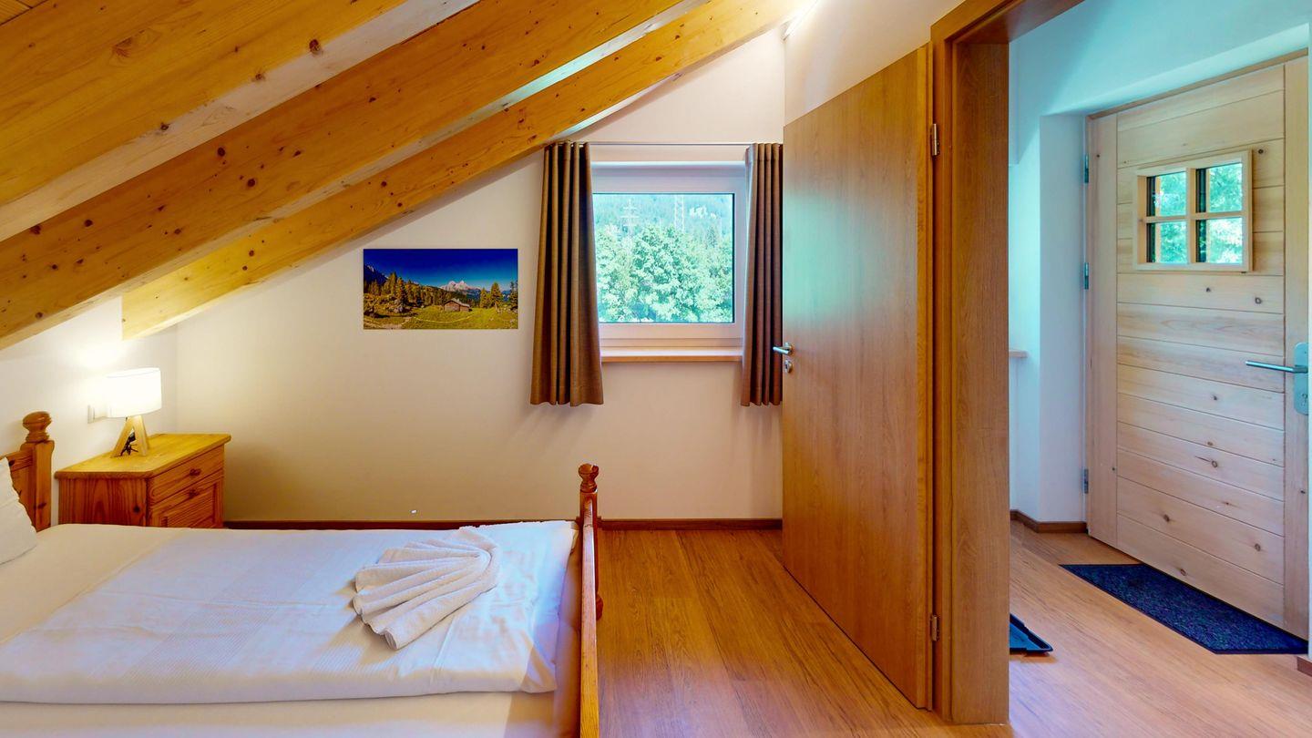 Das Schlafzimmer ist ein behaglicher Rückzugsort mit warmen Holzelementen und einer charmanten Dachschräge, die dem Raum alpinen Charakter und eine gemütliche Atmosphäre verleiht.