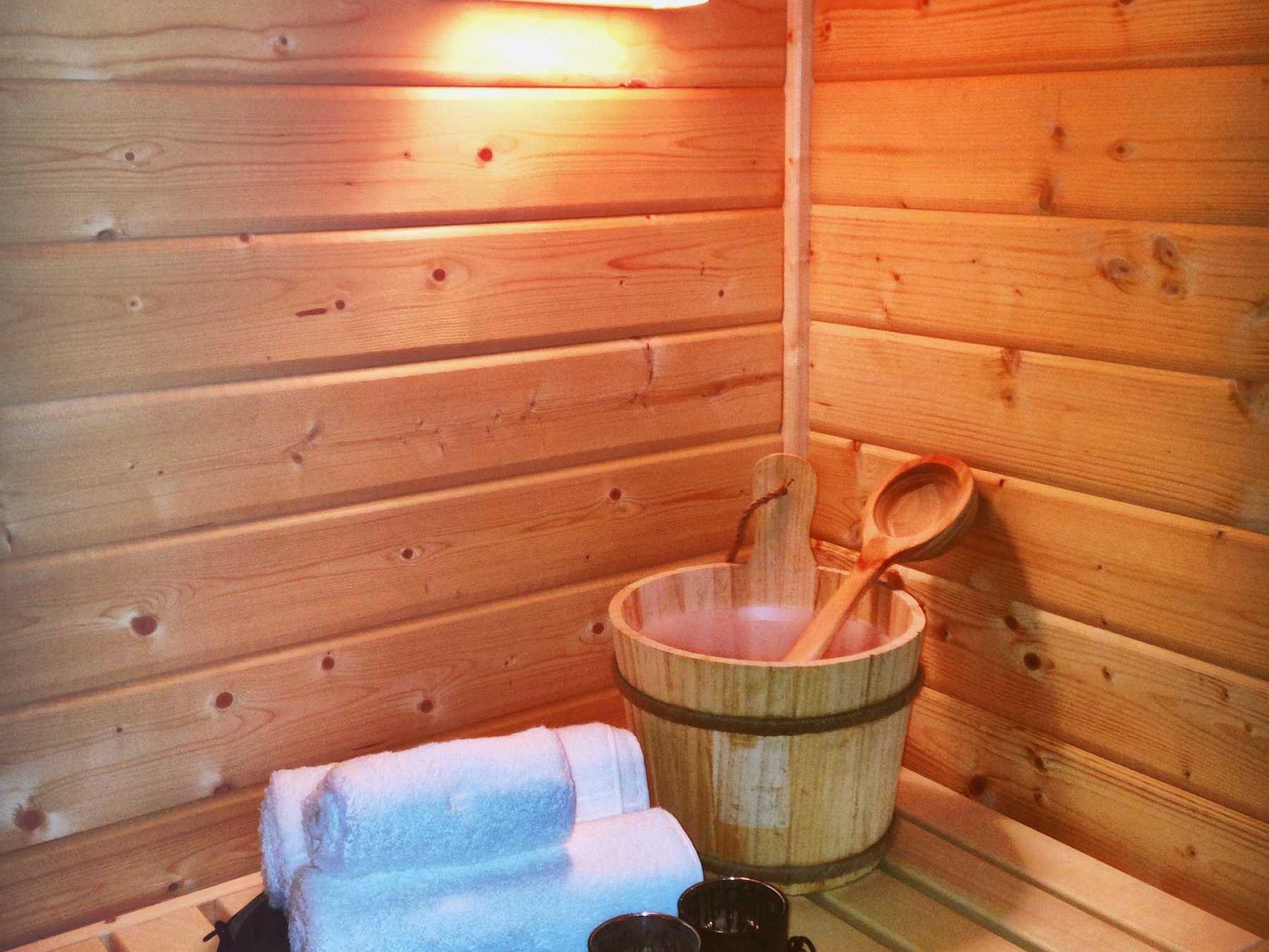 Für gemütliche Stunden an kalten Tagen, bietet eine Außensauna ausreichend Raum. Im Garten befindet sich ein Grill sowie Kinderspielgeräte (Rutsche, Schaukeln).