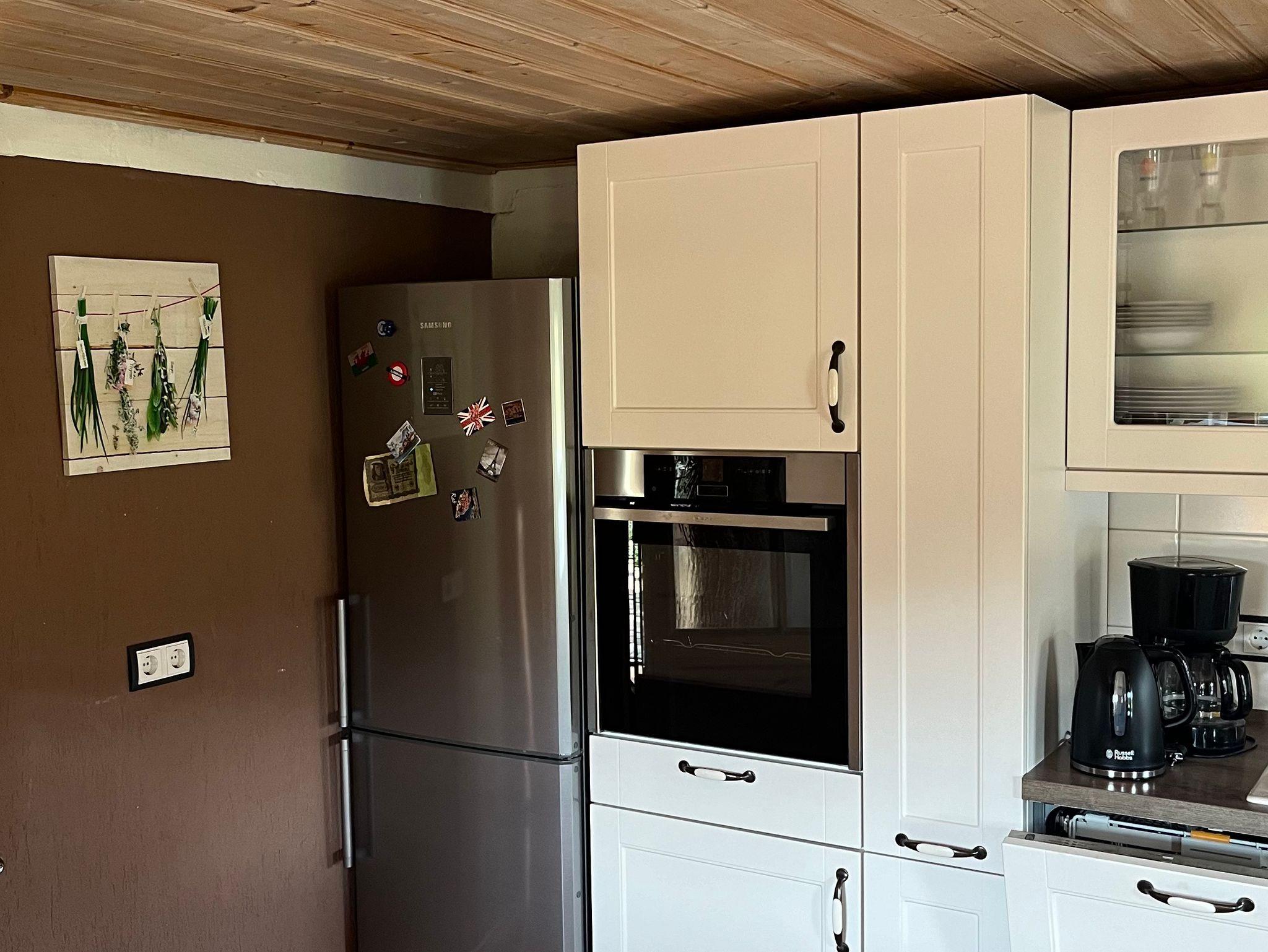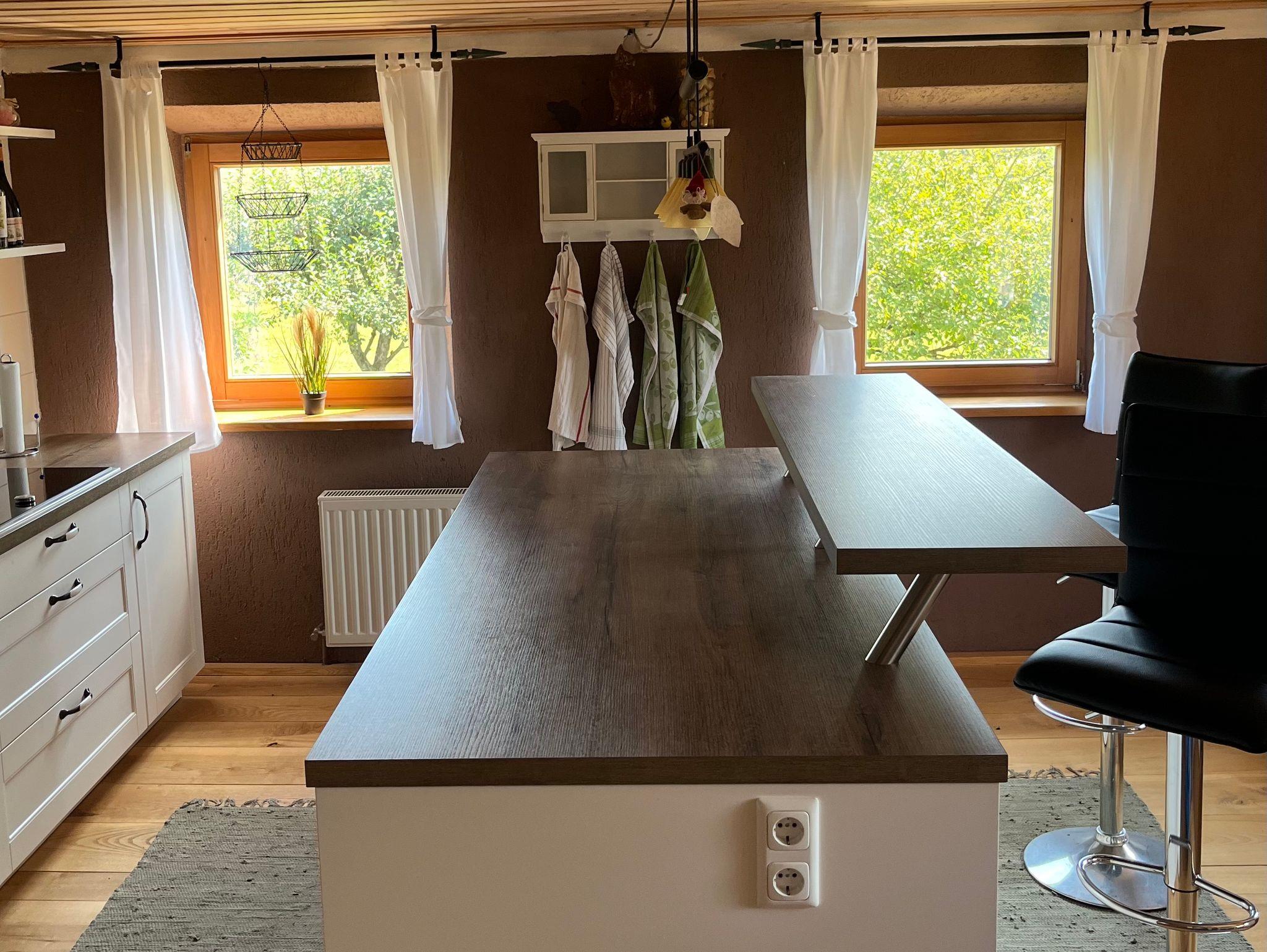 In der Küche befindet sich ein Induktions-Kochfeld, Geschirrspüler, Wasserkocher, Toaster Mikrowelle und ein schöner Esstisch.