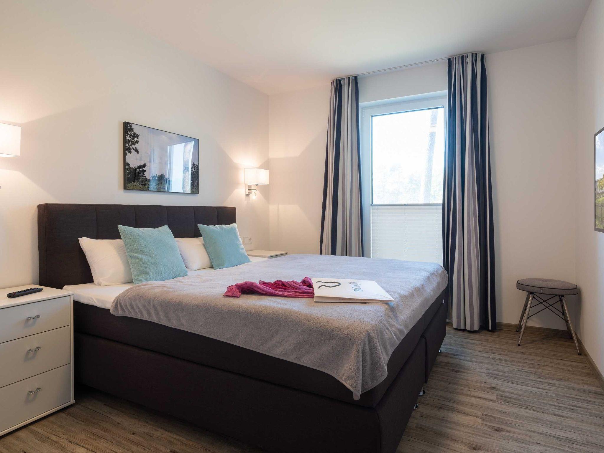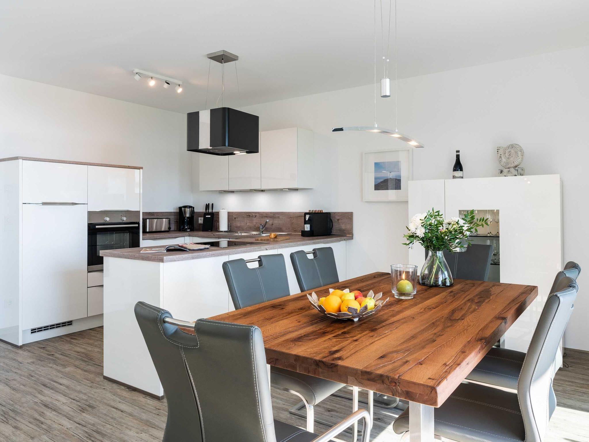 Diese luxuriöse 4-Zimmer-Wohnung im Erdgeschoss von Haus 4 mit Platz für maximal 6 Personen sowie einem Kleinkind bis 2 Jahre im Babybett verfügt über eine Wohnfläche von 119 m² und hat 3 Schlafzimmer sowie 2 voll ausgestattete Duschbäder. Die große Sonnenterrasse mit 21 m² liegt in idealer Süd-Ausrichtung. Die Wohnung ist modern eingerichtet mit offenem Wohn-Essbereich, großem Esstisch, Ledersofa sowie Smart-TV (inkl. Sky-Abo). Die hochwertig ausgestattete Küche, offen zum Wohnbereich, lässt keine Wünsche offen. Erholsamer Schlaf in den beiden Schlafzimmern mit Boxspringbetten und Smart-TV ist garantiert. Im dritten Schlafzimmer befindet sich ein bequemes Schlafsofa (Liegefläche: 1,80 x 2,00 m) und ein Smart-TV. Das Badezimmer en Suite ist mit einer begehbaren Dusche ausgestattet. Auf der großen, überdachten Sonnenterrasse mit Essgruppe und jeweils zwei Relax-Sesseln, Fußhockern, Sonnenschirm und Sonnenliegen können Sie die Seele baumeln lassen.