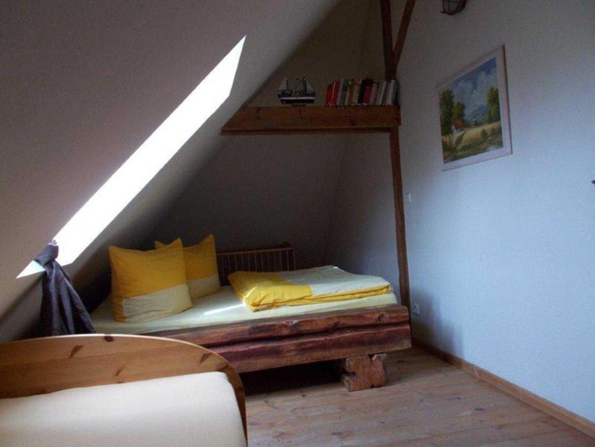 Zum Obergeschoss führt eine rustikale Holztreppe. Im oberen Bereich befinden sich zwei getrennte Schlafzimmer mit Doppelbetten und einmal einem Einzelbett ( 90x200, 160 x 200, 180 x 200 )sowie Nachtisch mit Leselampe und Kleiderschrank. Für einen 6. Gast kann im unteren Wohnbereich eine Lige als Aufbettung bereit gestellt werden. Bettwäsche und Handtücher können dazu gebucht werden.