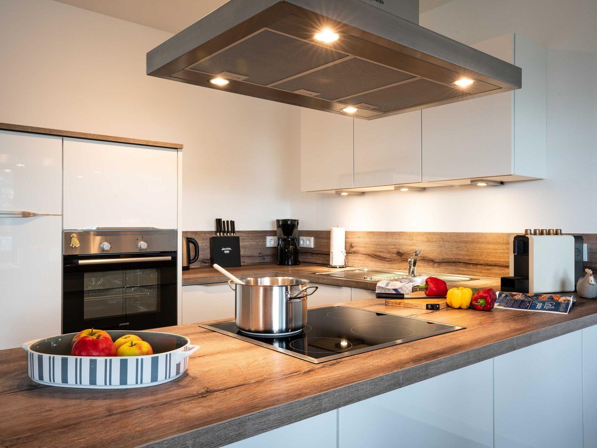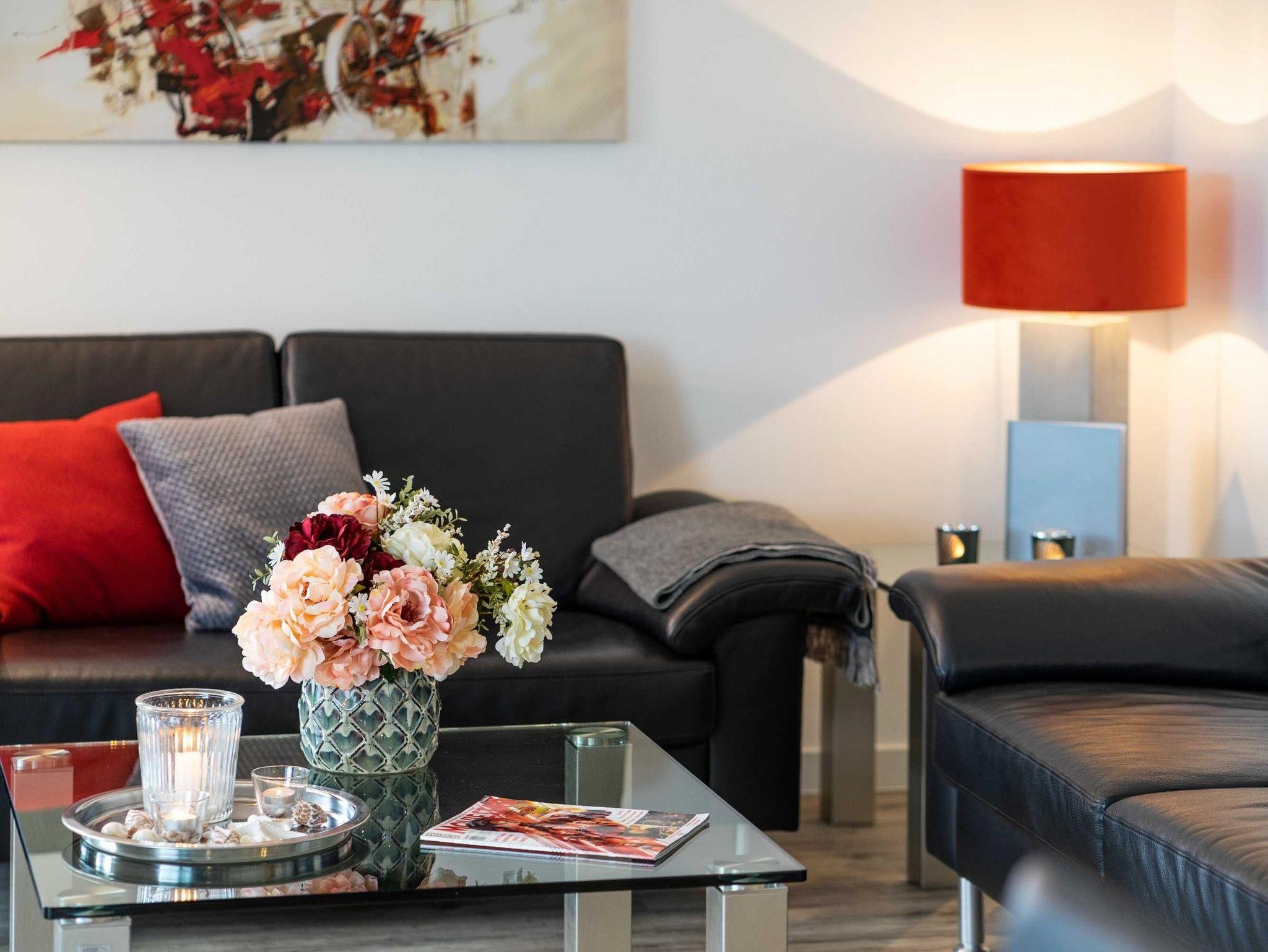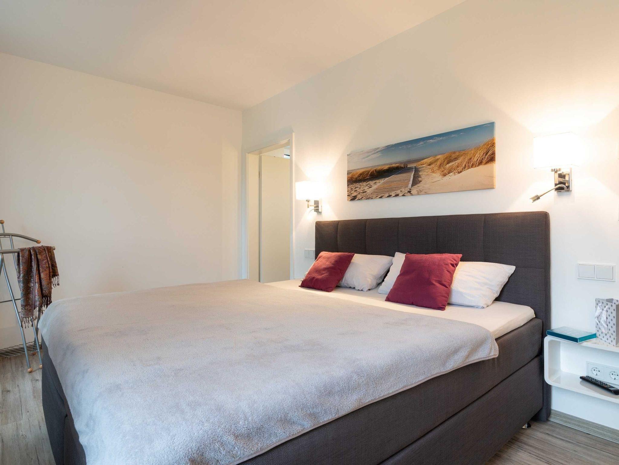Diese lichtdurchflutete, helle 3-Zimmer-Wohnung im obersten Geschoss von Haus 2 (Aufzug vorhanden) mit Platz für maximal 4 Personen sowie einem Kleinkind bis 2 Jahre im Babybett verfügt über eine Wohnfläche von 94 m² und hat 2 Schlafzimmer sowie 2 voll ausgestattete Duschbäder. Die große Sonnenterrasse mit 17 m² liegt in idealer Süd-Ausrichtung. Die Wohnung ist modern eingerichtet mit offenem Wohn-Essbereich, großem Esstisch, Ledersofa sowie Flat-TV (inkl. Sky-Abo). Die hochwertig ausgestattete Küche, offen zum Wohnbereich, lässt keine Wünsche offen. Erholsamer Schlaf in den beiden Schlafzimmern mit Boxspringbetten und Flat-TV ist garantiert. Das Badezimmer en Suite ist mit einer begehbaren Dusche ausgestattet. Auf dem großen, überdachten Sonnenbalkon mit Essgruppe und zwei Relax-Sesseln, Fußhockern sowie einem Sonnenschirm können Sie die Seele baumeln lassen.