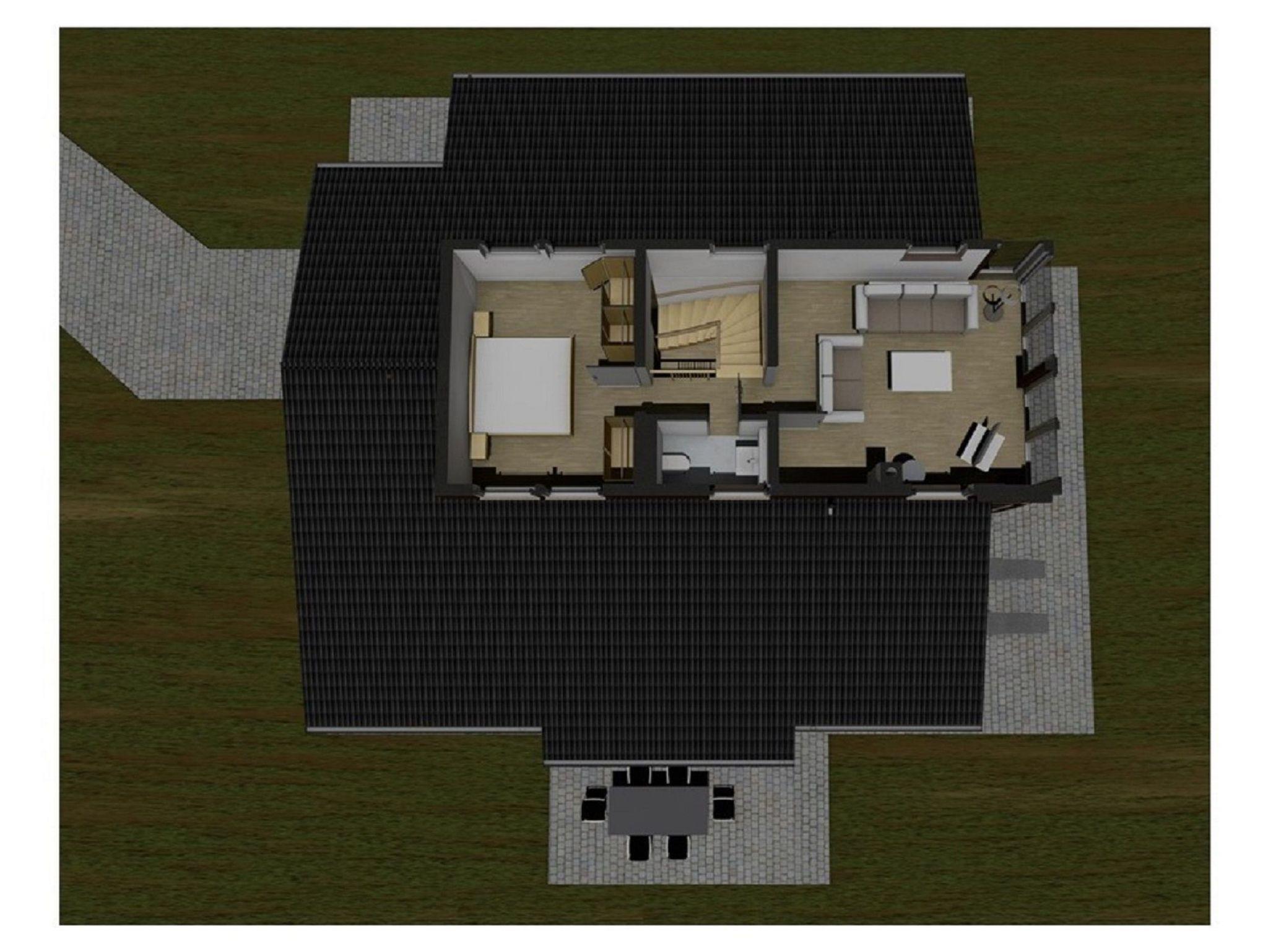 Über die schöne Holztreppe erreichen Sie das Obergeschoss. Hier steht Ihnen ein weiteres Wohnzimmer zur Verfügung. Der großartige Blick auf das Haff durch die bodentiefen Fenster wird Sie jeden Tag verzaubern. Im Obergeschoss befindet sich das zweite Schlafzimmer mit Doppelbett (1,80 x 2,00 m) sowie ein WC.