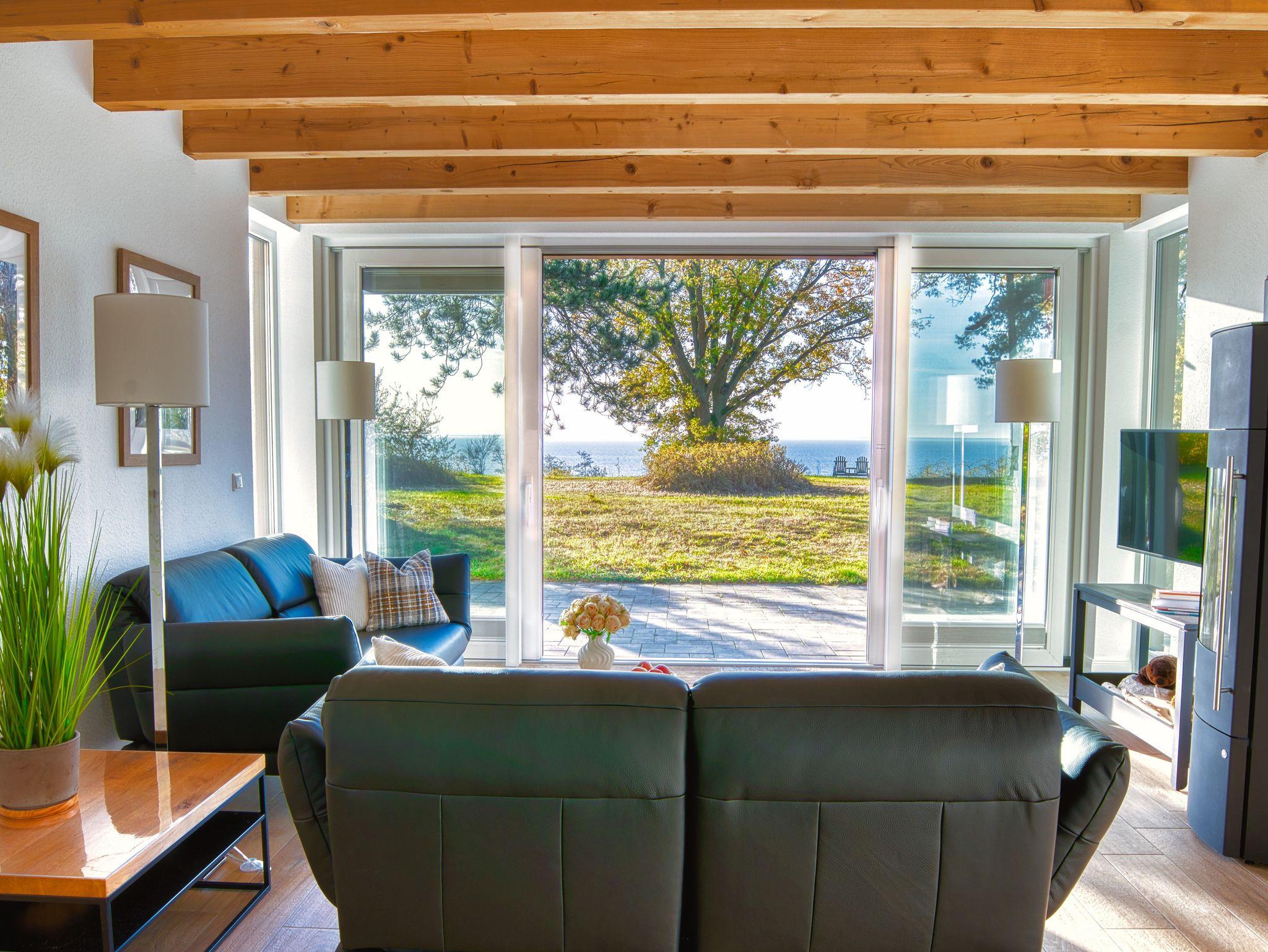 Erleben Sie Natur pur im 5-Sterne-Ferienhaus Biberburg mit Panoramablick auf das Haff und moderner Ausstattung.
