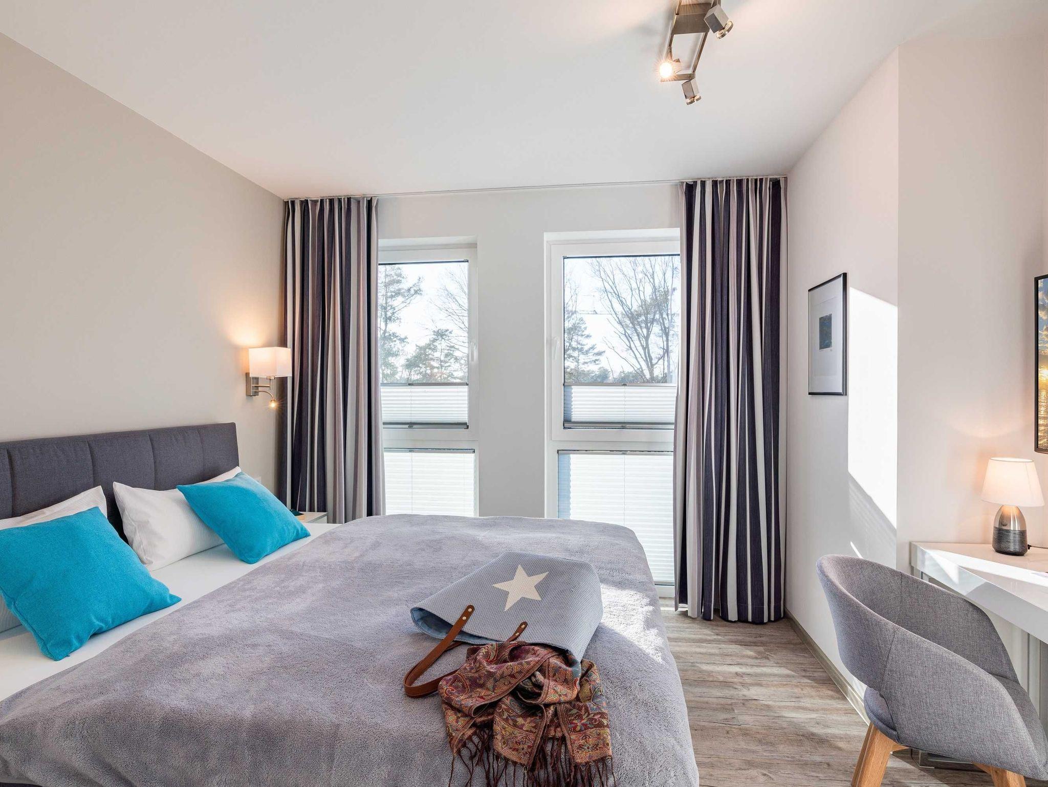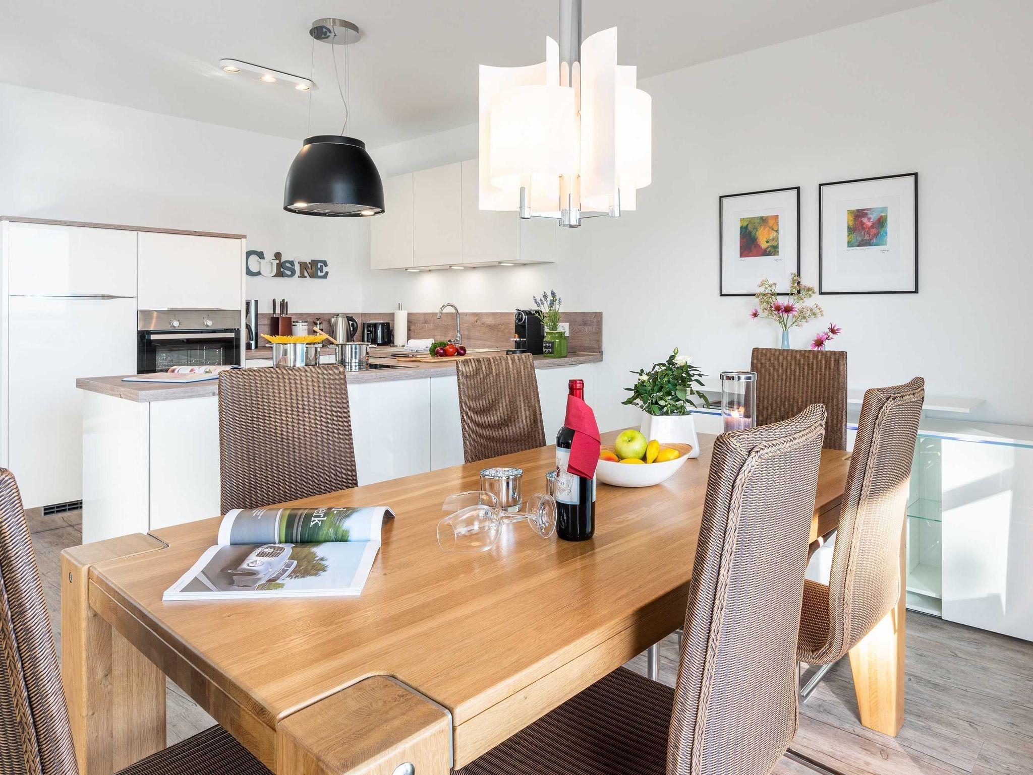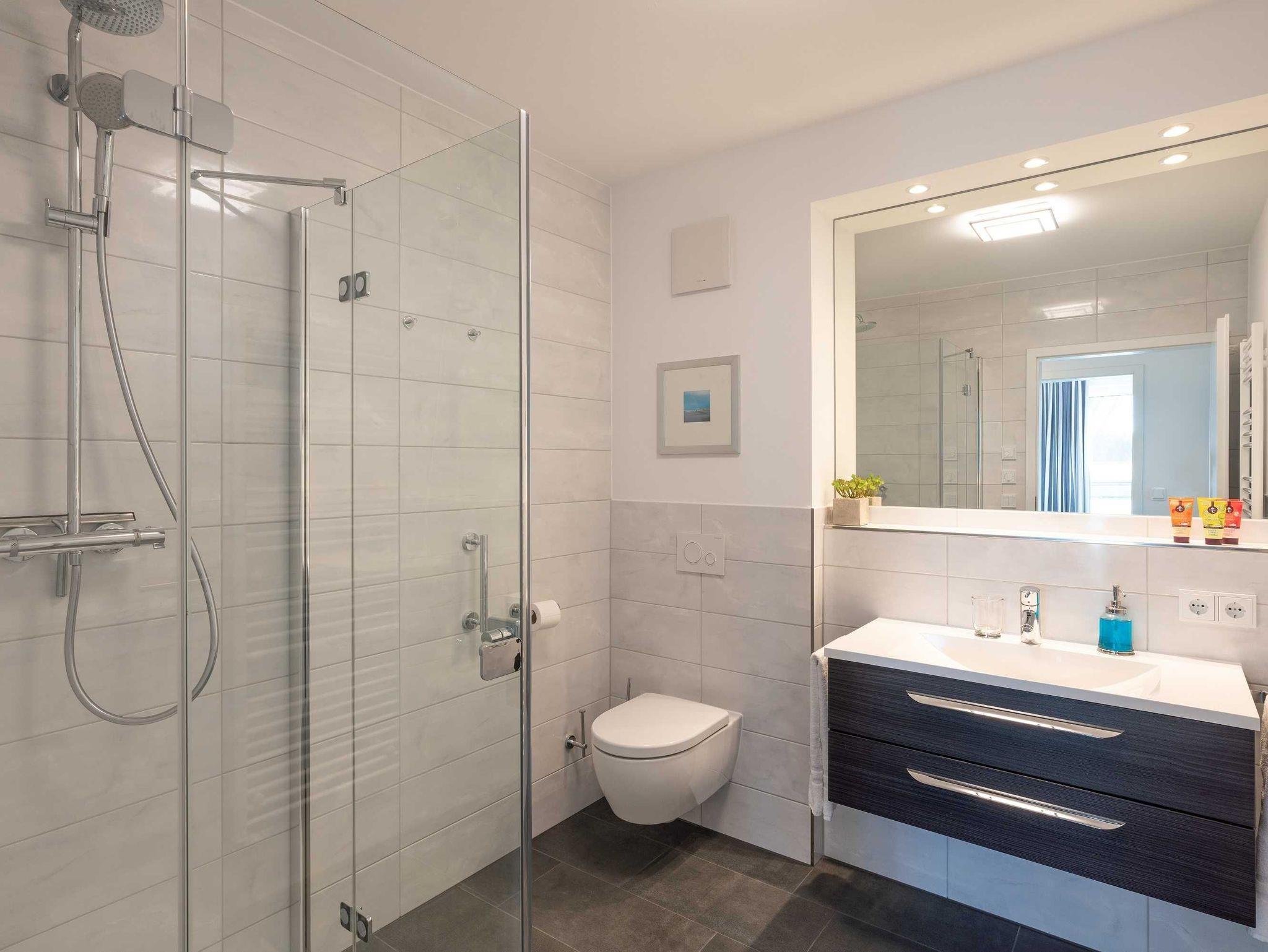 Diese lichtdurchflutete, helle 4-Zimmer-Wohnung im obersten Geschoss von Haus 7 (Aufzug vorhanden) mit Platz für maximal 6 Personen verfügt über eine Wohnfläche von 100 m² und hat 3 Schlafzimmer sowie 2 voll ausgestattete Duschbäder. Die große Sonnenterrasse mit 17 m² liegt in idealer Süd-Ausrichtung. Die Wohnung ist modern eingerichtet mit offenem Wohn-Essbereich, großem Esstisch, Ledersofa sowie Smart-TV (inkl. Sky-Abo). Die hochwertig ausgestattete Küche, offen zum Wohnbereich, lässt keine Wünsche offen. Erholsamer Schlaf in den beiden Schlafzimmern mit Boxspringbetten und Smart-TV ist garantiert. Im dritten Schlafzimmer befindet sich ein bequemes Schlafsofa (Liegefläche: 1,60 x 2,00 m) und ein Smart-TV. Das Badezimmer en Suite ist mit einer begehbaren Dusche ausgestattet. Auf dem großen, überdachten Sonnenbalkon mit Essgruppe und zwei Relax-Sesseln, Fußhockern sowie einem Sonnenschirm können Sie die Seele baumeln lassen.