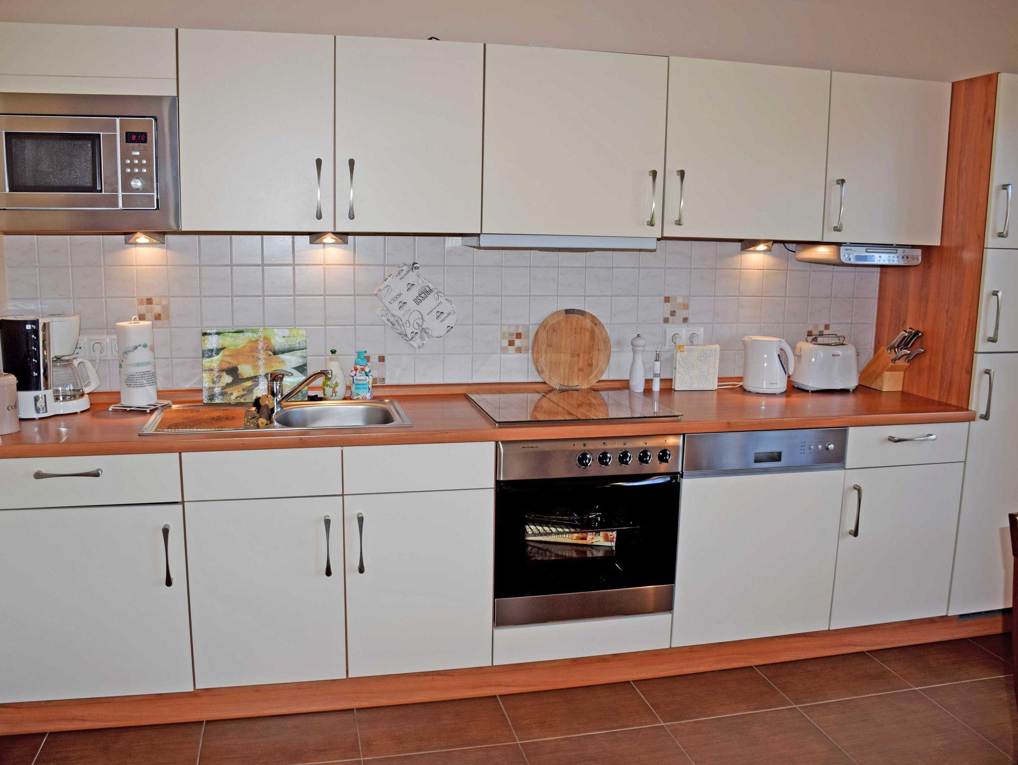 Die offene Küche ist mit Ceran-Herd, Backofen, Geschirrspüler, Kühlschrank, Mikrowelle, Kaffeemaschine, Wasserkocher und weiterem umfangreichem Zubehör komplett eingerichtet.