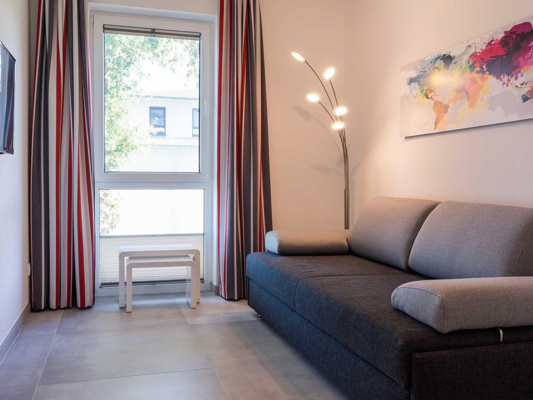 Schöne Ferienappartements, hochwertig ausgestattet im modernen Einrichtungsstil mit Terrassen auf ganzer Appartementbreite, bieten einen wunderschönen Blick auf das direkt vor uns gelegene Stettiner Haff. Erleben Sie die Sonne über dem Wasser vom Aufgehen bis zum Untergehen. Die funkelnden Wassersterne werden Sie entzücken.