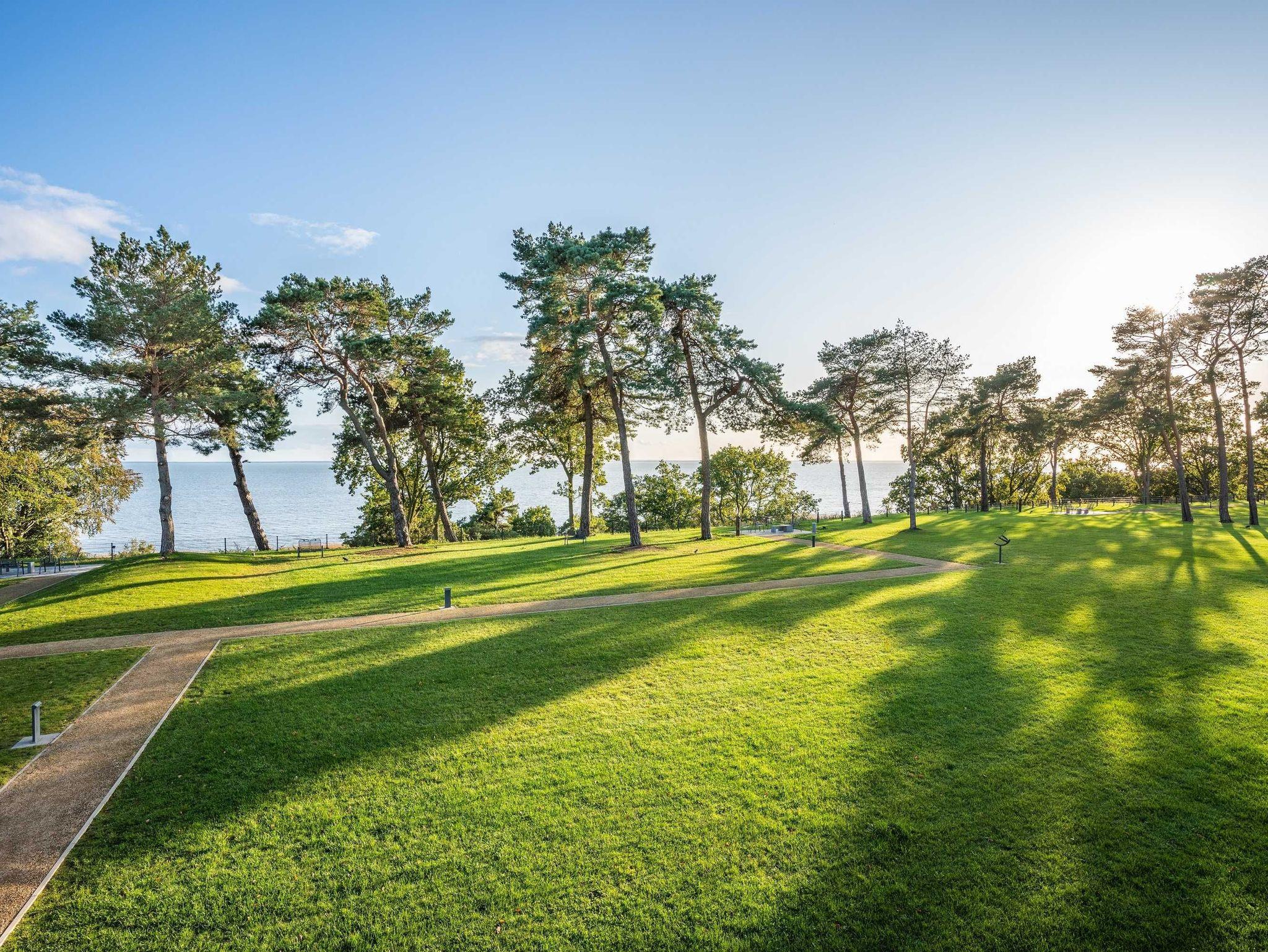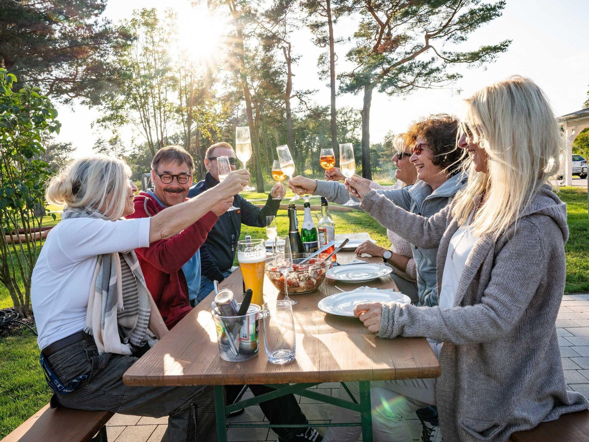 Unsere sieben Ferienhäuser sind auf die Haffküste ausgerichtet. Sie stehen auf einer weitflächigen Außenanlage, umgeben von ebenen Rasenflächen und angelegten Gehwegen, zueinander. Unsere Anlage erstreckt sich bis direkt an die Steilküste, an der einzelne Sitzgruppen mit einem endlosen Blick über das Haff zum Entspannen einladen.