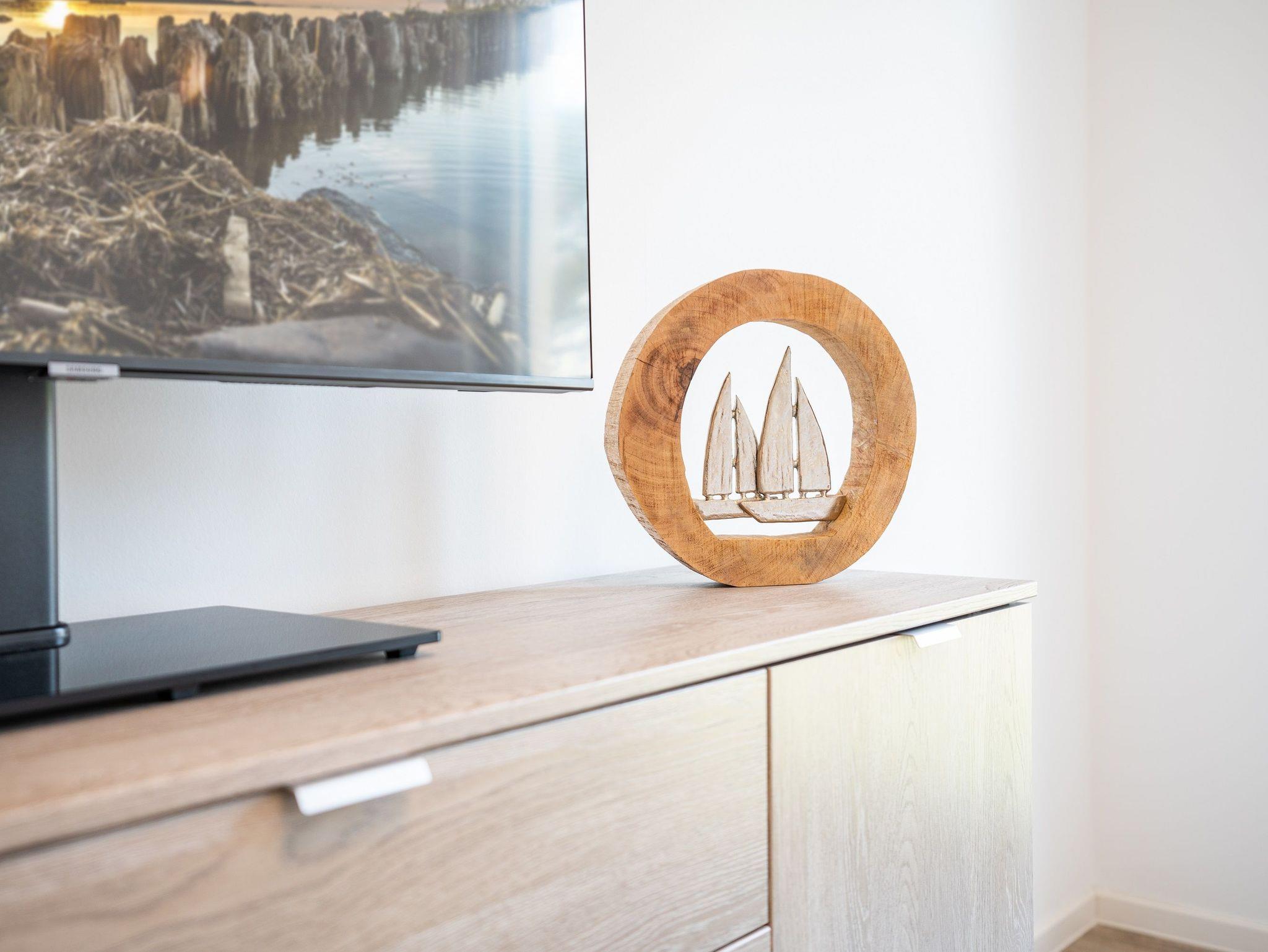 Der offen gestaltete Wohnbereich ist mit einem komfortablen Sofa und zwei Sesseln sowie Smart-TV ausgestattet. Sie haben vom Wohnzimmer aus Zugang zum Südost-Balkon. Der möblierte Balkon mit traumhaften Ausblicken auf das Stettiner Haff bietet auch aus der zweiten Reihe einen wunderschönen Ort, um Ihre Mahlzeiten zu genießen und die Aussicht zu bewundern.