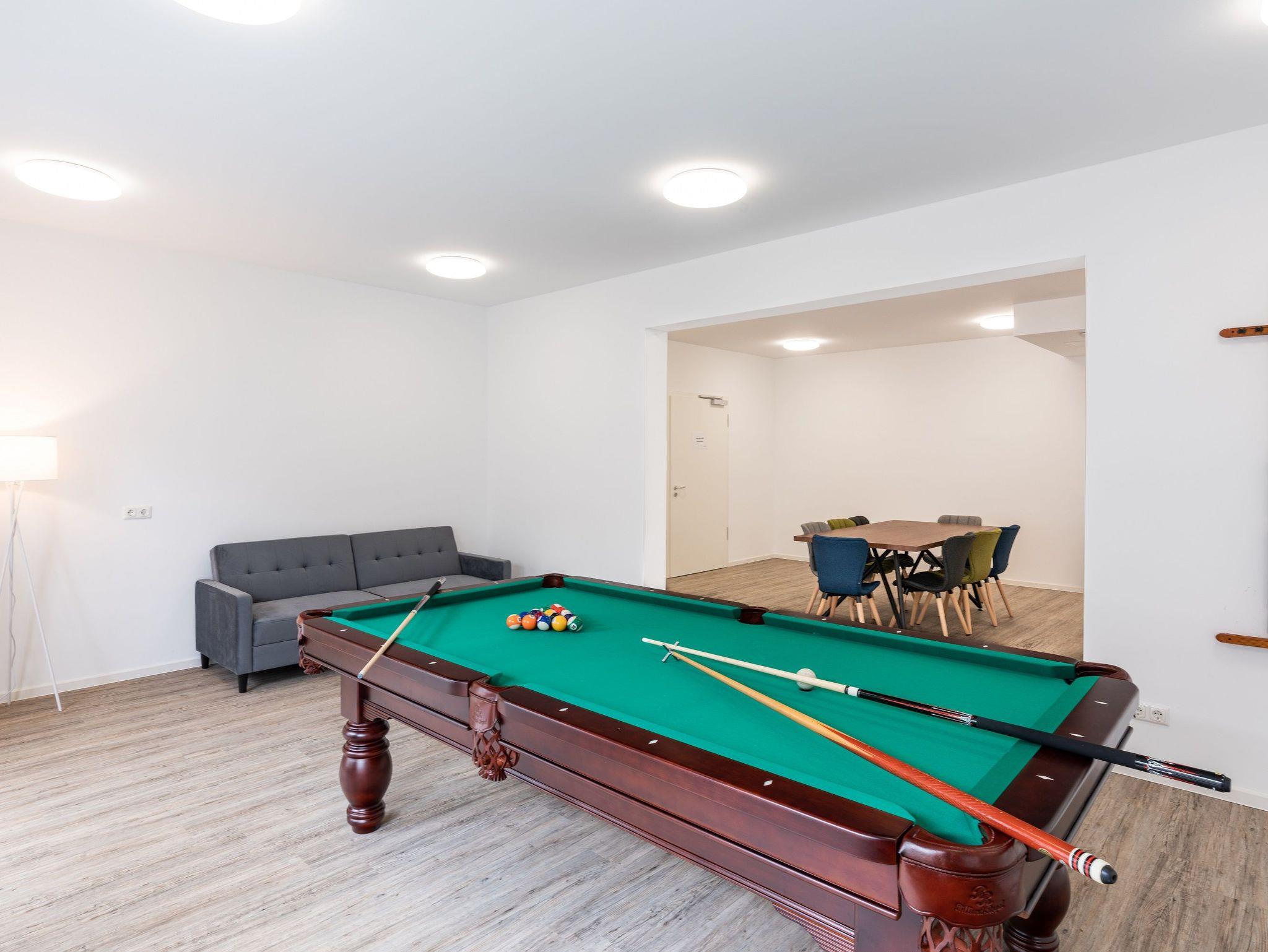 Ihre Kinder dürfen sich auf den vielseitig gestalteten Freizeitbereich (390 m²) im Souterrain mit Tischtennis, Kickertisch, Schachbrett und Spielezimmer freuen, der selbst an Schlechtwettertagen keine Langeweile aufkommen lässt. Erwachsene finden am Billardtisch oder in der gemütlichen Lounge-Ecke Ausgleich mit einem guten Buch oder Musik im Ohr.