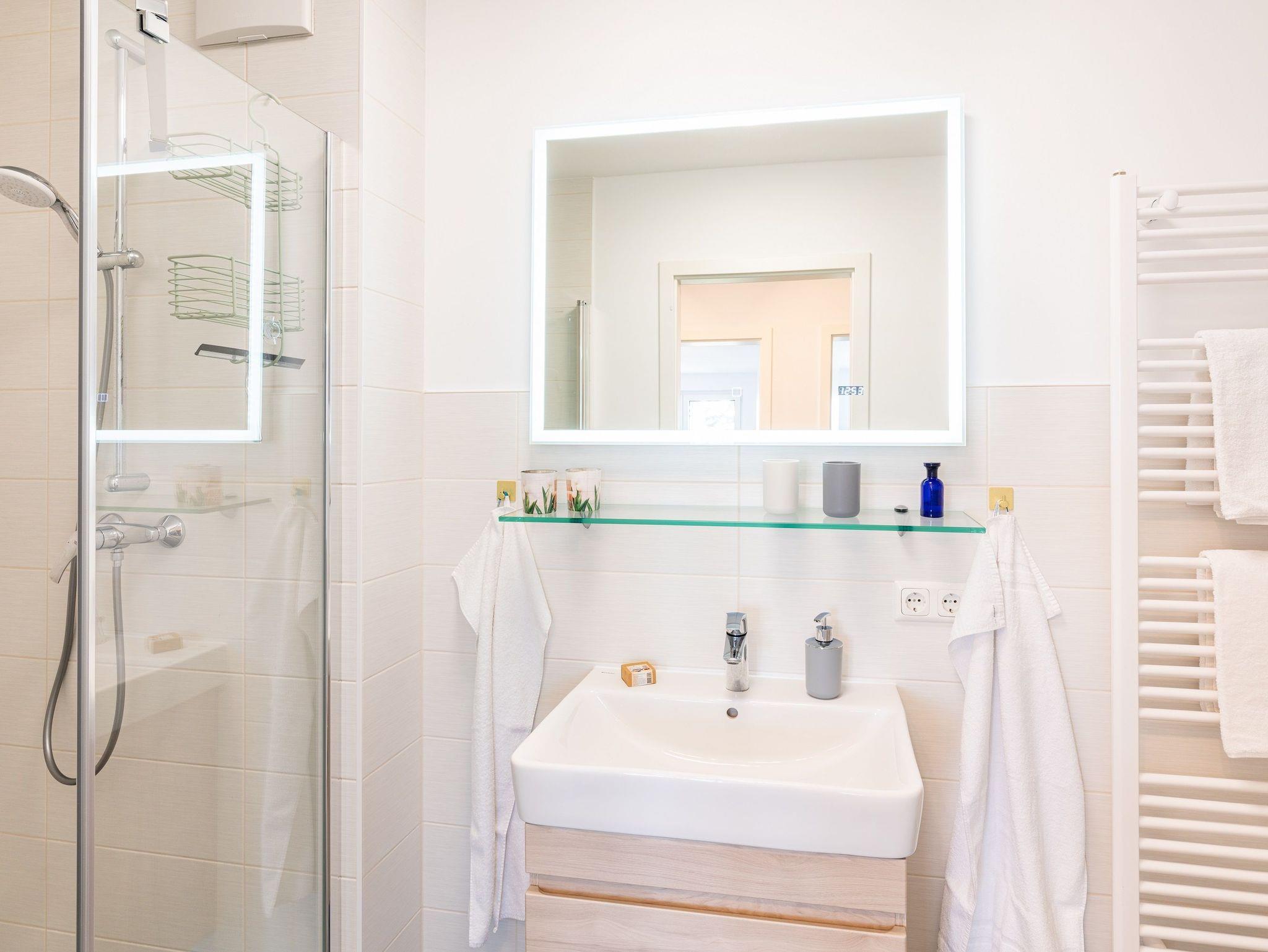 Die beiden vollausgestatteten Badezimmer verfügen jeweils über eine ebenerdige Dusche, WC, Waschtischanlage sowie Fön.