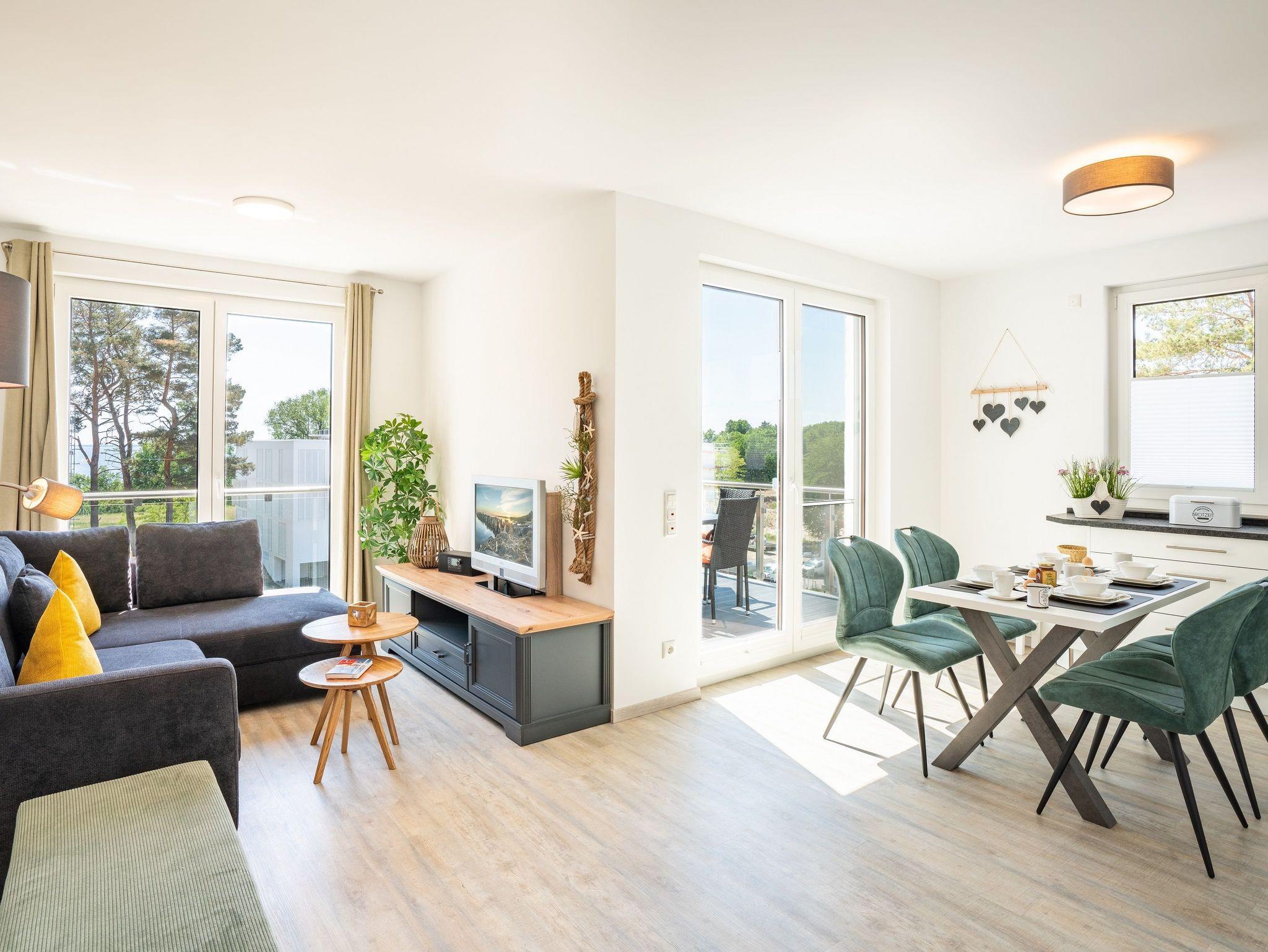 Auf einer Wohnfläche von 61 m² finden drei Erwachsene und ein Kleinkind bis zwei Jahre (im Babybett) in dieser modern eingerichteten Ferienwohnung ausreichend Platz für einen entspannten Urlaub am Stettiner Haff auf Usedom.
