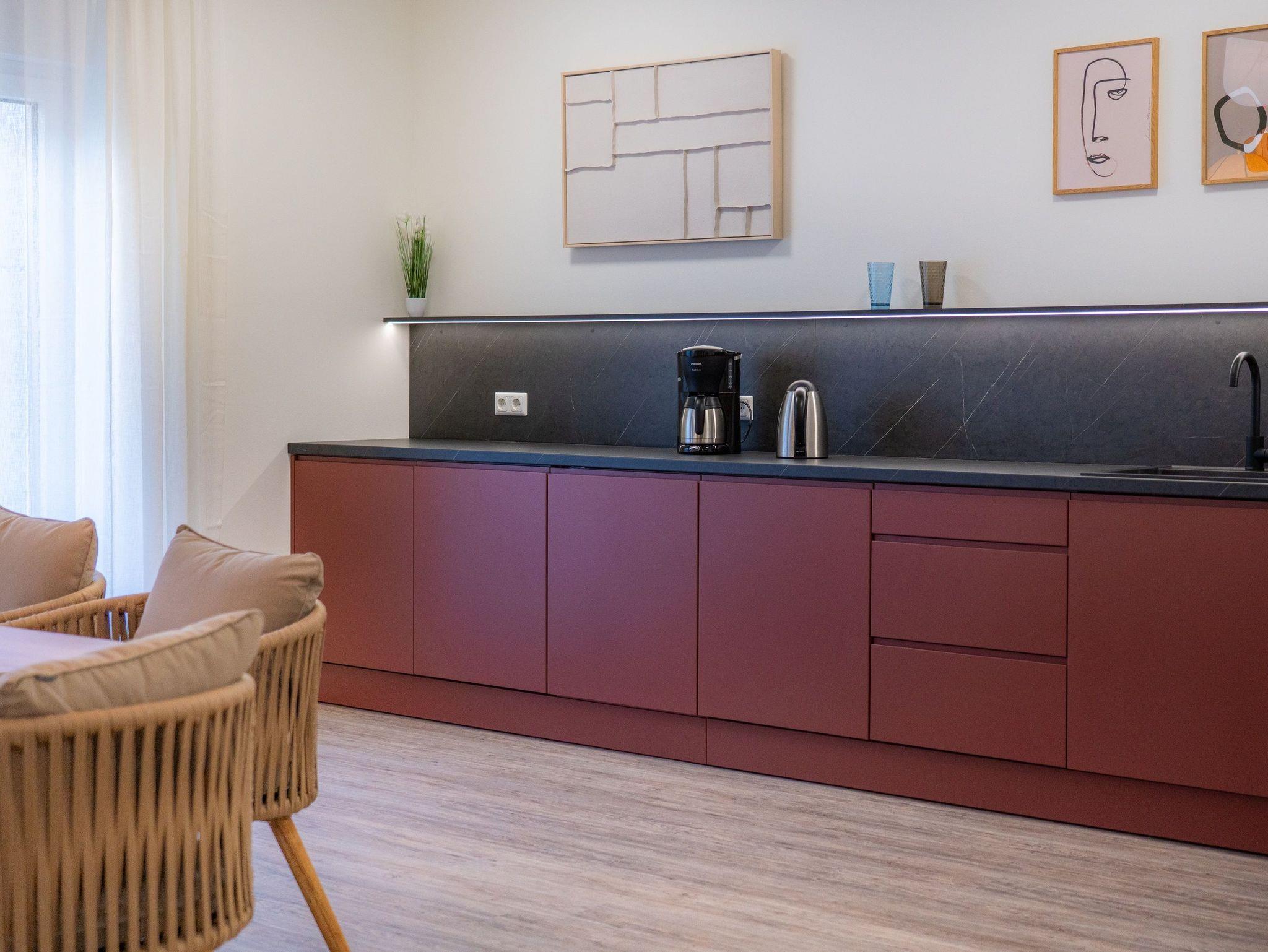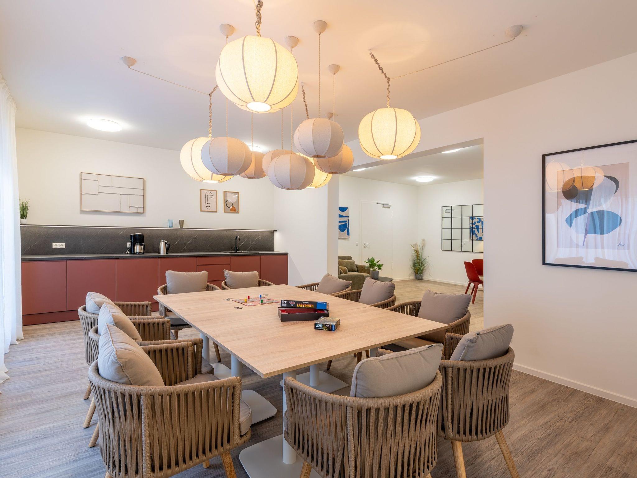 In einer einladenden Ecke im geräumigen Eingangsbereich des Apartments findet sich ein stilvoller Schreibtisch, der als Arbeitsbereich fungiert.