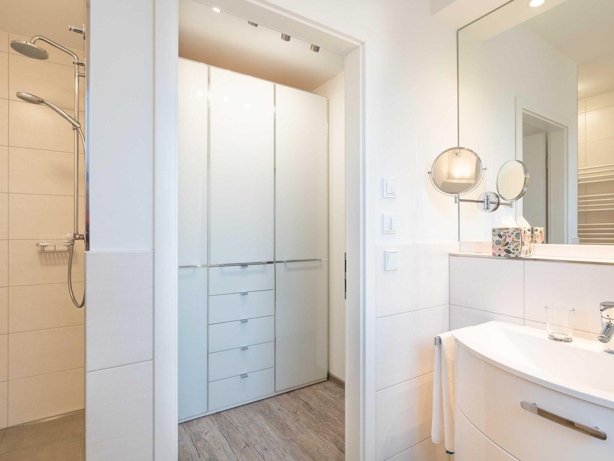 Diese luxuriöse 4-Zimmer-Wohnung im ersten Obergeschoss von Haus 7 (Aufzug vorhanden) mit Platz für maximal 6 Personen verfügt über eine Wohnfläche von 100 m² und hat 3 Schlafzimmer sowie 2 voll ausgestattete Duschbäder. Die große Sonnenterrasse mit 17 m² liegt in idealer Süd-Ausrichtung. Die Wohnung ist modern eingerichtet mit offenem Wohn-Essbereich, großem Esstisch, Ledersofa sowie Smart-TV (inkl. Sky-Abo). Die hochwertig ausgestattete Küche, offen zum Wohnbereich, lässt keine Wünsche offen. Erholsamer Schlaf in den beiden Schlafzimmern mit Boxspringbetten und Smart-TV ist garantiert. Im dritten Schlafzimmer befindet sich ein bequemes Schlafsofa (Liegefläche: 1,60 x 2,00 m) und ein Smart-TV. Das Badezimmer en Suite ist mit einer begehbaren Dusche ausgestattet. Auf dem großen, überdachten Sonnenbalkon mit Essgruppe und zwei Relax-Sesseln, Fußhockern sowie einem Sonnenschirm können Sie die Seele baumeln lassen.
