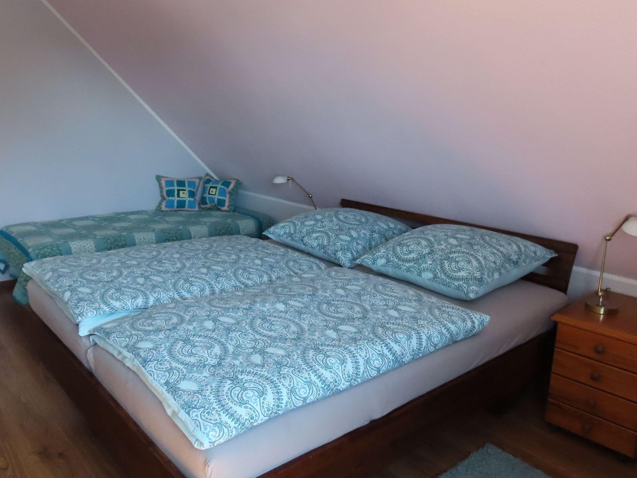 Über eine Treppe erreichen Sie das Obergeschoss. Hier befinden sich 3 weitere Schlafzimmer. Ein Schlafzimmer ist mit einem Doppelbett (1,80 x 2,00 m) sowie einem Einzelbett (0,90 x 2,00 m) ausgestattet. Im dritten Schlafzimmer steht Ihnen ein komfortables Doppelbett (1,60 x 2,00 m) zur Verfügung. Im vierten Schlafzimmer befindet sich eine Schlafsofa (1,80 / 2,00 m). Für Ihren Komfort steht Ihnen im Obergeschoss ein weiteres Tageslichtbad mit Badewanne, Dusche und WC zur Verfügung.