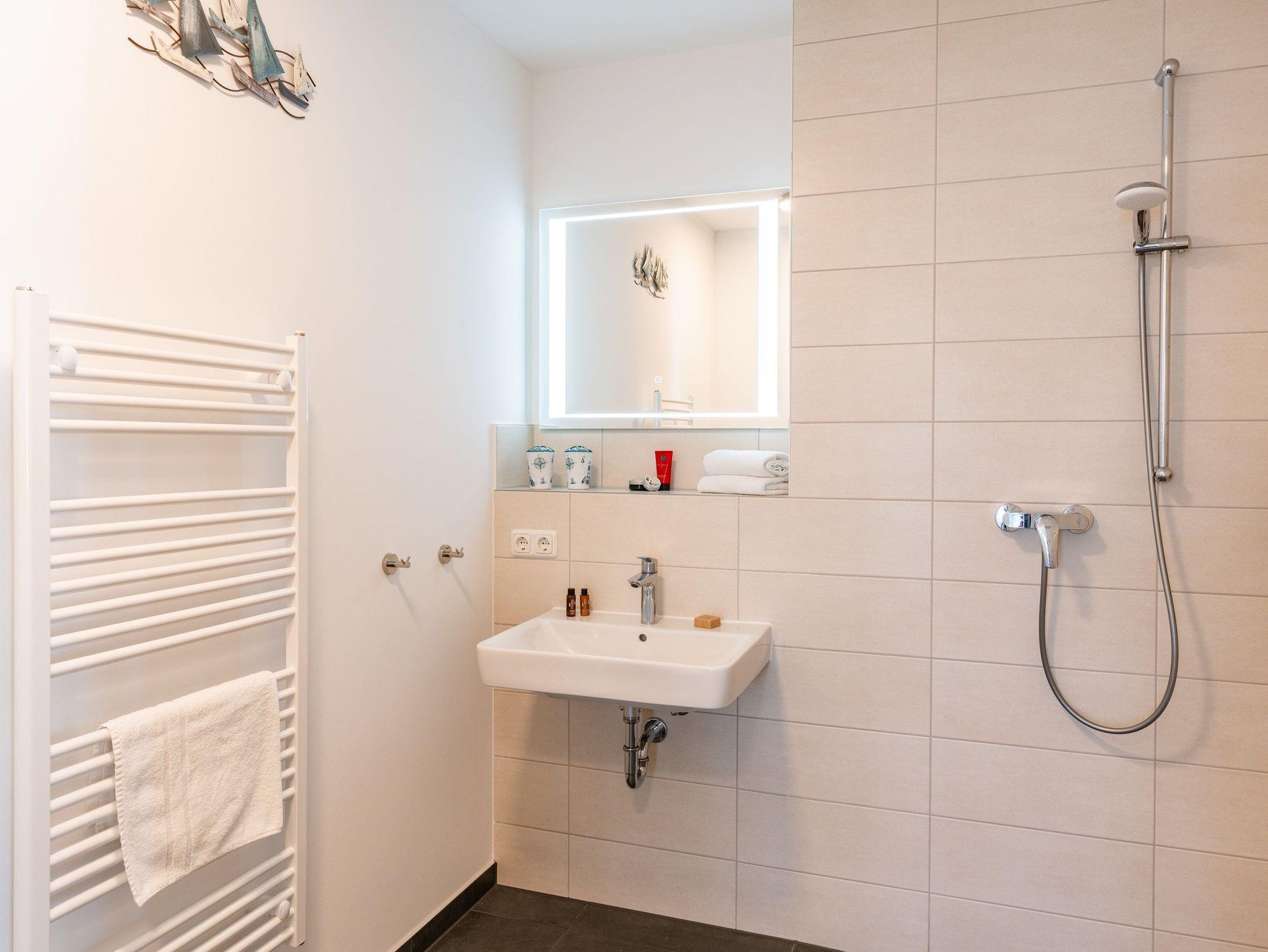 Das vollausgestattete Badezimmer verfügt über eine ebenerdige Dusche, WC, Waschtischanlage sowie Fön.