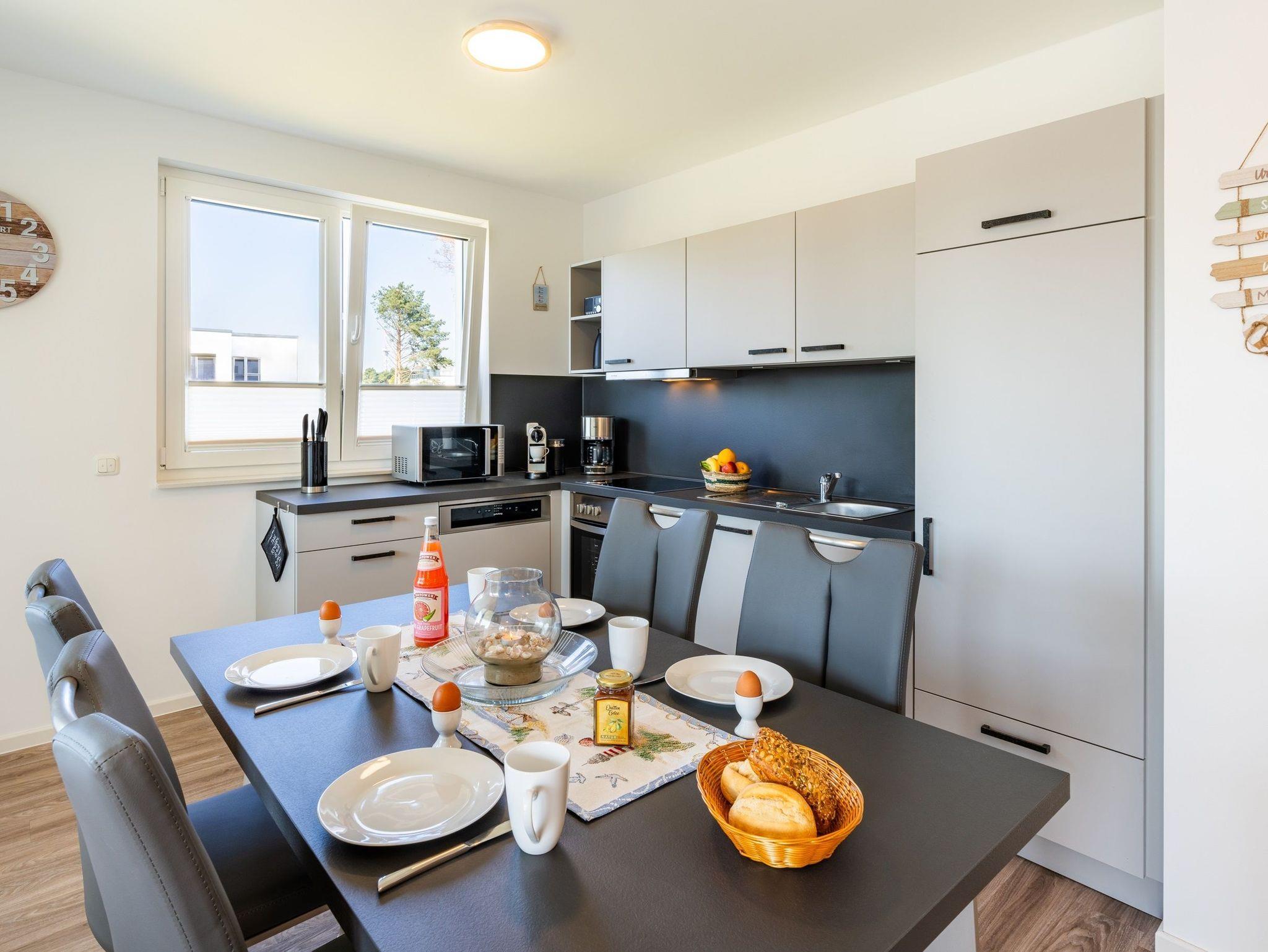 Die Küchenzeile verfügt über hochwertige Geräte wie Herd, Kaffeemaschine, Nespresso-Maschine, Mikrowelle, Backofen, Kühlschrank mit Gefrierfach sowie Spülmaschine. Ausreichend Geschirr, Besteck sowie Töpfe und Pfannen befinden sich in den Schränken. Am Esstisch finden Sie vor einem erholsamen Urlaubstag zu einem gemeinsamen Frühstück zusammen.