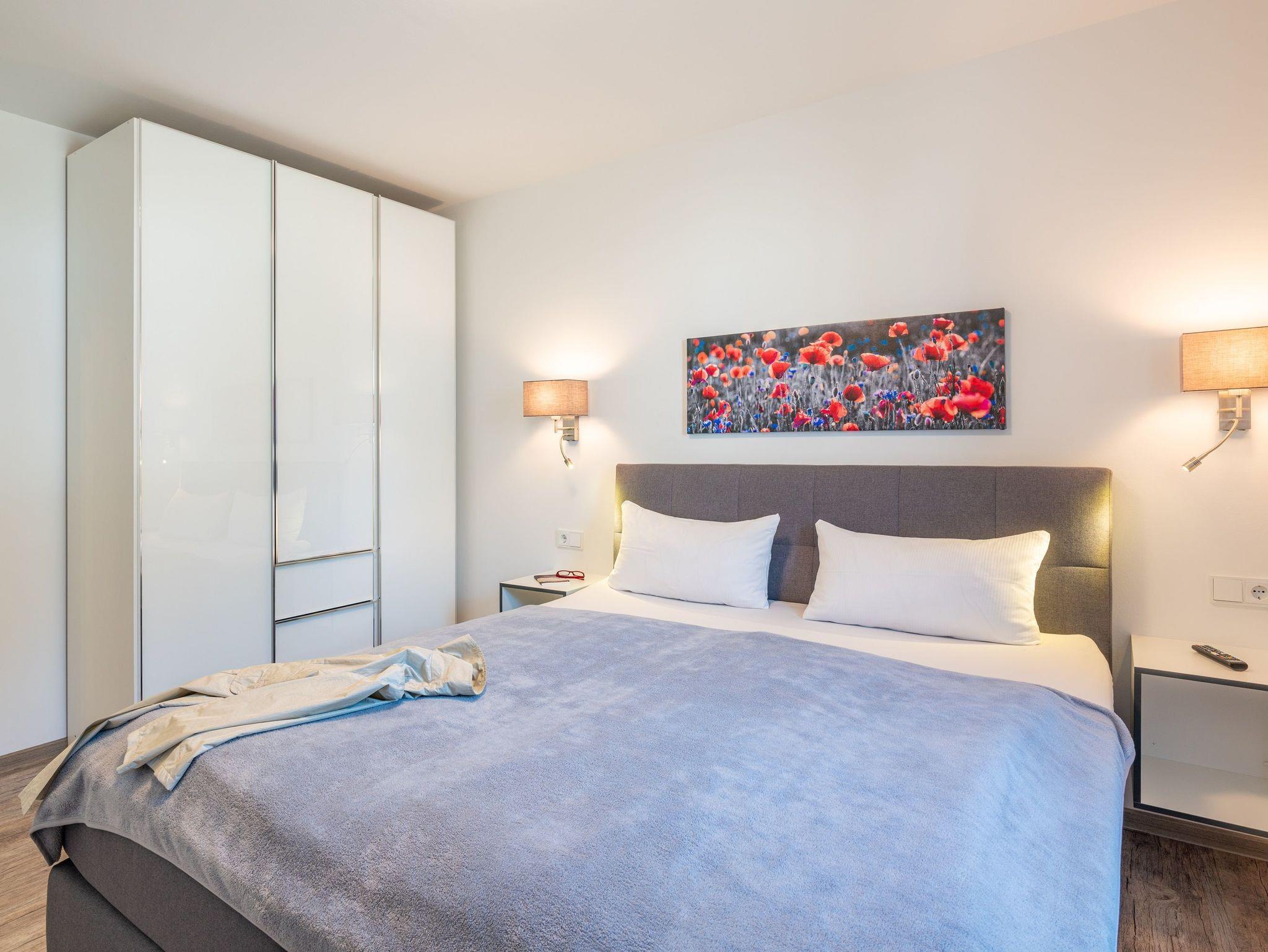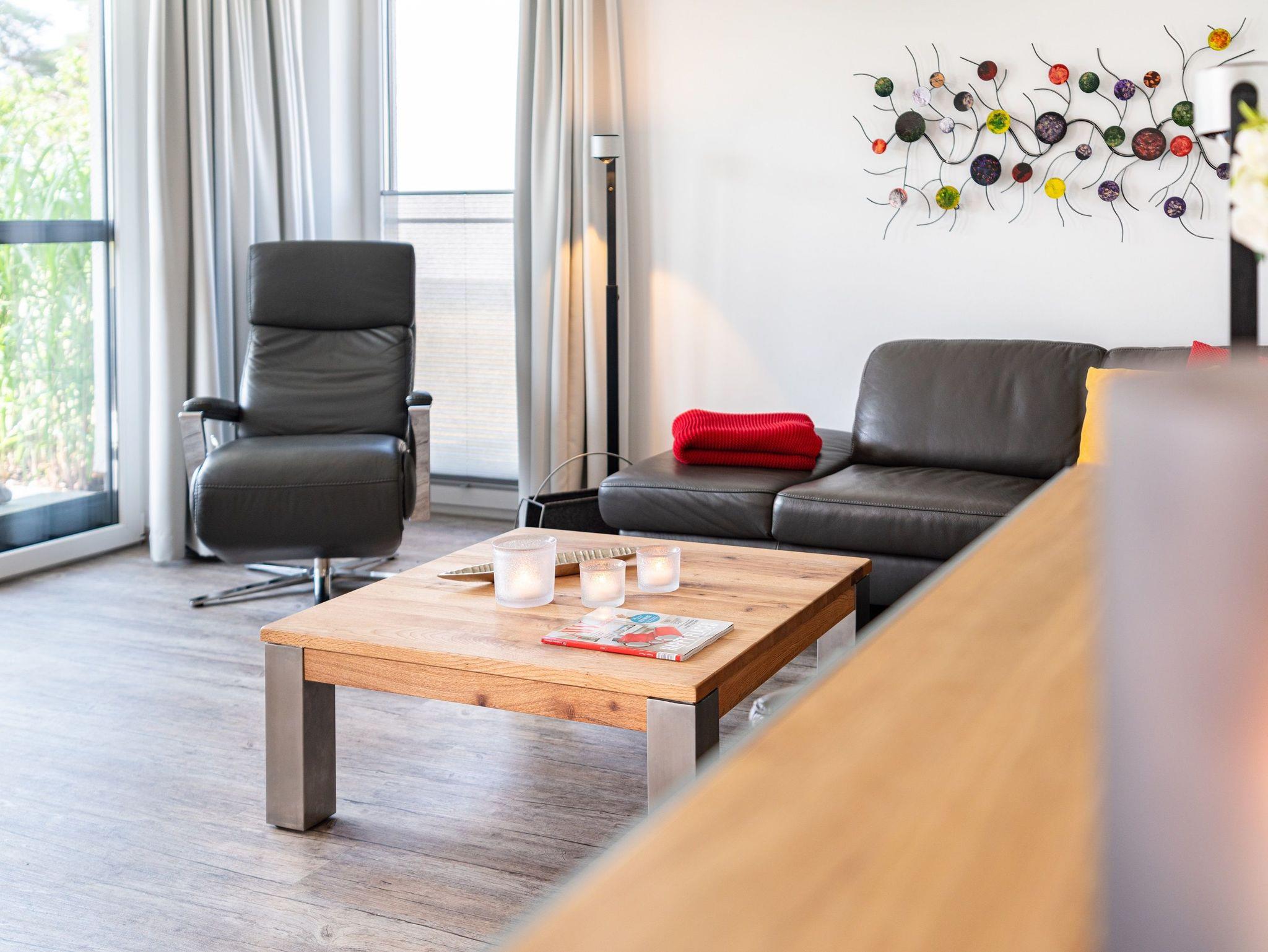 Diese luxuriöse 4-Zimmer-Wohnung im Erdgeschoss von Haus 3 mit Platz für maximal 6 Personen sowie einem Kleinkind bis 2 Jahre im Babybett verfügt über eine Wohnfläche von 119 m² und hat 3 Schlafzimmer sowie 2 voll ausgestattete Duschbäder. Die große Sonnenterrasse mit 21 m² liegt in idealer Süd-Ausrichtung. Die Wohnung ist modern eingerichtet mit offenem Wohn-Essbereich, großem Esstisch, Ledersofa sowie Smart-TV (inkl. Sky-Abo). Die hochwertig ausgestattete Küche, offen zum Wohnbereich, lässt keine Wünsche offen. Erholsamer Schlaf in den beiden Schlafzimmern mit Boxspringbetten (mit 10 cm hohen Füßen) und Smart-TV ist garantiert. Im dritten Schlafzimmer befindet sich ein bequemes Roll-Over-Schlafsofa (Liegefläche: 1,60 x 2,00 m) und ein Smart-TV. Das behindertengerechte Badezimmer en Suite ist mit einer begeh- und befahrbaren Dusche ausgestattet. Es befinden sich in der Dusche und am WC Haltegriffe. Rollstuhlfahrerinnen und Rollstuhlfahrern stehen auf Grund der faltbaren Duschwand ausreichend Wendemöglichkeiten zur Verfügung. In der Dusche ist ein Sitz fest installiert. Der Waschtisch ist unterfahrbar.
