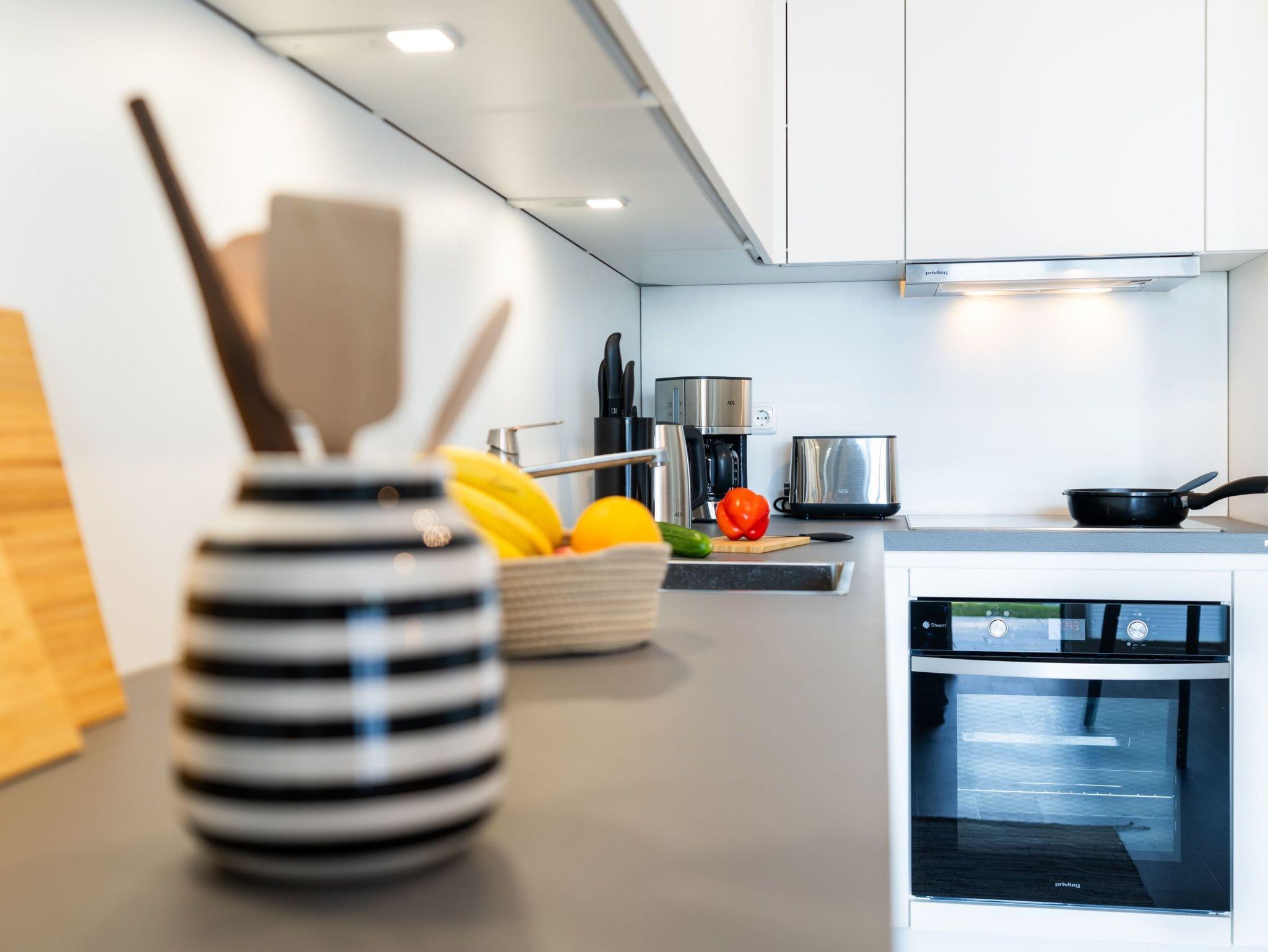Die Küchenzeile verfügt über hochwertige Geräte wie Herd, Kaffeefiltermaschine, Nespresso-Maschine, Handmixer, Milchaufschäumer, Backofen, Kühlschrank mit Gefrierfach sowie Spülmaschine. Ausreichend Geschirr, Besteck sowie Töpfe und Pfannen befinden sich in den Schränken. Am Esstisch finden Sie vor einem erholsamen Urlaubstag zu einem gemeinsamen Frühstück zusammen.