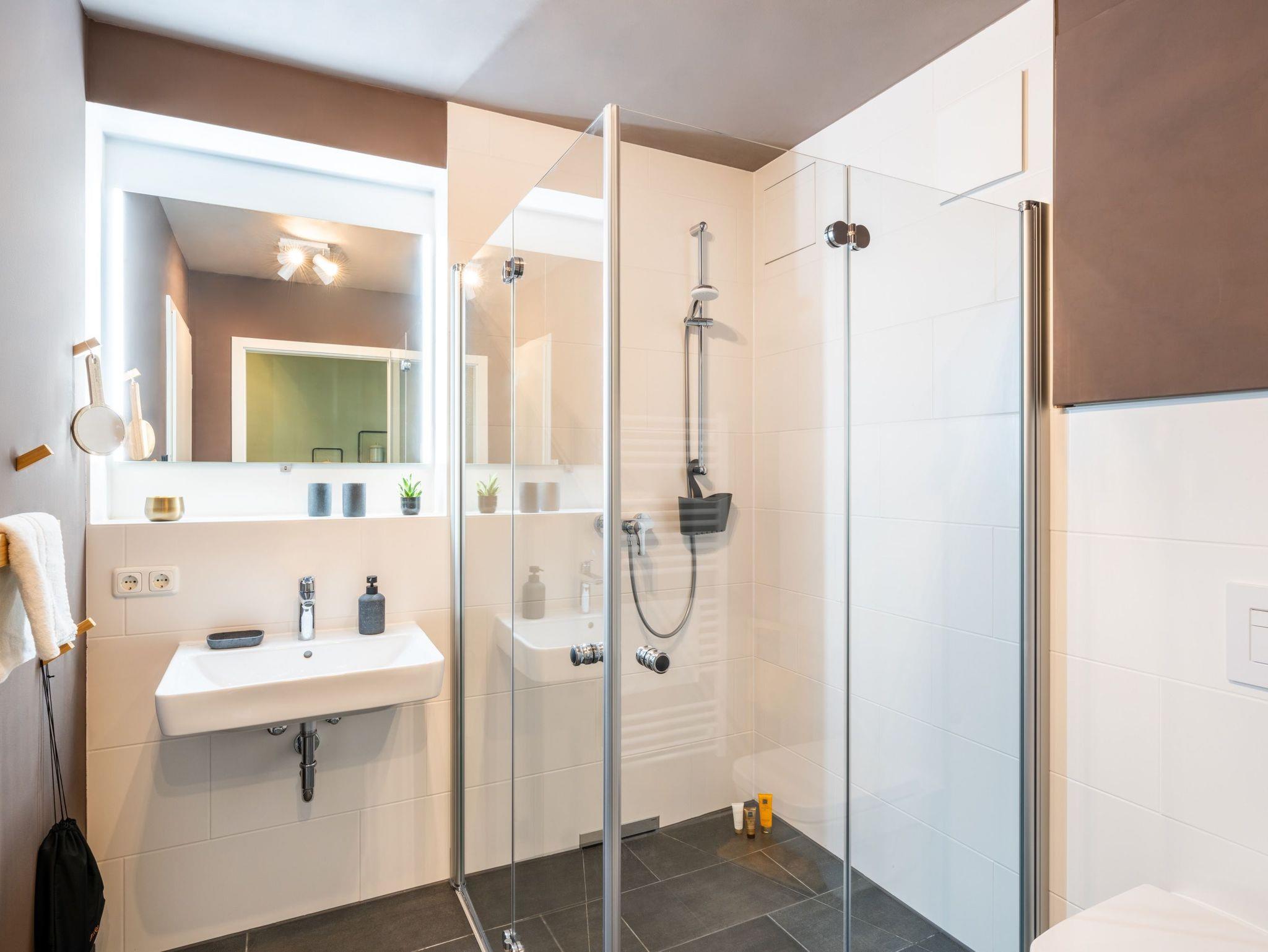 Das vollausgestattete Badezimmer verfügt über eine ebenerdige Dusche, WC, Waschtischanlage sowie Fön.