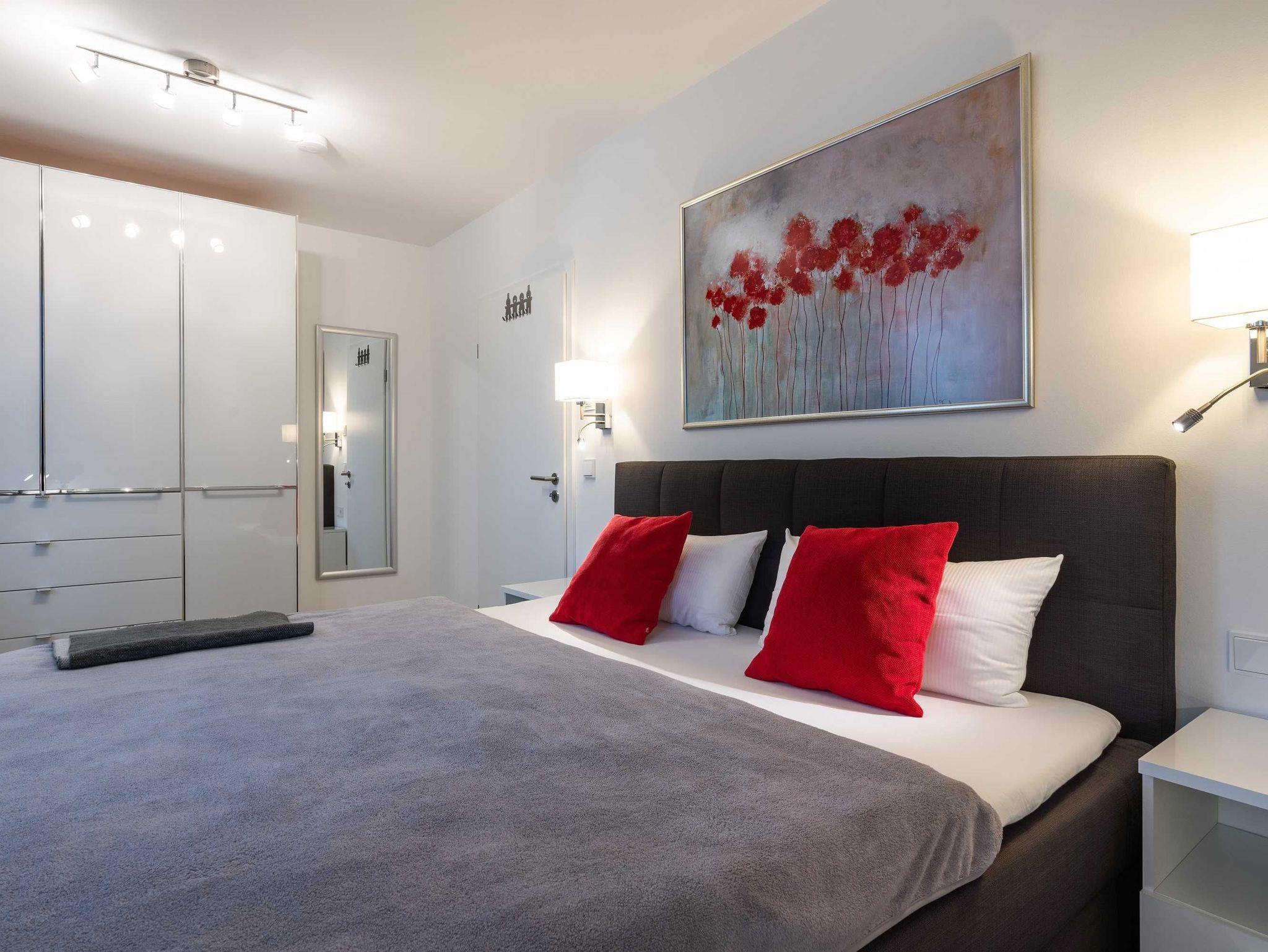Diese lichtdurchflutete, helle 3-Zimmer-Wohnung im obersten Geschoss von Haus 4 (Aufzug vorhanden) mit Platz für maximal 4 Personen sowie einem Kleinkind bis 2 Jahre im Babybett verfügt über eine Wohnfläche von 94 m² und hat 2 Schlafzimmer sowie 2 voll ausgestattete Duschbäder. Die große Sonnenterrasse mit 17 m² liegt in idealer Süd-Ausrichtung. Die Wohnung ist modern eingerichtet mit offenem Wohn-Essbereich, großem Esstisch, Ledersofa sowie Smart-TV (inkl. Sky-Abo). Die hochwertig ausgestattete Küche, offen zum Wohnbereich, lässt keine Wünsche offen. Erholsamer Schlaf in den beiden Schlafzimmern mit Boxspringbetten und Smart-TV ist garantiert. Das Badezimmer en Suite ist mit einer Duschkabine ausgestattet. Auf dem großen, überdachten Sonnenbalkon mit Essgruppe und zwei Relax-Sesseln, Fußhockern sowie einem Sonnenschirm können Sie die Seele baumeln lassen.
