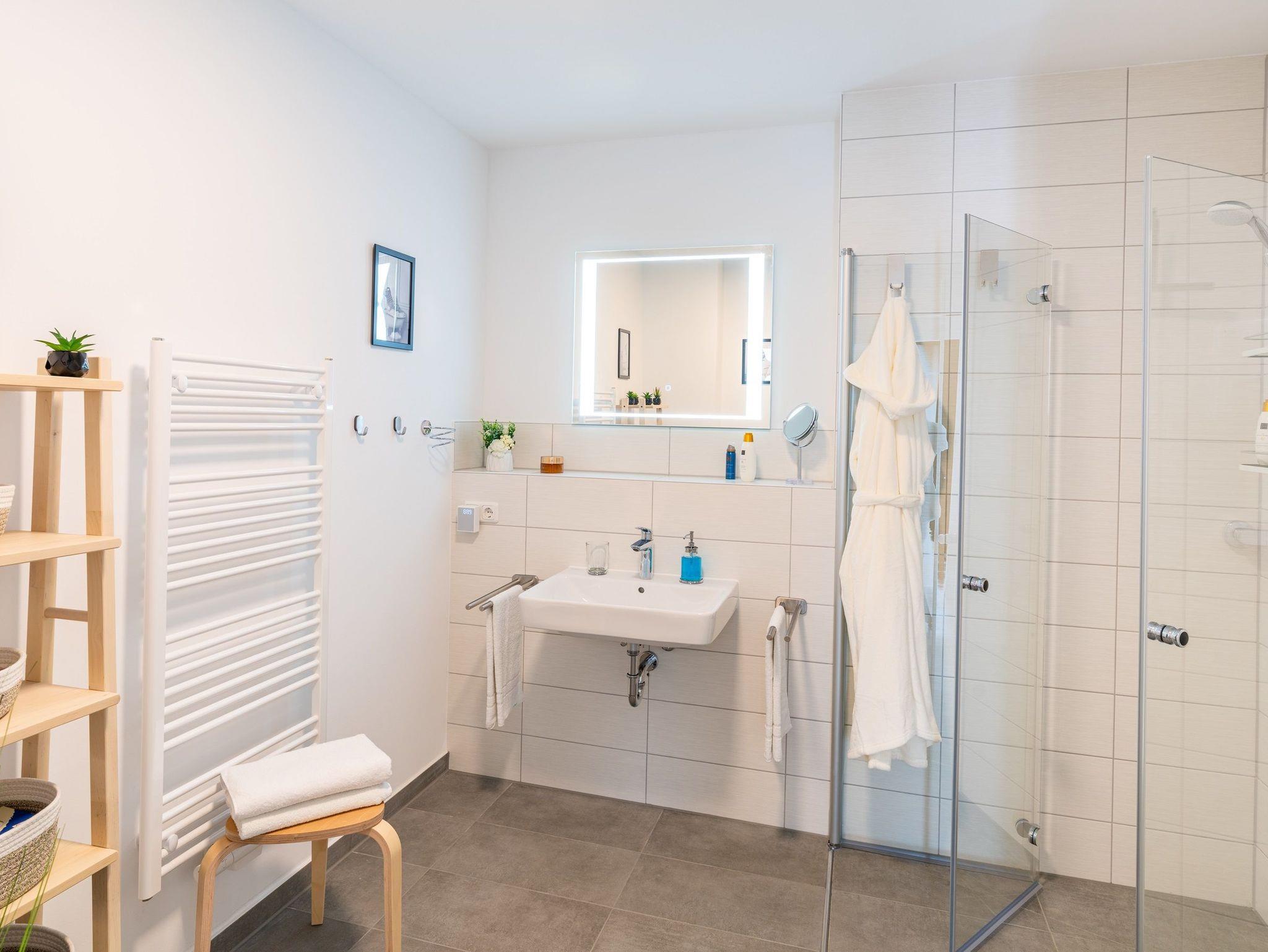 Das vollausgestattete Badezimmer verfügt über eine ebenerdige Dusche, WC, Waschtischanlage sowie Fön.