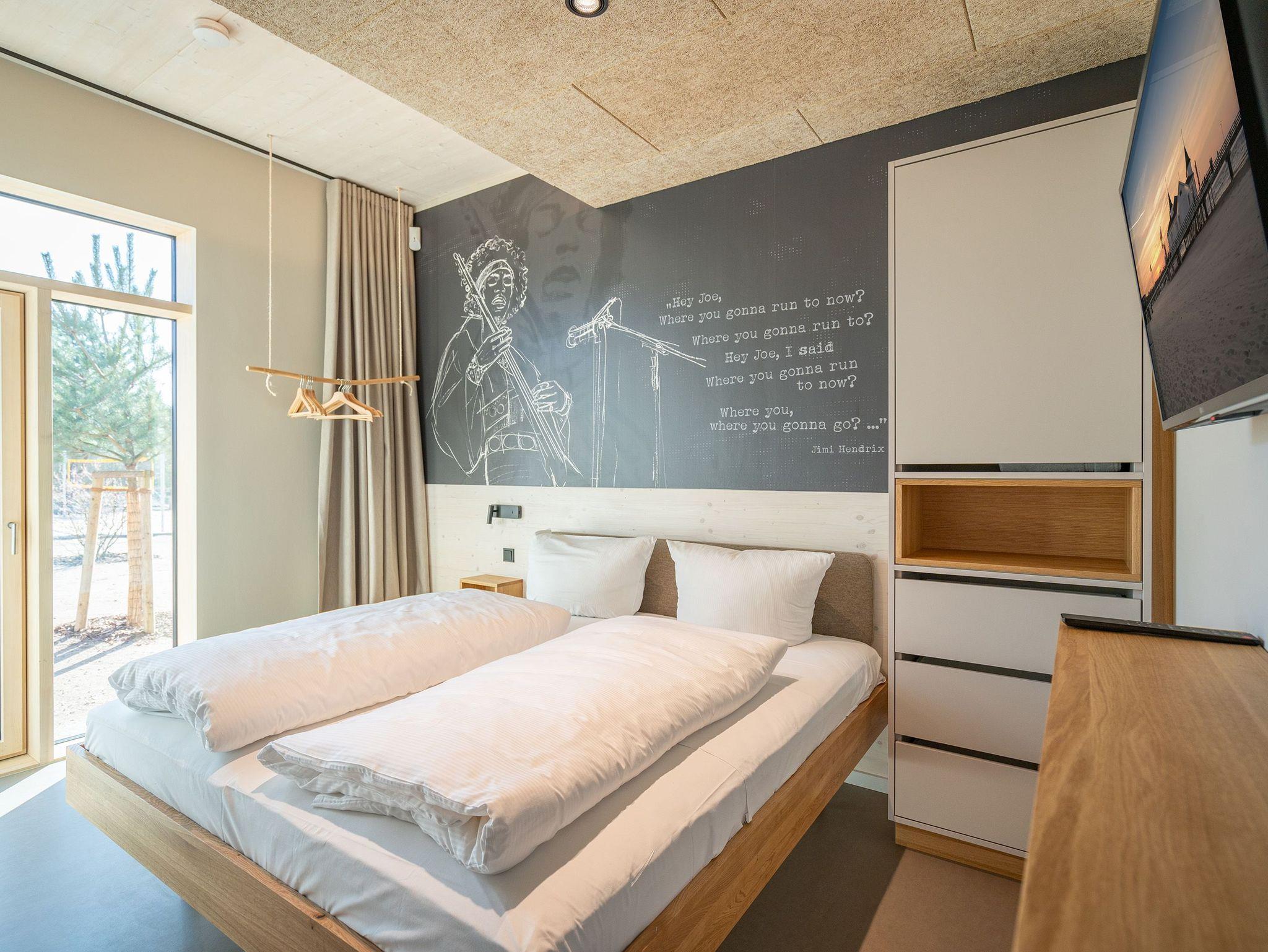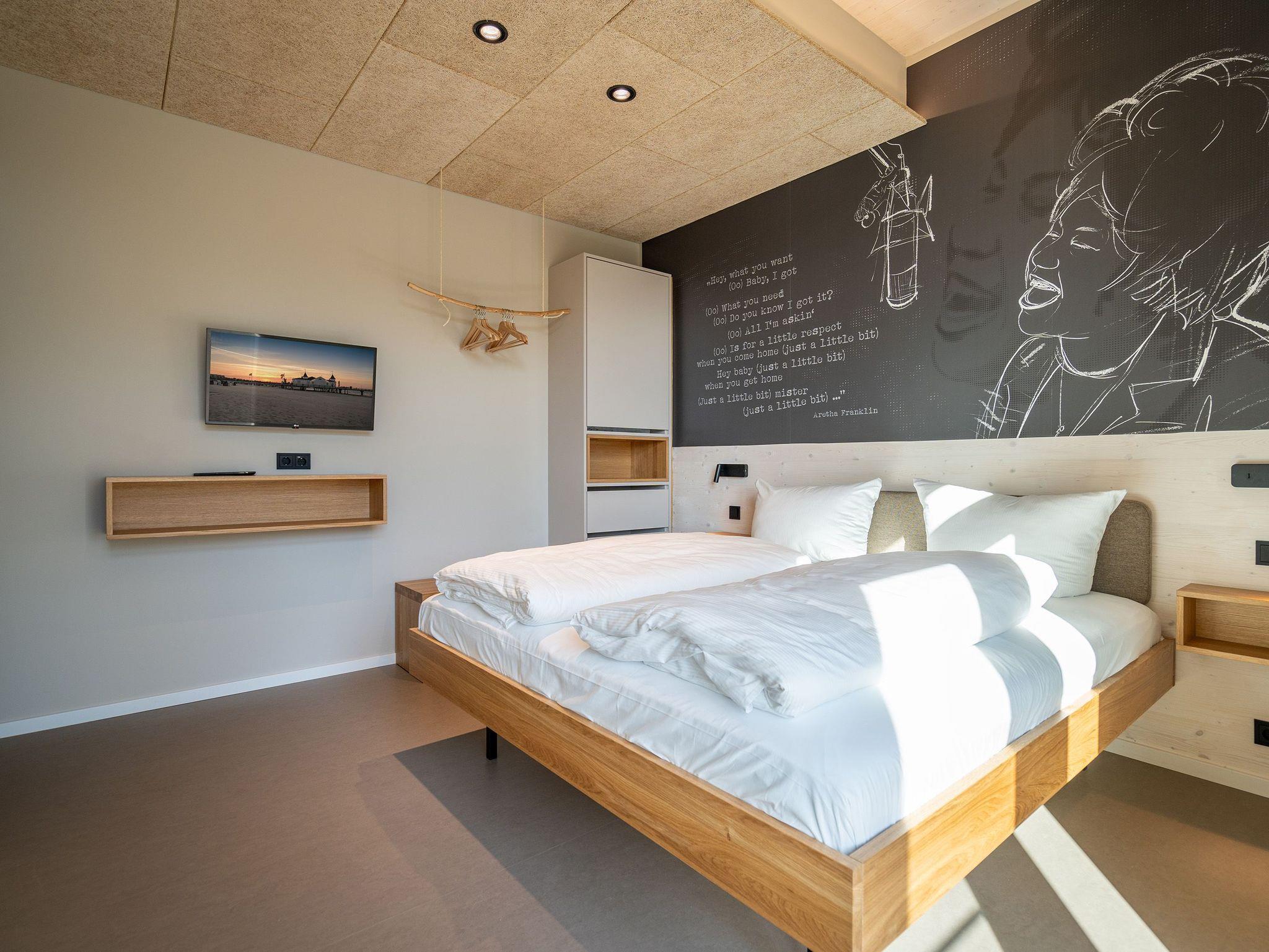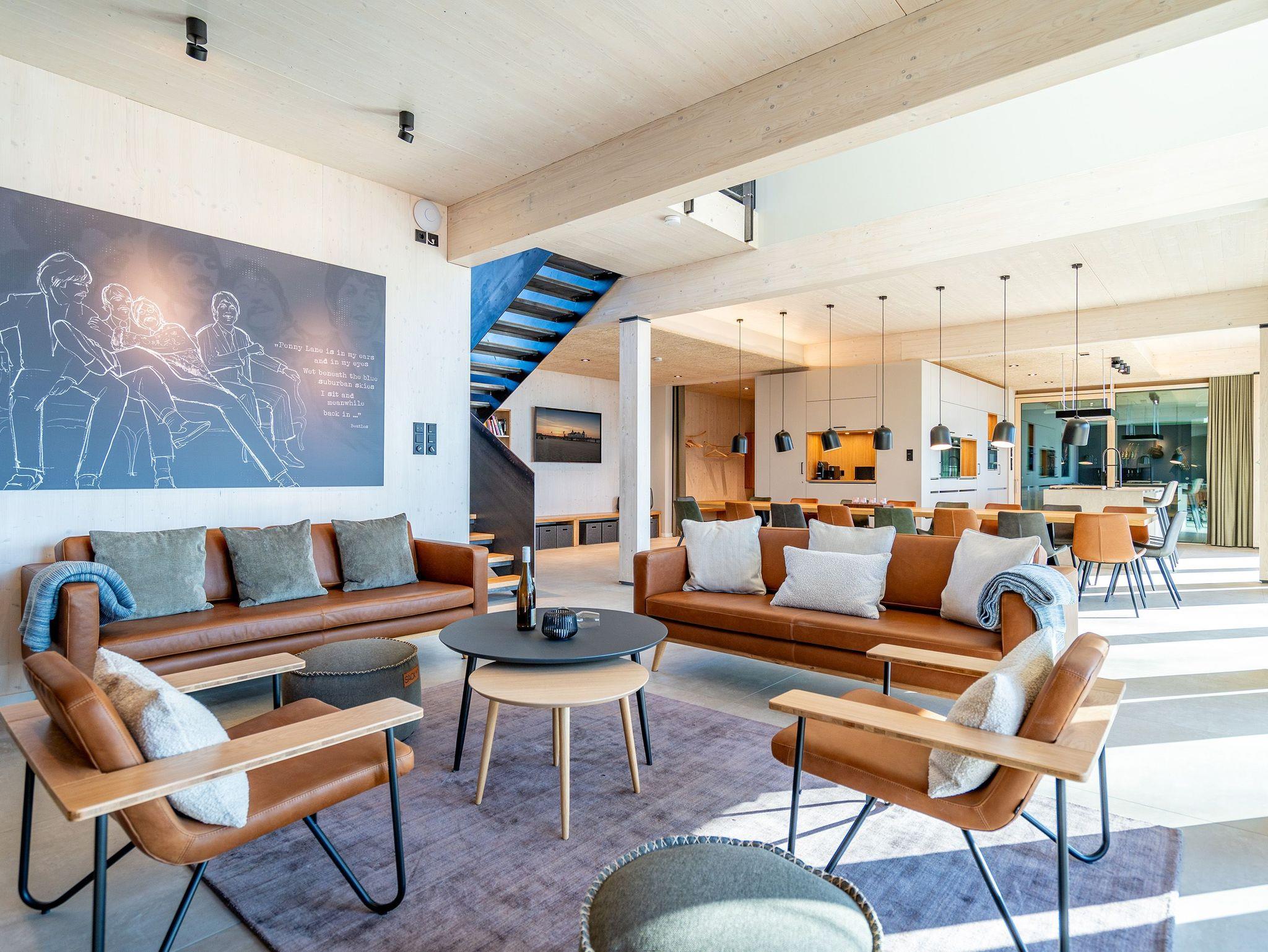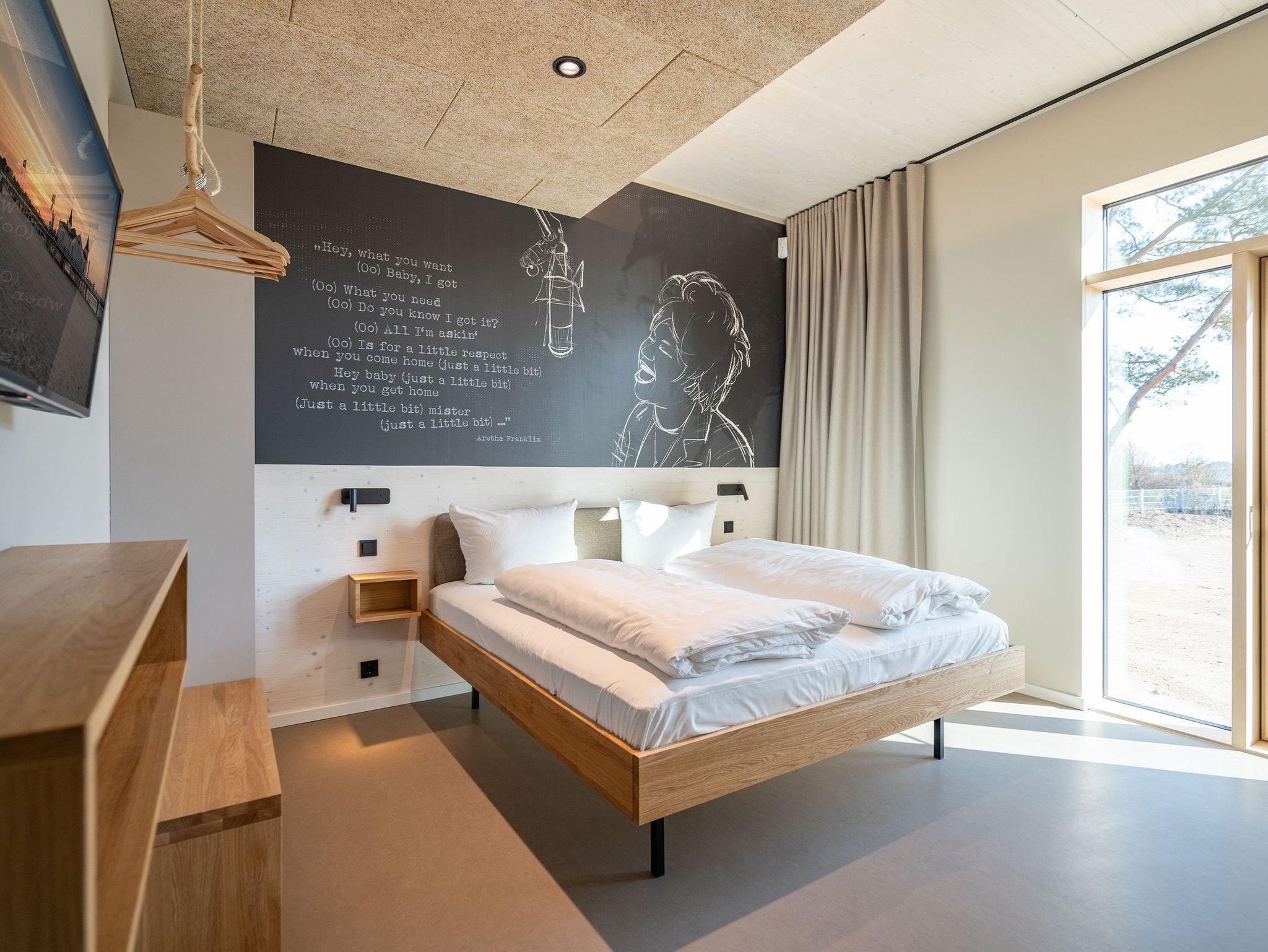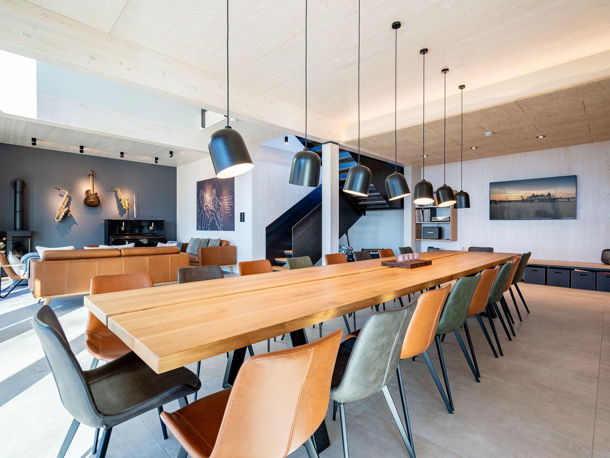 In dem 300 Quadratmeter großen Seminar- und Gästehaus mit großzügiger Außenanlage können bis zu 16 Personen nebst einem Kleinkind im Kinderreisebett beim Arbeiten oder Feiern, gemeinsam die Zeit genießen. In dieser besonderen Location kommen Bewohner nicht nur runter, sondern auf schöpferische Ideen voller Rhythm and Blues. Denn in der modernen Architektur des Hauses aus Stahl, Beton und Holz stecken jede Menge Reminiszenzen an die großen Künstler des Rock?n? Roll. Die Liebe zum musikalischen Detail steckt in vielen Kleinigkeiten. Wer mit offenen Augen durchs Haus schlendert, wird garantiert inspiriert. Legen Sie doch eine Platte auf dem Plattenspieler auf und träumen Sie sich in die Klänge großartiger Songs.Ein großer und offener Wohnbereich im Erdgeschoss ist perfekt dafür gemacht, Produktivität und Freizeit miteinander zu verbinden. Auch für große Familientreffen ist die Küstenkiste bestens geeignet. Im loftähnlichen Gemeinschaftsbereich lässt es sich wunderbar feiern, essen, gemeinsam kochen oder einfach nur zusammensitzen und das Leben genießen. Der Wohnbereich mit Ledersofas, Kamin und Klavier, der Essbereich mit riesiger Holztafel, die sich auch bestens zum Brainstormen, Diskutieren und Pläneschmieden eignet, und die supermoderne Küche sorgen für ein Gefühl von Freiheit und Nähe, von Unbeschwertheit und dem Fokus auf das Wesentliche. Auch im Innenhof und auf der Sonnenterrasse mit Grill laden zwei große Tafeln zum gemeinsamen Essen und Entspannen ein. Die Küche ist mit allem ausgestattet, was man sich für das Kochen in Gesellschaft nur wünschen kann. Sie verfügt über einen 6-Platten-Induktionsherd, einen Backofen sowie eine Mikrowelle-Backofen-Kombination. Auch mit 16 Mitbewohnern ist der Abwasch kein Problem. Denn den übernehmen zwei große Geschirrspüler. In den Schränken und in einem Serviceraum mit Waschmaschine, Trockner und zusätzlichem Kühl- und Gefrierschrank findet sich viel Stauraum für alle brauchbaren Utensilien, die dank Beschriftung, leicht zu finden sind. Die Gäste wohnen in acht Studios ? zwei im Erdgeschoss, sechs im 1. Obergeschoss ? mit Doppelbett, Kleiderschrank, Flat-TV, eigenem Tageslicht-Duschbad und separatem WC. Drei der Schlafzimmer verfügen über einen Zugang zum Balkon mit Haffblick. Aber auch alle anderen Zimmer haben aus dem Bett einen Blick ins Grüne. Jedes Zimmer ist einem anderen Musikgenie gewidmet. Entscheiden Sie selbst, ob Sie sich und ihre Träume lieber von Janis Joplin, Joni Mitchel oder von Bob Dylan beflügeln lassen wollen. Im Obergeschoss gibt es einen weiteren Loungebereich mit Flat-TV und Zugang zum Balkon. In einem Fitnessraum kann man sich an den hochwertigen Geräten der Firma Nohrd wunderbar auspowern, um anschließend in der Sauna oder im Whirlpool, die Energieakkus wieder aufzuladen. Doch das eigentliche Highlight des Anwesens ist der weitläufige Garten mit Beachvolleyballfeld auf echtem Strandsand, lauschigen Eckchen zum Sitzen, einem Hot Tub und einer großen Chillterrasse mit Haffblick. Parkplätze und eine Wallbox für Elektroautos (gegen Gebühr) gibt es vor dem Haus. Tierliebe Gäste können gegen Aufpreis bis zu zwei ihrer Lieblinge mitbringen.