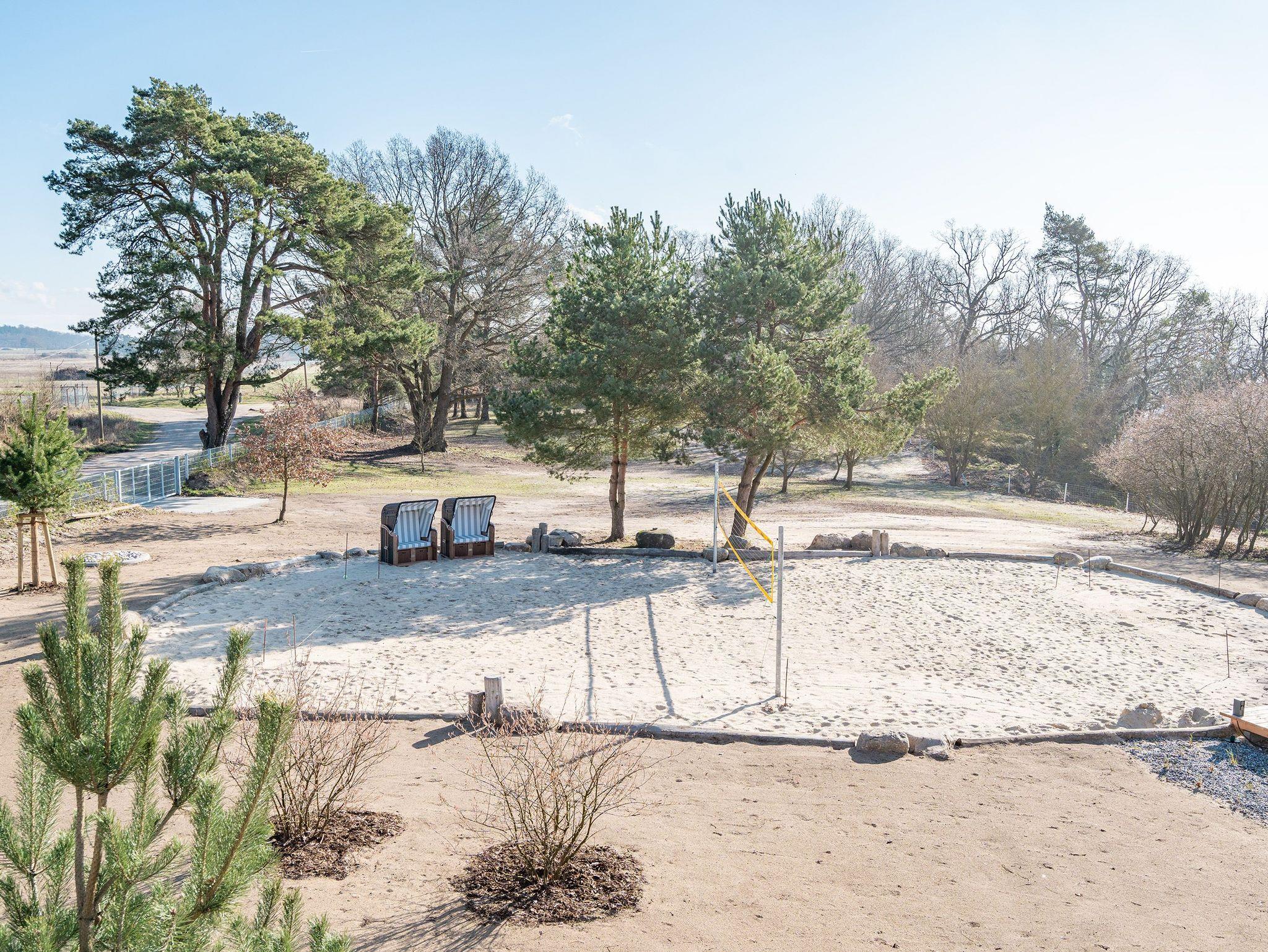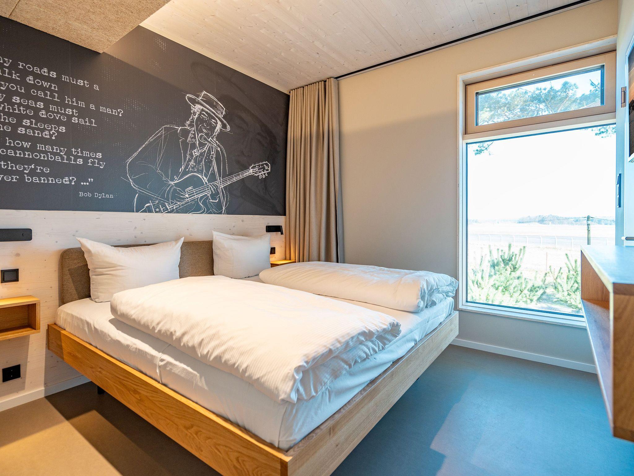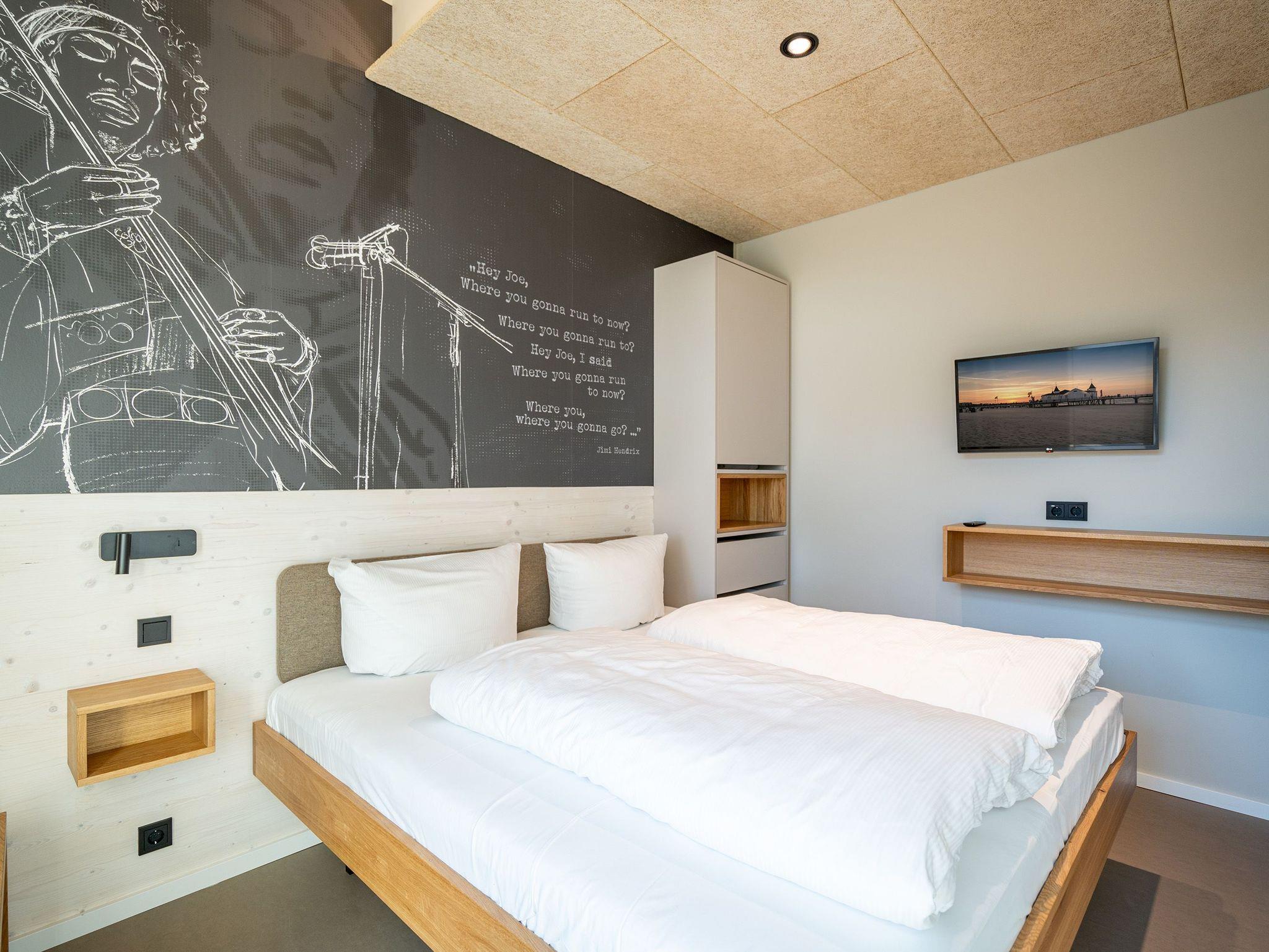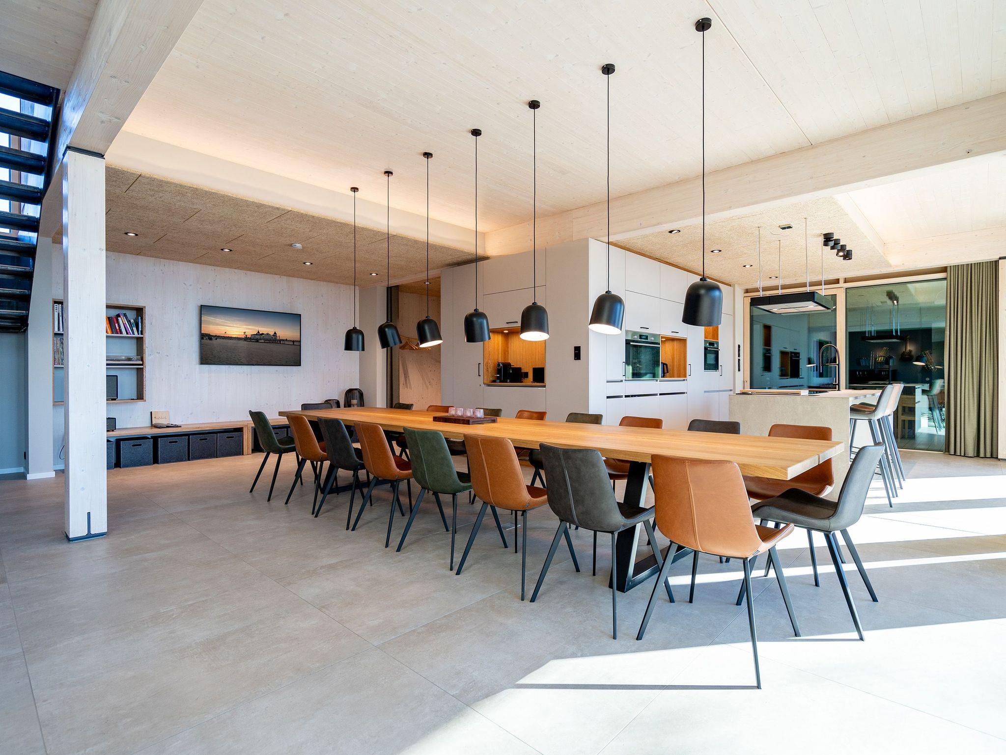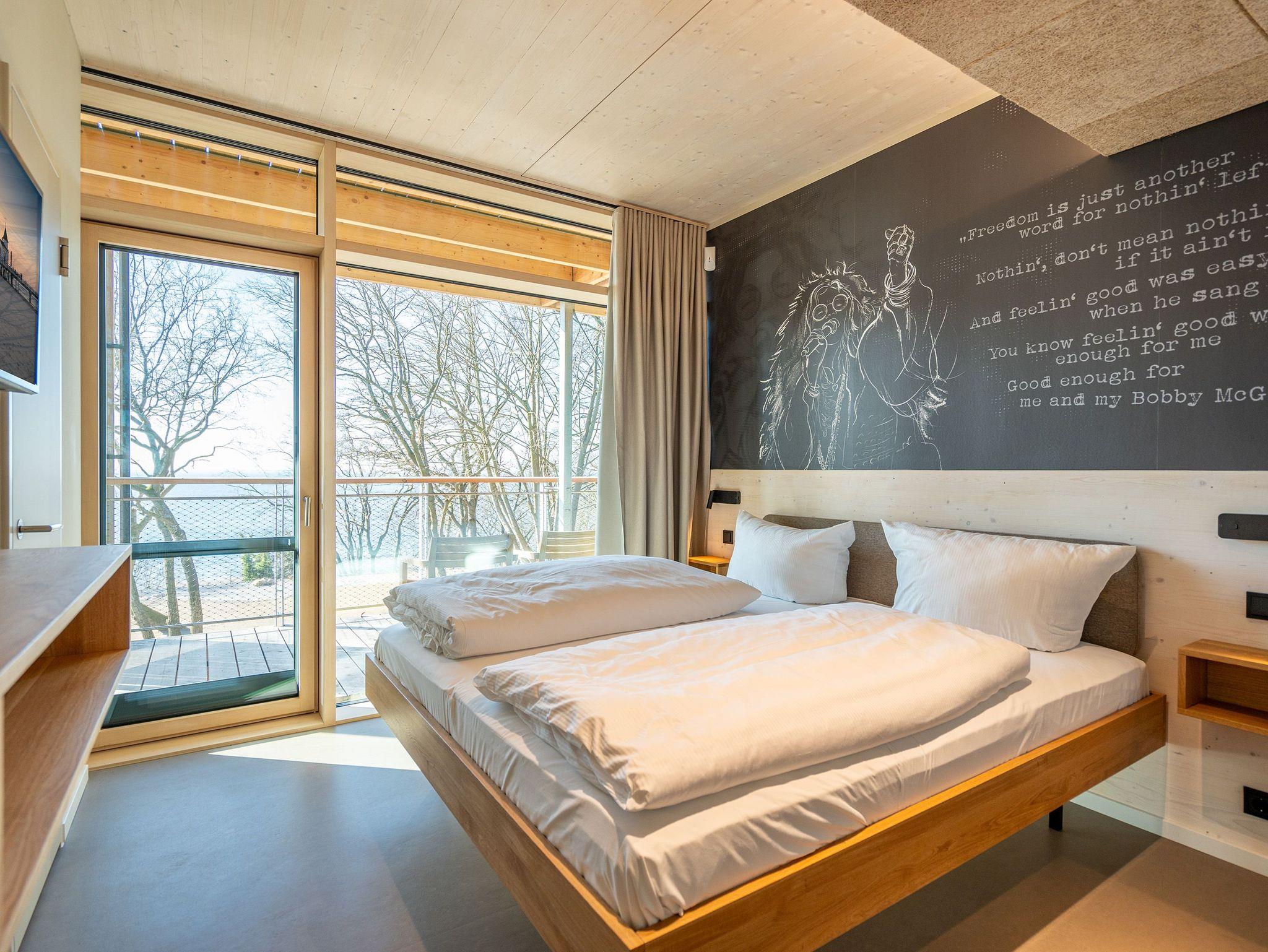 In dem 300 Quadratmeter großen Seminar- und Gästehaus mit großzügiger Außenanlage können bis zu 16 Personen nebst einem Kleinkind im Kinderreisebett beim Arbeiten oder Feiern, gemeinsam die Zeit genießen. In dieser besonderen Location kommen Bewohner nicht nur runter, sondern auf schöpferische Ideen voller Rhythm and Blues. Denn in der modernen Architektur des Hauses aus Stahl, Beton und Holz stecken jede Menge Reminiszenzen an die großen Künstler des Rock?n? Roll. Die Liebe zum musikalischen Detail steckt in vielen Kleinigkeiten. Wer mit offenen Augen durchs Haus schlendert, wird garantiert inspiriert. Legen Sie doch eine Platte auf dem Plattenspieler auf und träumen Sie sich in die Klänge großartiger Songs.Ein großer und offener Wohnbereich im Erdgeschoss ist perfekt dafür gemacht, Produktivität und Freizeit miteinander zu verbinden. Auch für große Familientreffen ist die Küstenkiste bestens geeignet. Im loftähnlichen Gemeinschaftsbereich lässt es sich wunderbar feiern, essen, gemeinsam kochen oder einfach nur zusammensitzen und das Leben genießen. Der Wohnbereich mit Ledersofas, Kamin und Klavier, der Essbereich mit riesiger Holztafel, die sich auch bestens zum Brainstormen, Diskutieren und Pläneschmieden eignet, und die supermoderne Küche sorgen für ein Gefühl von Freiheit und Nähe, von Unbeschwertheit und dem Fokus auf das Wesentliche. Auch im Innenhof und auf der Sonnenterrasse mit Grill laden zwei große Tafeln zum gemeinsamen Essen und Entspannen ein. Die Küche ist mit allem ausgestattet, was man sich für das Kochen in Gesellschaft nur wünschen kann. Sie verfügt über einen 6-Platten-Induktionsherd, einen Backofen sowie eine Mikrowelle-Backofen-Kombination. Auch mit 16 Mitbewohnern ist der Abwasch kein Problem. Denn den übernehmen zwei große Geschirrspüler. In den Schränken und in einem Serviceraum mit Waschmaschine, Trockner und zusätzlichem Kühl- und Gefrierschrank findet sich viel Stauraum für alle brauchbaren Utensilien, die dank Beschriftung, leicht zu finden sind. Die Gäste wohnen in acht Studios ? zwei im Erdgeschoss, sechs im 1. Obergeschoss ? mit Doppelbett, Kleiderschrank, Flat-TV, eigenem Tageslicht-Duschbad und separatem WC. Drei der Schlafzimmer verfügen über einen Zugang zum Balkon mit Haffblick. Aber auch alle anderen Zimmer haben aus dem Bett einen Blick ins Grüne. Jedes Zimmer ist einem anderen Musikgenie gewidmet. Entscheiden Sie selbst, ob Sie sich und ihre Träume lieber von Janis Joplin, Joni Mitchel oder von Bob Dylan beflügeln lassen wollen. Im Obergeschoss gibt es einen weiteren Loungebereich mit Flat-TV und Zugang zum Balkon. In einem Fitnessraum kann man sich an den hochwertigen Geräten der Firma Nohrd wunderbar auspowern, um anschließend in der Sauna oder im Whirlpool, die Energieakkus wieder aufzuladen. Doch das eigentliche Highlight des Anwesens ist der weitläufige Garten mit Beachvolleyballfeld auf echtem Strandsand, lauschigen Eckchen zum Sitzen, einem Hot Tub und einer großen Chillterrasse mit Haffblick. Parkplätze und eine Wallbox für Elektroautos (gegen Gebühr) gibt es vor dem Haus. Tierliebe Gäste können gegen Aufpreis bis zu zwei ihrer Lieblinge mitbringen.
