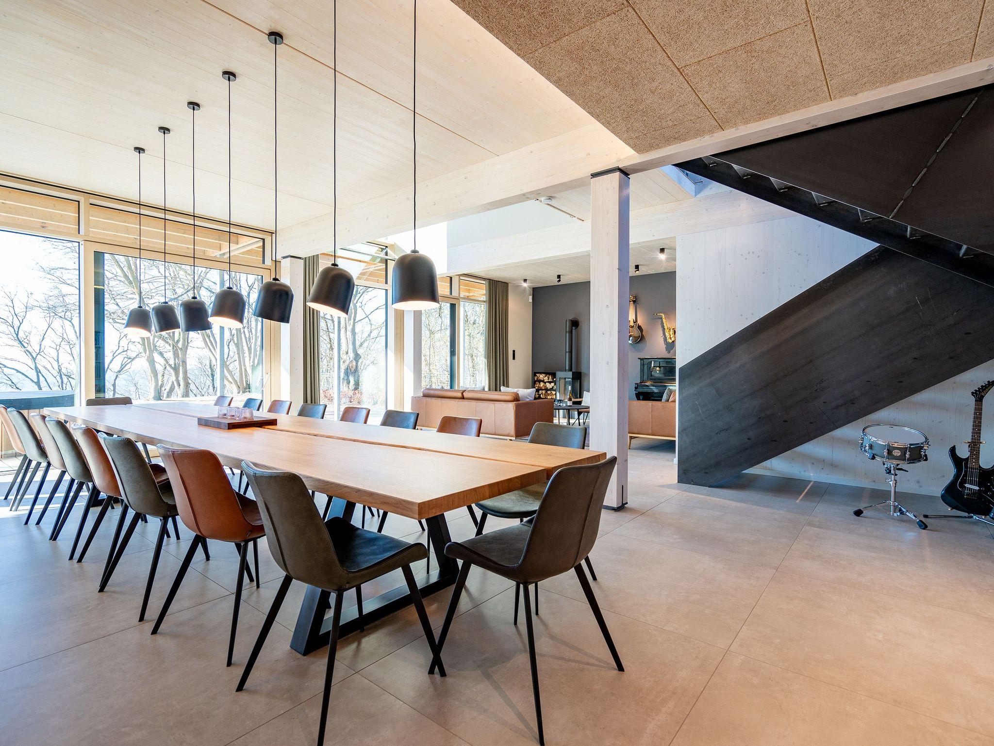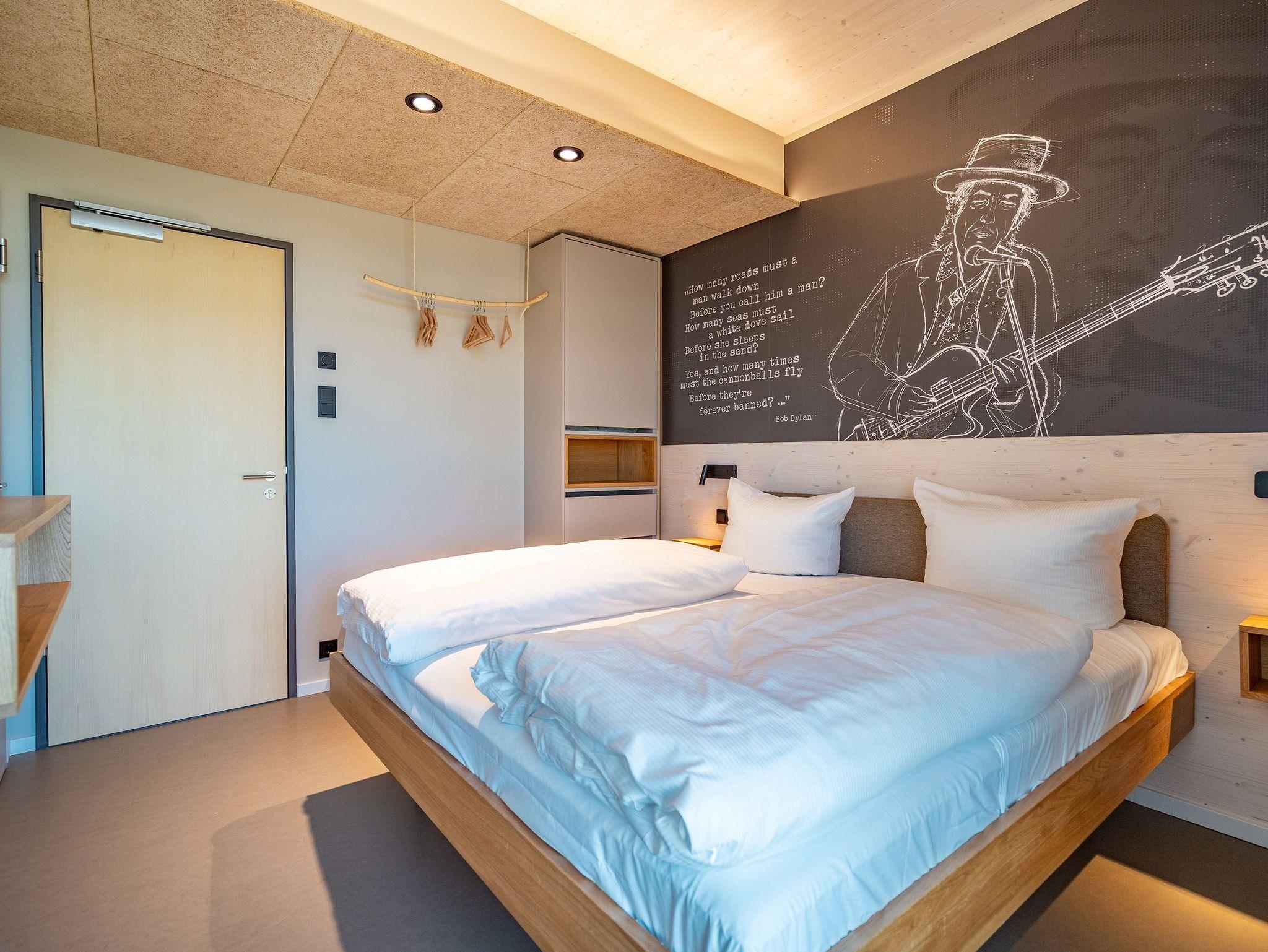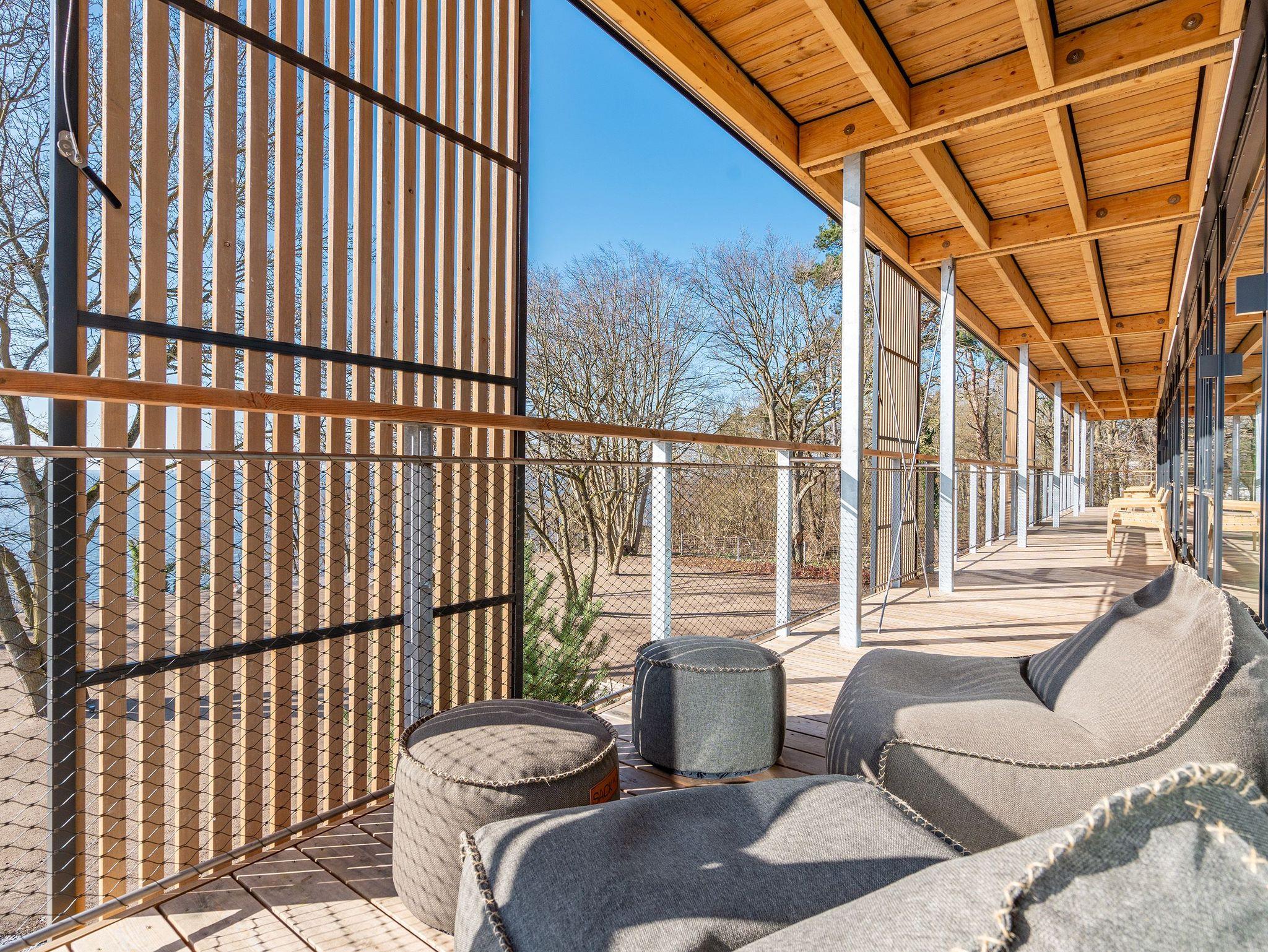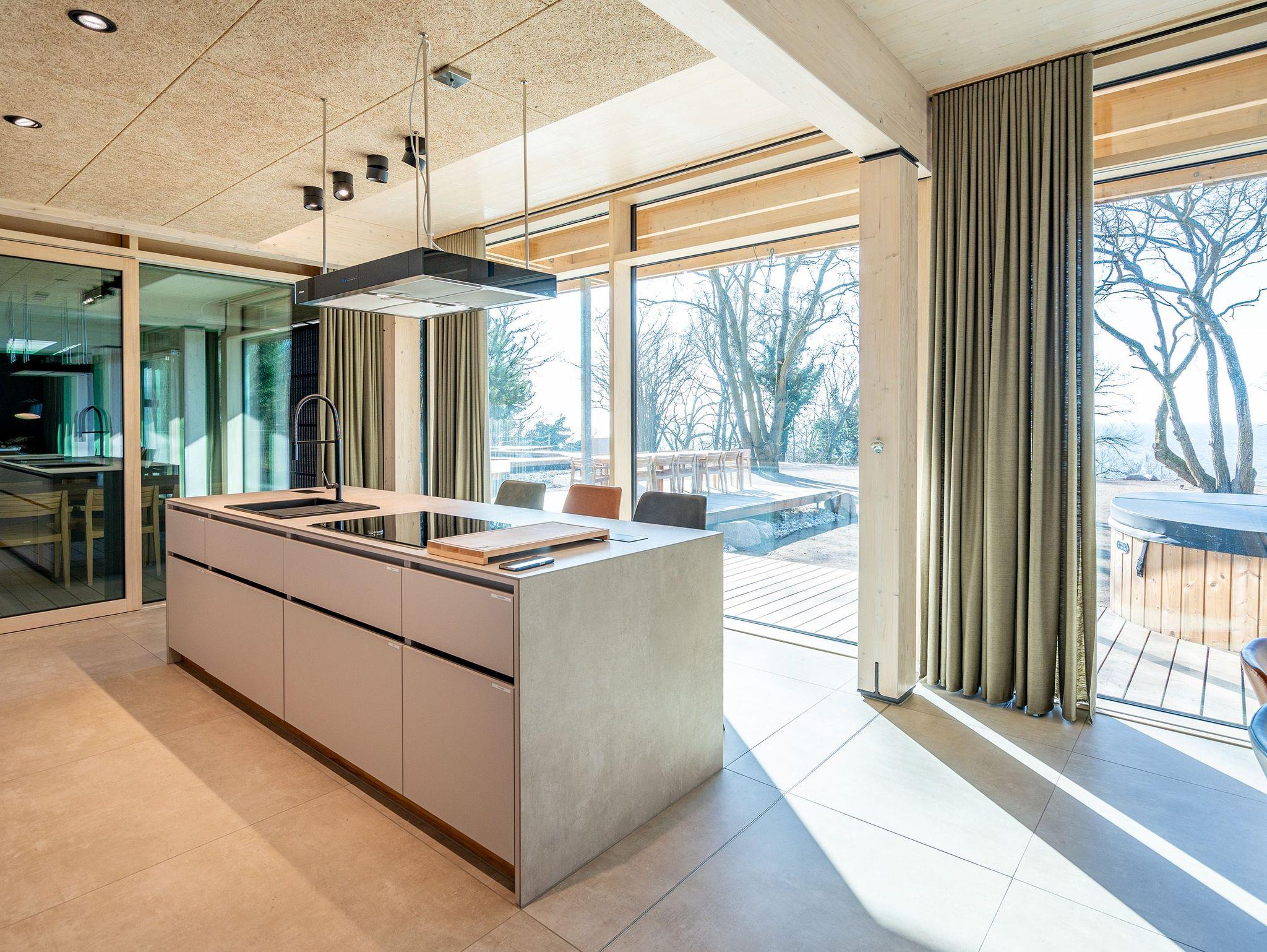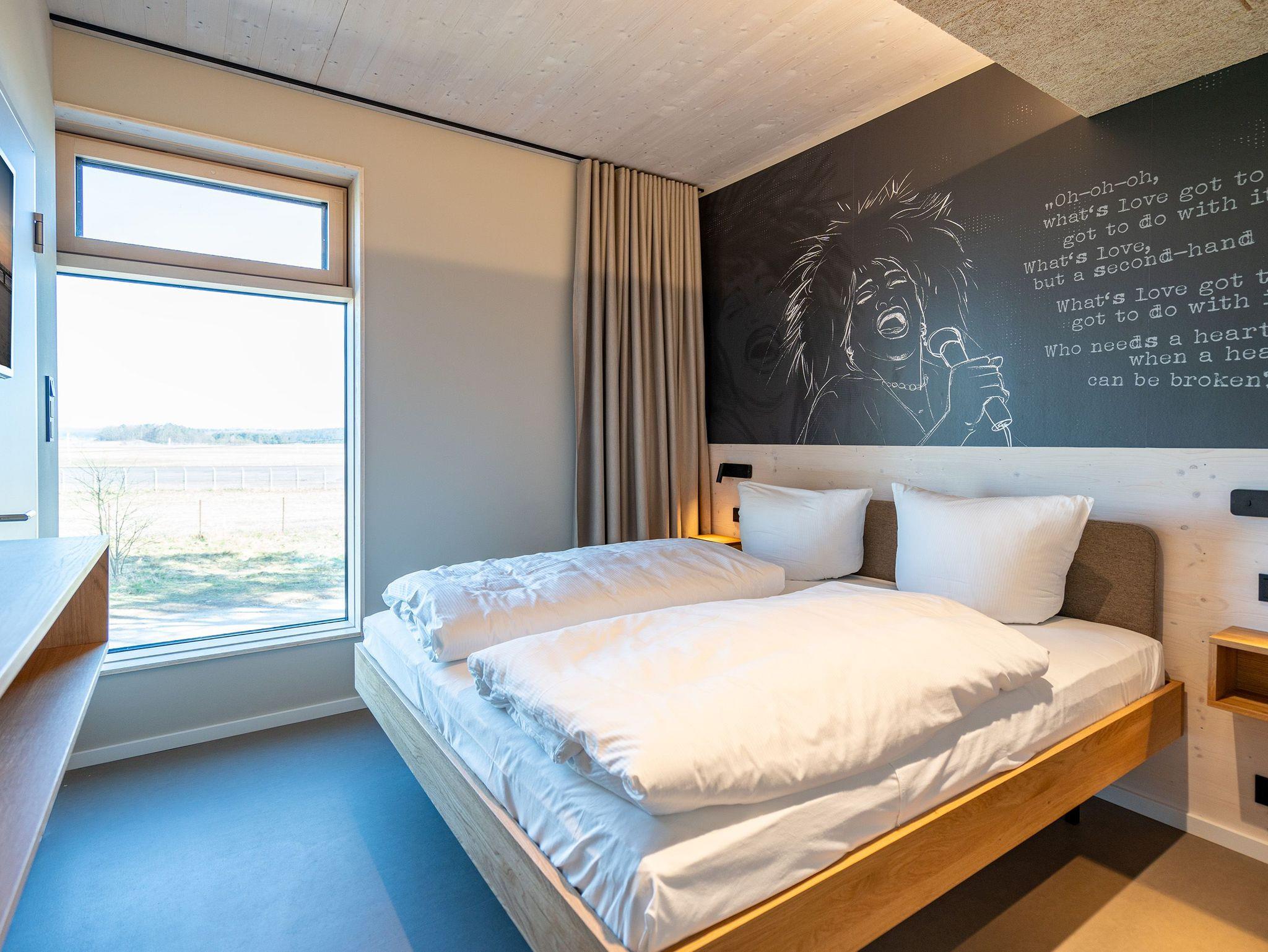 In dem 300 Quadratmeter großen Seminar- und Gästehaus mit großzügiger Außenanlage können bis zu 16 Personen nebst einem Kleinkind im Kinderreisebett beim Arbeiten oder Feiern, gemeinsam die Zeit genießen. In dieser besonderen Location kommen Bewohner nicht nur runter, sondern auf schöpferische Ideen voller Rhythm and Blues. Denn in der modernen Architektur des Hauses aus Stahl, Beton und Holz stecken jede Menge Reminiszenzen an die großen Künstler des Rock?n? Roll. Die Liebe zum musikalischen Detail steckt in vielen Kleinigkeiten. Wer mit offenen Augen durchs Haus schlendert, wird garantiert inspiriert. Legen Sie doch eine Platte auf dem Plattenspieler auf und träumen Sie sich in die Klänge großartiger Songs.Ein großer und offener Wohnbereich im Erdgeschoss ist perfekt dafür gemacht, Produktivität und Freizeit miteinander zu verbinden. Auch für große Familientreffen ist die Küstenkiste bestens geeignet. Im loftähnlichen Gemeinschaftsbereich lässt es sich wunderbar feiern, essen, gemeinsam kochen oder einfach nur zusammensitzen und das Leben genießen. Der Wohnbereich mit Ledersofas, Kamin und Klavier, der Essbereich mit riesiger Holztafel, die sich auch bestens zum Brainstormen, Diskutieren und Pläneschmieden eignet, und die supermoderne Küche sorgen für ein Gefühl von Freiheit und Nähe, von Unbeschwertheit und dem Fokus auf das Wesentliche. Auch im Innenhof und auf der Sonnenterrasse mit Grill laden zwei große Tafeln zum gemeinsamen Essen und Entspannen ein. Die Küche ist mit allem ausgestattet, was man sich für das Kochen in Gesellschaft nur wünschen kann. Sie verfügt über einen 6-Platten-Induktionsherd, einen Backofen sowie eine Mikrowelle-Backofen-Kombination. Auch mit 16 Mitbewohnern ist der Abwasch kein Problem. Denn den übernehmen zwei große Geschirrspüler. In den Schränken und in einem Serviceraum mit Waschmaschine, Trockner und zusätzlichem Kühl- und Gefrierschrank findet sich viel Stauraum für alle brauchbaren Utensilien, die dank Beschriftung, leicht zu finden sind. Die Gäste wohnen in acht Studios ? zwei im Erdgeschoss, sechs im 1. Obergeschoss ? mit Doppelbett, Kleiderschrank, Flat-TV, eigenem Tageslicht-Duschbad und separatem WC. Drei der Schlafzimmer verfügen über einen Zugang zum Balkon mit Haffblick. Aber auch alle anderen Zimmer haben aus dem Bett einen Blick ins Grüne. Jedes Zimmer ist einem anderen Musikgenie gewidmet. Entscheiden Sie selbst, ob Sie sich und ihre Träume lieber von Janis Joplin, Joni Mitchel oder von Bob Dylan beflügeln lassen wollen. Im Obergeschoss gibt es einen weiteren Loungebereich mit Flat-TV und Zugang zum Balkon. In einem Fitnessraum kann man sich an den hochwertigen Geräten der Firma Nohrd wunderbar auspowern, um anschließend in der Sauna oder im Whirlpool, die Energieakkus wieder aufzuladen. Doch das eigentliche Highlight des Anwesens ist der weitläufige Garten mit Beachvolleyballfeld auf echtem Strandsand, lauschigen Eckchen zum Sitzen, einem Hot Tub und einer großen Chillterrasse mit Haffblick. Parkplätze und eine Wallbox für Elektroautos (gegen Gebühr) gibt es vor dem Haus. Tierliebe Gäste können gegen Aufpreis bis zu zwei ihrer Lieblinge mitbringen.