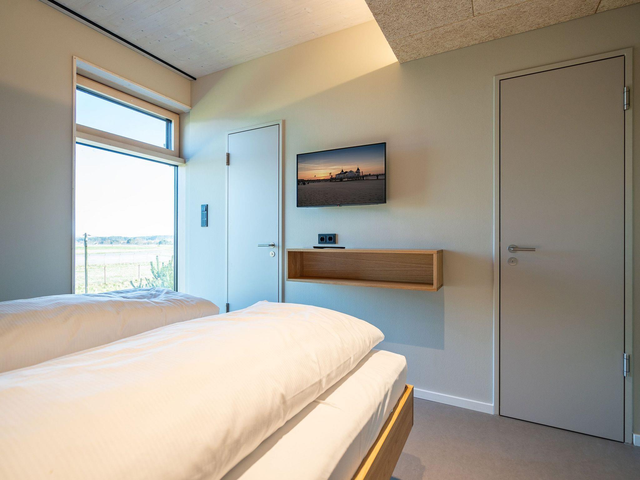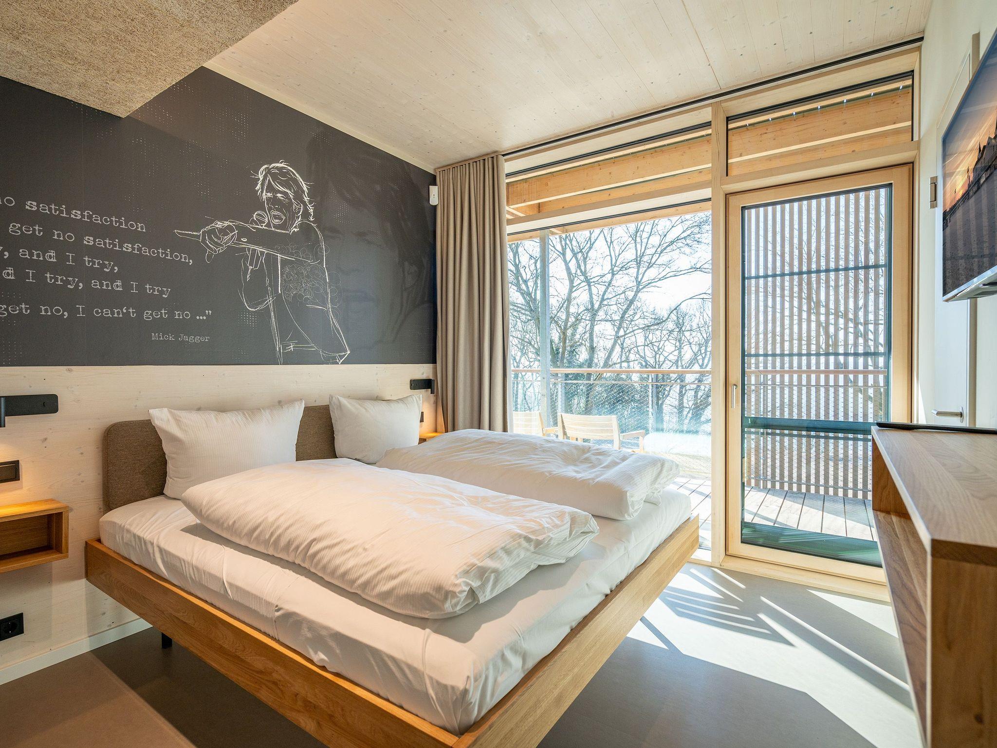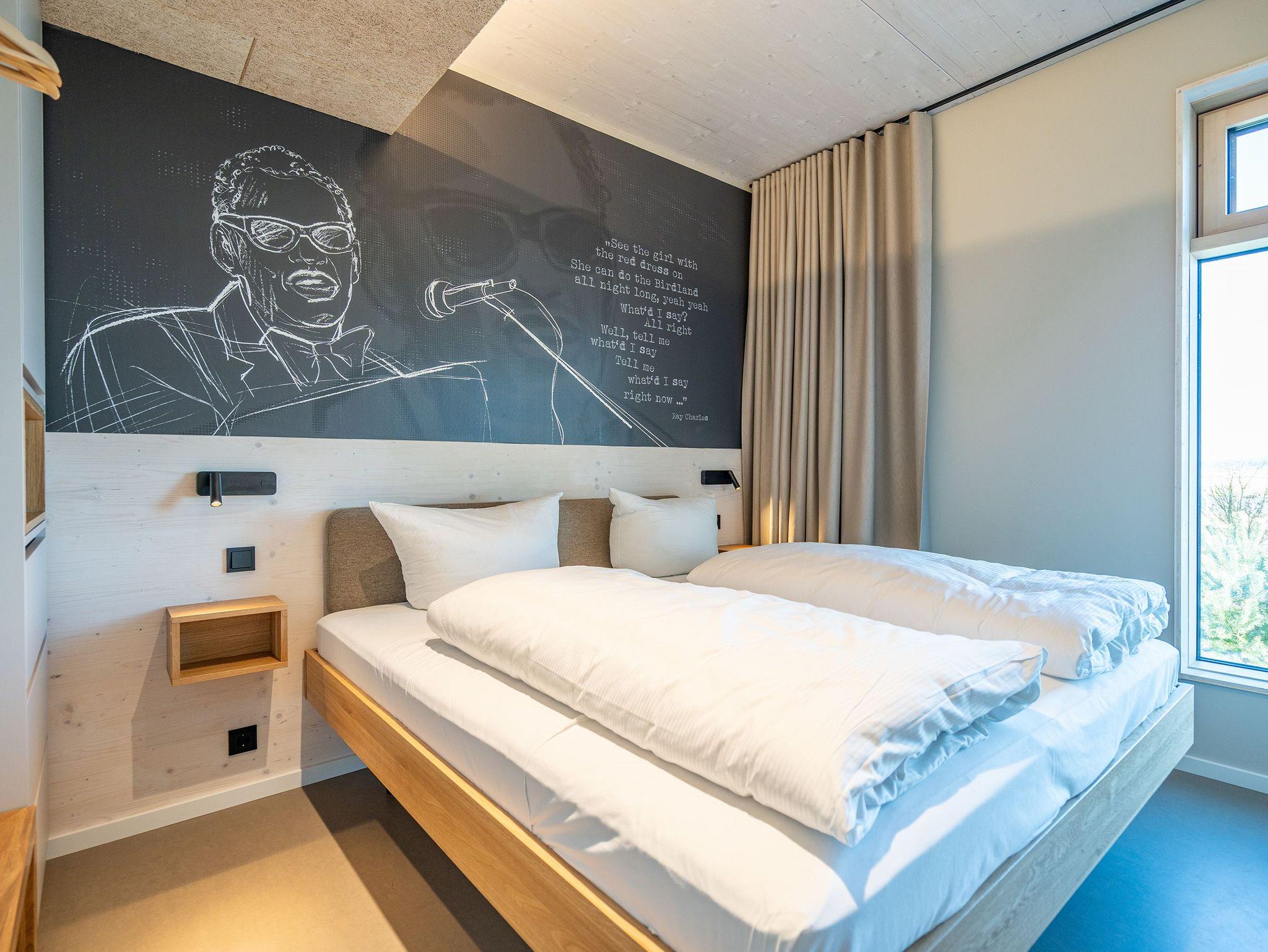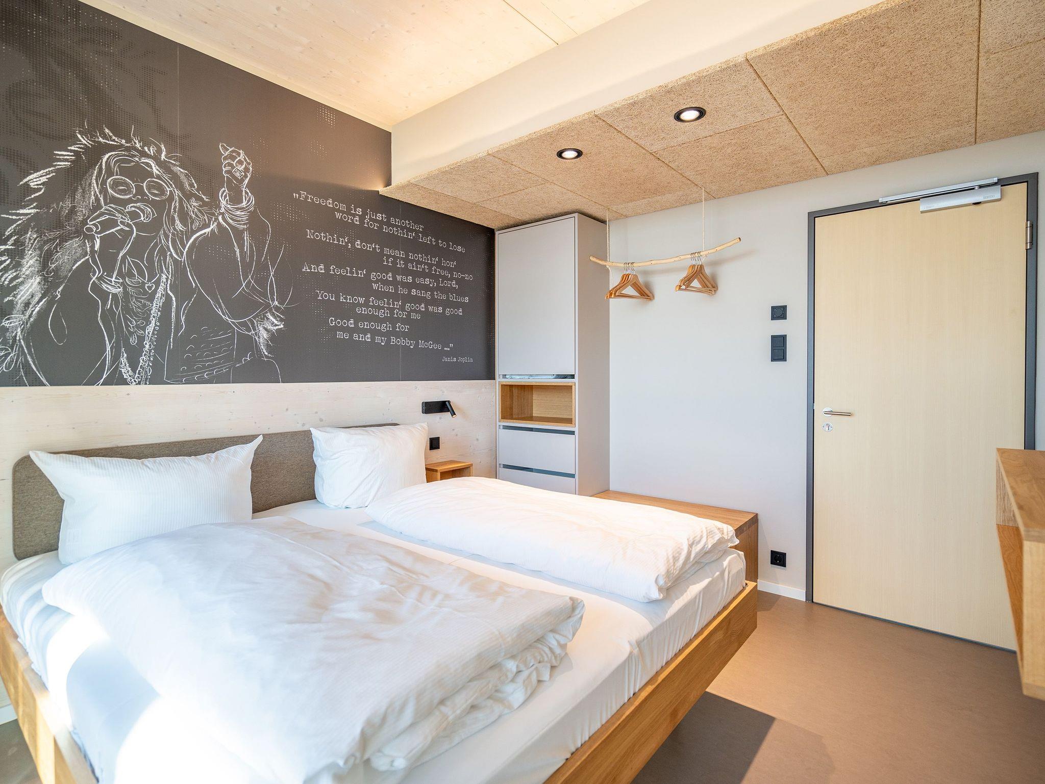 In dem 300 Quadratmeter großen Seminar- und Gästehaus mit großzügiger Außenanlage können bis zu 16 Personen nebst einem Kleinkind im Kinderreisebett beim Arbeiten oder Feiern, gemeinsam die Zeit genießen. In dieser besonderen Location kommen Bewohner nicht nur runter, sondern auf schöpferische Ideen voller Rhythm and Blues. Denn in der modernen Architektur des Hauses aus Stahl, Beton und Holz stecken jede Menge Reminiszenzen an die großen Künstler des Rock?n? Roll. Die Liebe zum musikalischen Detail steckt in vielen Kleinigkeiten. Wer mit offenen Augen durchs Haus schlendert, wird garantiert inspiriert. Legen Sie doch eine Platte auf dem Plattenspieler auf und träumen Sie sich in die Klänge großartiger Songs.Ein großer und offener Wohnbereich im Erdgeschoss ist perfekt dafür gemacht, Produktivität und Freizeit miteinander zu verbinden. Auch für große Familientreffen ist die Küstenkiste bestens geeignet. Im loftähnlichen Gemeinschaftsbereich lässt es sich wunderbar feiern, essen, gemeinsam kochen oder einfach nur zusammensitzen und das Leben genießen. Der Wohnbereich mit Ledersofas, Kamin und Klavier, der Essbereich mit riesiger Holztafel, die sich auch bestens zum Brainstormen, Diskutieren und Pläneschmieden eignet, und die supermoderne Küche sorgen für ein Gefühl von Freiheit und Nähe, von Unbeschwertheit und dem Fokus auf das Wesentliche. Auch im Innenhof und auf der Sonnenterrasse mit Grill laden zwei große Tafeln zum gemeinsamen Essen und Entspannen ein. Die Küche ist mit allem ausgestattet, was man sich für das Kochen in Gesellschaft nur wünschen kann. Sie verfügt über einen 6-Platten-Induktionsherd, einen Backofen sowie eine Mikrowelle-Backofen-Kombination. Auch mit 16 Mitbewohnern ist der Abwasch kein Problem. Denn den übernehmen zwei große Geschirrspüler. In den Schränken und in einem Serviceraum mit Waschmaschine, Trockner und zusätzlichem Kühl- und Gefrierschrank findet sich viel Stauraum für alle brauchbaren Utensilien, die dank Beschriftung, leicht zu finden sind. Die Gäste wohnen in acht Studios ? zwei im Erdgeschoss, sechs im 1. Obergeschoss ? mit Doppelbett, Kleiderschrank, Flat-TV, eigenem Tageslicht-Duschbad und separatem WC. Drei der Schlafzimmer verfügen über einen Zugang zum Balkon mit Haffblick. Aber auch alle anderen Zimmer haben aus dem Bett einen Blick ins Grüne. Jedes Zimmer ist einem anderen Musikgenie gewidmet. Entscheiden Sie selbst, ob Sie sich und ihre Träume lieber von Janis Joplin, Joni Mitchel oder von Bob Dylan beflügeln lassen wollen. Im Obergeschoss gibt es einen weiteren Loungebereich mit Flat-TV und Zugang zum Balkon. In einem Fitnessraum kann man sich an den hochwertigen Geräten der Firma Nohrd wunderbar auspowern, um anschließend in der Sauna oder im Whirlpool, die Energieakkus wieder aufzuladen. Doch das eigentliche Highlight des Anwesens ist der weitläufige Garten mit Beachvolleyballfeld auf echtem Strandsand, lauschigen Eckchen zum Sitzen, einem Hot Tub und einer großen Chillterrasse mit Haffblick. Parkplätze und eine Wallbox für Elektroautos (gegen Gebühr) gibt es vor dem Haus. Tierliebe Gäste können gegen Aufpreis bis zu zwei ihrer Lieblinge mitbringen.
