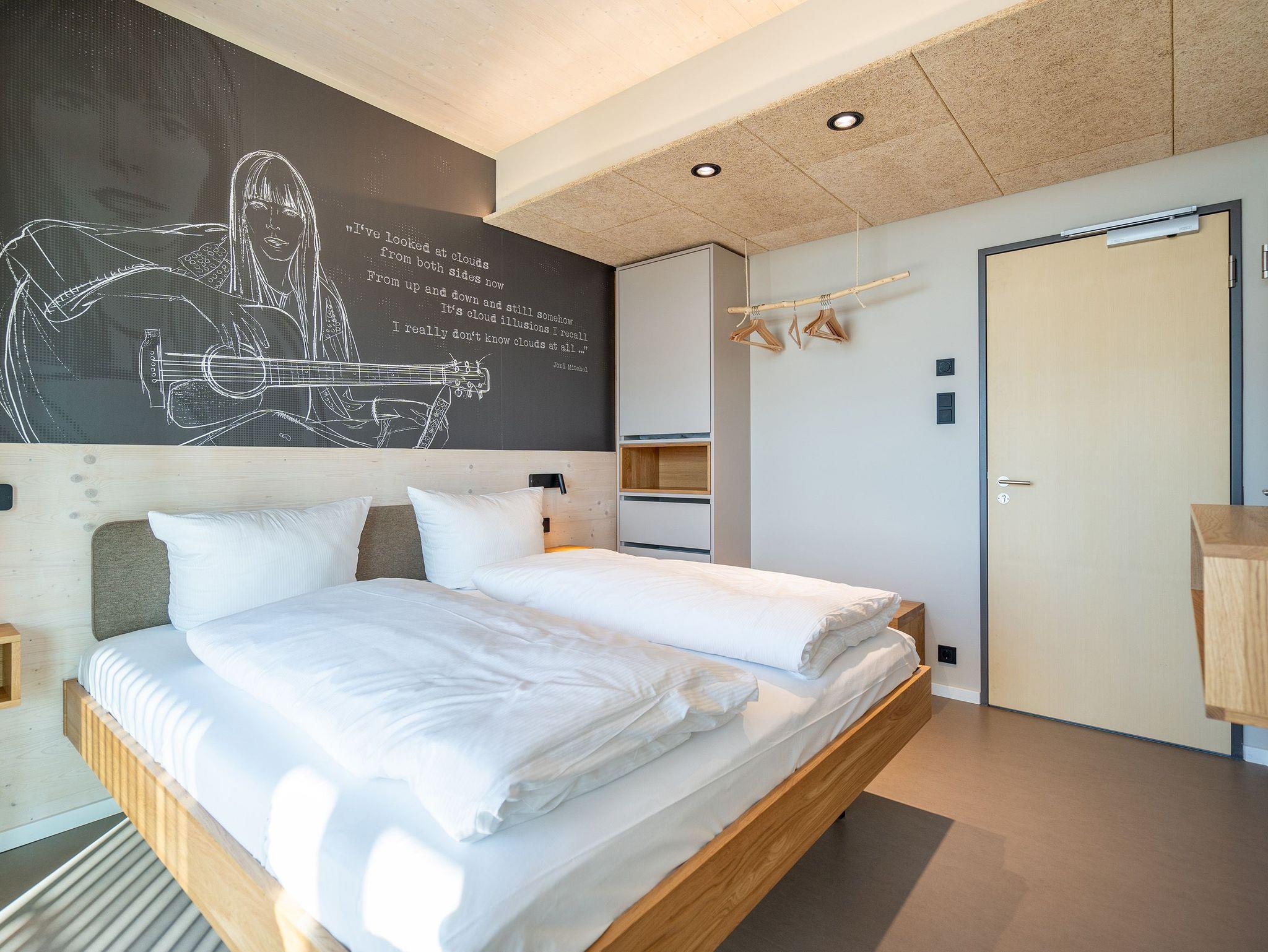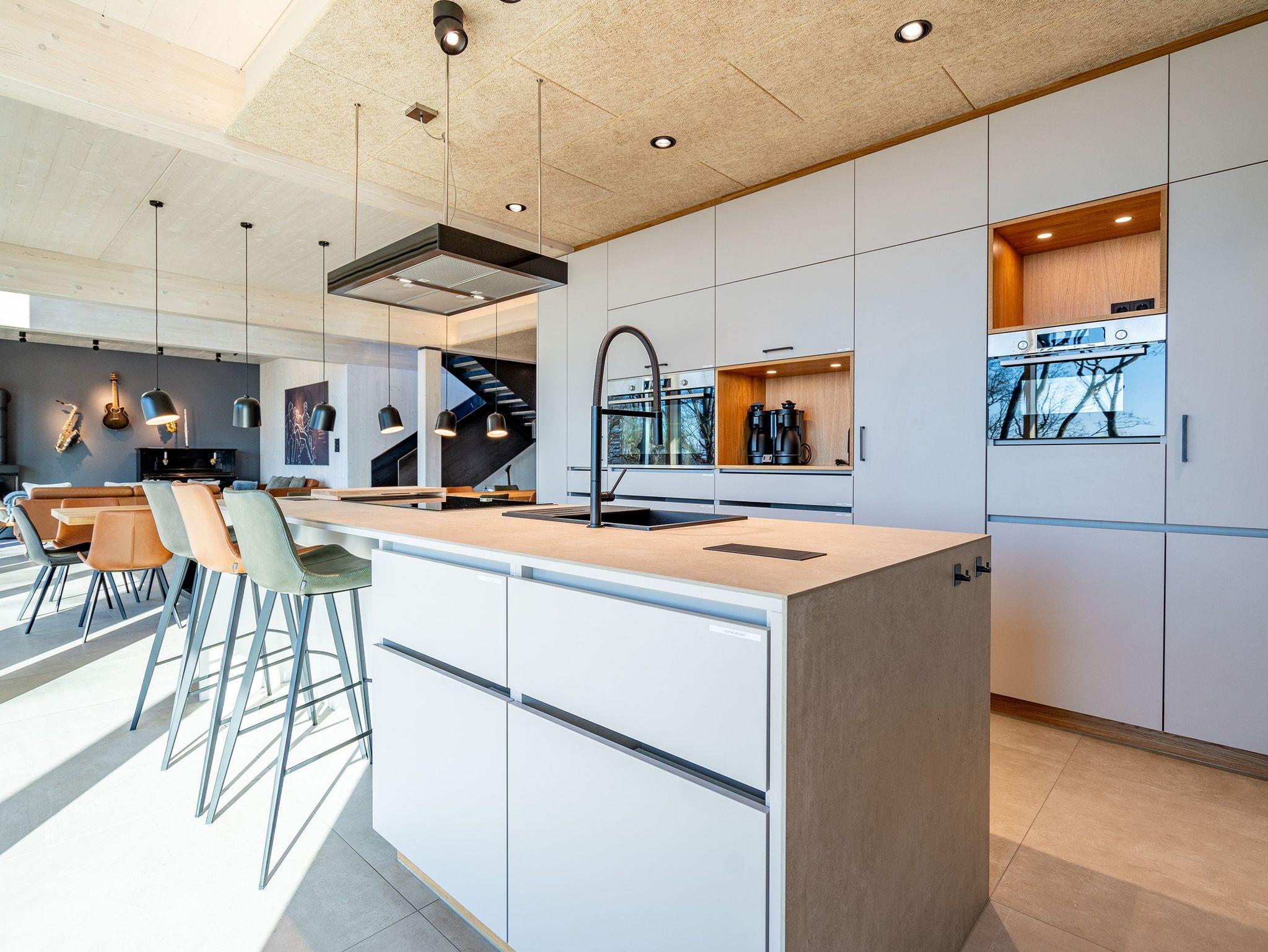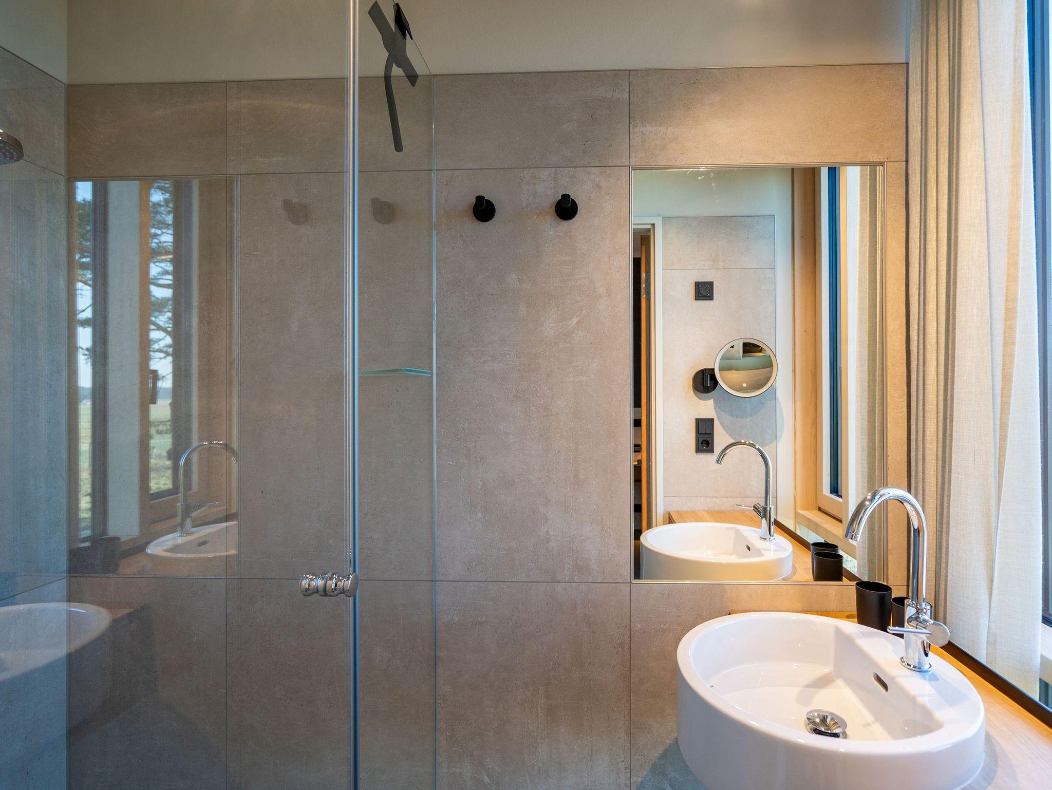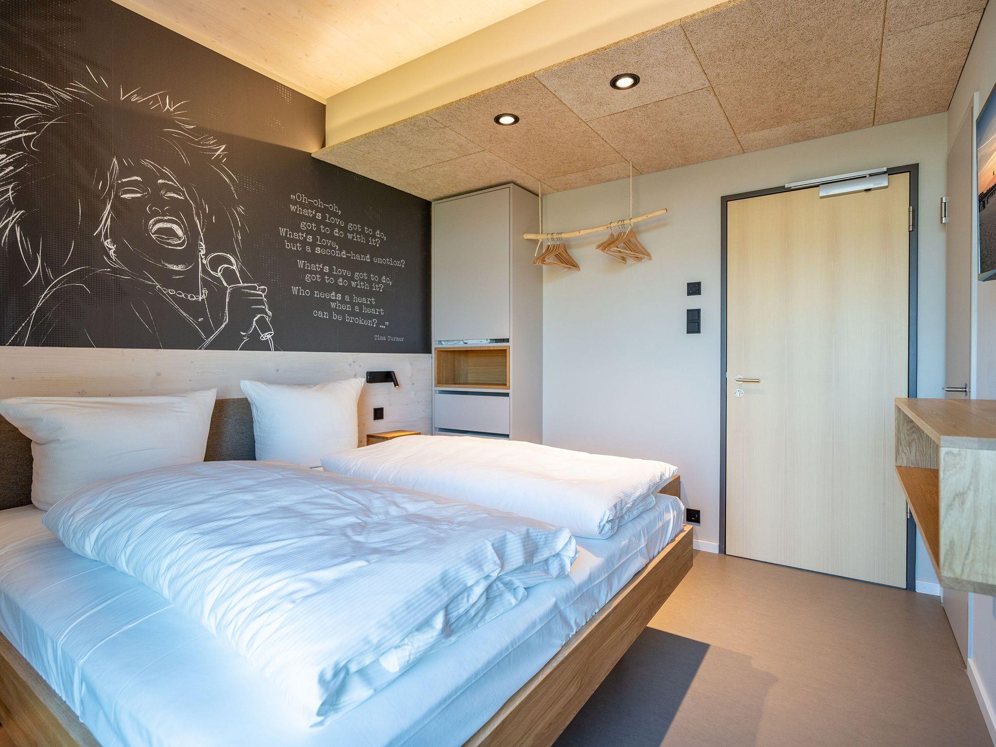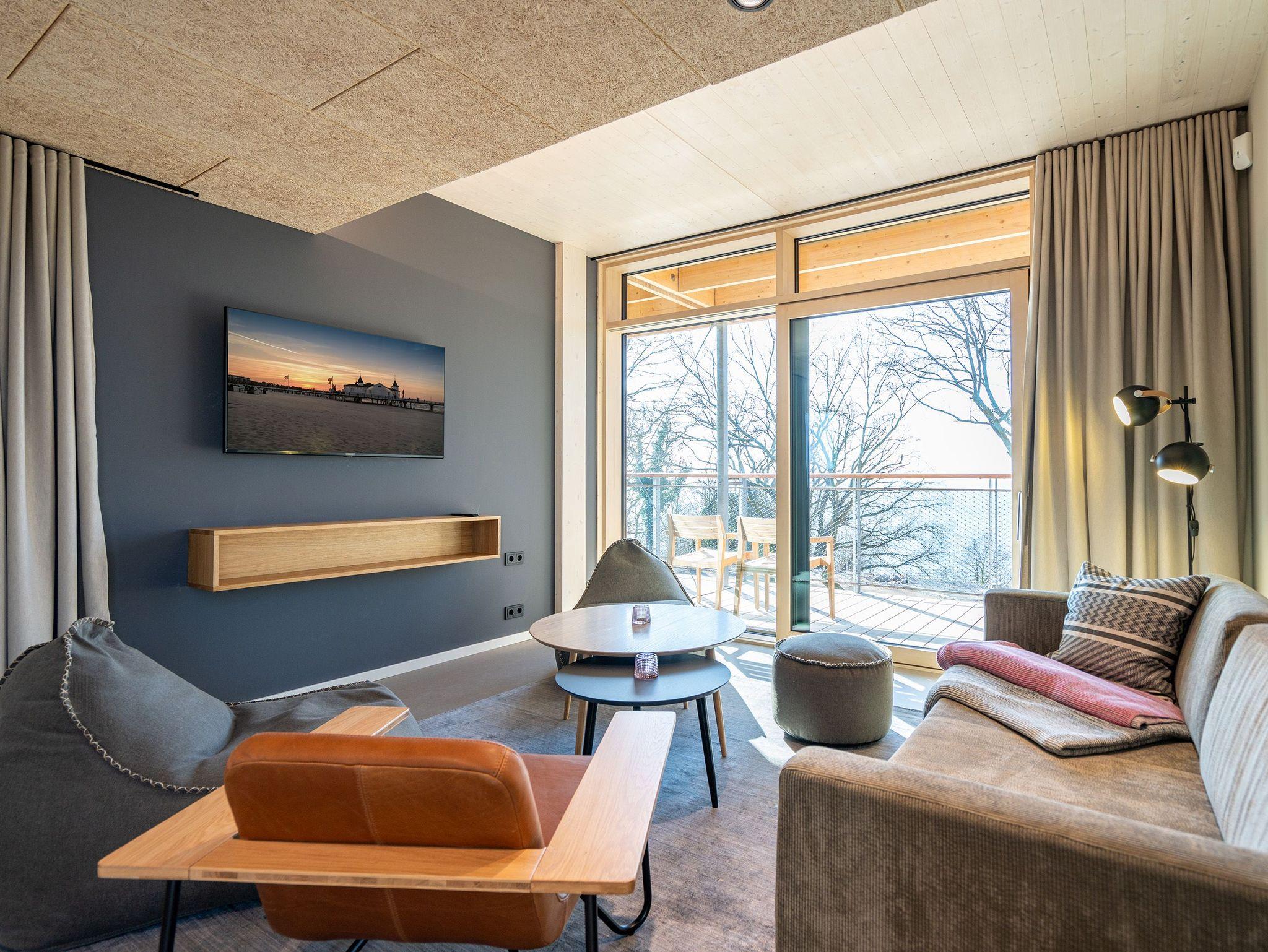 In dem 300 Quadratmeter großen Seminar- und Gästehaus mit großzügiger Außenanlage können bis zu 16 Personen nebst einem Kleinkind im Kinderreisebett beim Arbeiten oder Feiern, gemeinsam die Zeit genießen. In dieser besonderen Location kommen Bewohner nicht nur runter, sondern auf schöpferische Ideen voller Rhythm and Blues. Denn in der modernen Architektur des Hauses aus Stahl, Beton und Holz stecken jede Menge Reminiszenzen an die großen Künstler des Rock?n? Roll. Die Liebe zum musikalischen Detail steckt in vielen Kleinigkeiten. Wer mit offenen Augen durchs Haus schlendert, wird garantiert inspiriert. Legen Sie doch eine Platte auf dem Plattenspieler auf und träumen Sie sich in die Klänge großartiger Songs.Ein großer und offener Wohnbereich im Erdgeschoss ist perfekt dafür gemacht, Produktivität und Freizeit miteinander zu verbinden. Auch für große Familientreffen ist die Küstenkiste bestens geeignet. Im loftähnlichen Gemeinschaftsbereich lässt es sich wunderbar feiern, essen, gemeinsam kochen oder einfach nur zusammensitzen und das Leben genießen. Der Wohnbereich mit Ledersofas, Kamin und Klavier, der Essbereich mit riesiger Holztafel, die sich auch bestens zum Brainstormen, Diskutieren und Pläneschmieden eignet, und die supermoderne Küche sorgen für ein Gefühl von Freiheit und Nähe, von Unbeschwertheit und dem Fokus auf das Wesentliche. Auch im Innenhof und auf der Sonnenterrasse mit Grill laden zwei große Tafeln zum gemeinsamen Essen und Entspannen ein. Die Küche ist mit allem ausgestattet, was man sich für das Kochen in Gesellschaft nur wünschen kann. Sie verfügt über einen 6-Platten-Induktionsherd, einen Backofen sowie eine Mikrowelle-Backofen-Kombination. Auch mit 16 Mitbewohnern ist der Abwasch kein Problem. Denn den übernehmen zwei große Geschirrspüler. In den Schränken und in einem Serviceraum mit Waschmaschine, Trockner und zusätzlichem Kühl- und Gefrierschrank findet sich viel Stauraum für alle brauchbaren Utensilien, die dank Beschriftung, leicht zu finden sind. Die Gäste wohnen in acht Studios ? zwei im Erdgeschoss, sechs im 1. Obergeschoss ? mit Doppelbett, Kleiderschrank, Flat-TV, eigenem Tageslicht-Duschbad und separatem WC. Drei der Schlafzimmer verfügen über einen Zugang zum Balkon mit Haffblick. Aber auch alle anderen Zimmer haben aus dem Bett einen Blick ins Grüne. Jedes Zimmer ist einem anderen Musikgenie gewidmet. Entscheiden Sie selbst, ob Sie sich und ihre Träume lieber von Janis Joplin, Joni Mitchel oder von Bob Dylan beflügeln lassen wollen. Im Obergeschoss gibt es einen weiteren Loungebereich mit Flat-TV und Zugang zum Balkon. In einem Fitnessraum kann man sich an den hochwertigen Geräten der Firma Nohrd wunderbar auspowern, um anschließend in der Sauna oder im Whirlpool, die Energieakkus wieder aufzuladen. Doch das eigentliche Highlight des Anwesens ist der weitläufige Garten mit Beachvolleyballfeld auf echtem Strandsand, lauschigen Eckchen zum Sitzen, einem Hot Tub und einer großen Chillterrasse mit Haffblick. Parkplätze und eine Wallbox für Elektroautos (gegen Gebühr) gibt es vor dem Haus. Tierliebe Gäste können gegen Aufpreis bis zu zwei ihrer Lieblinge mitbringen.