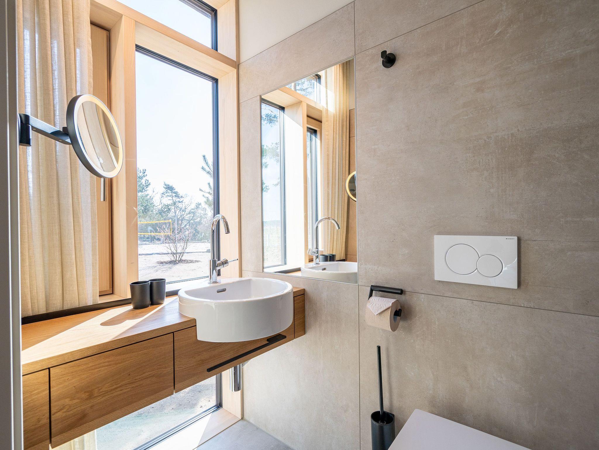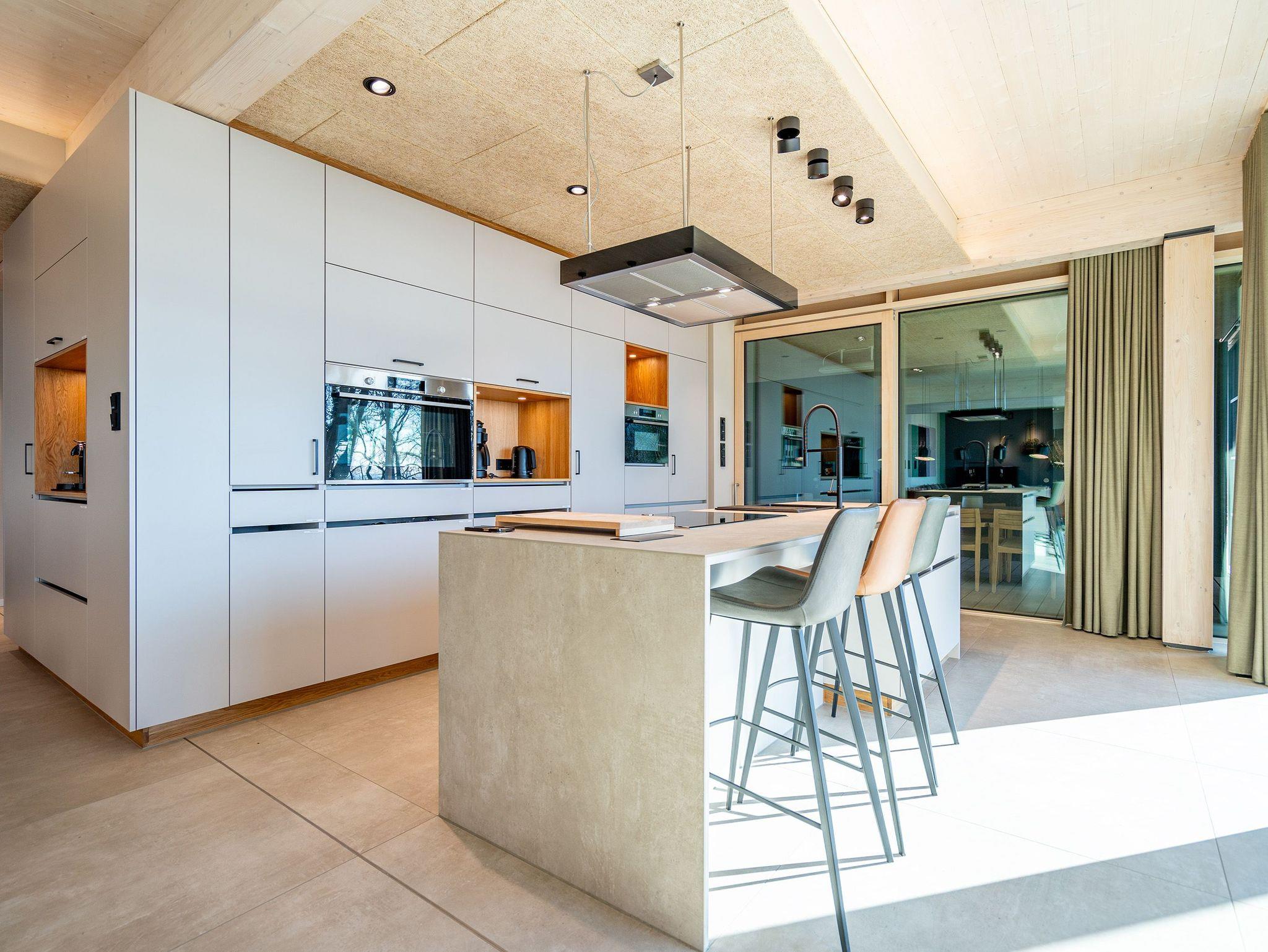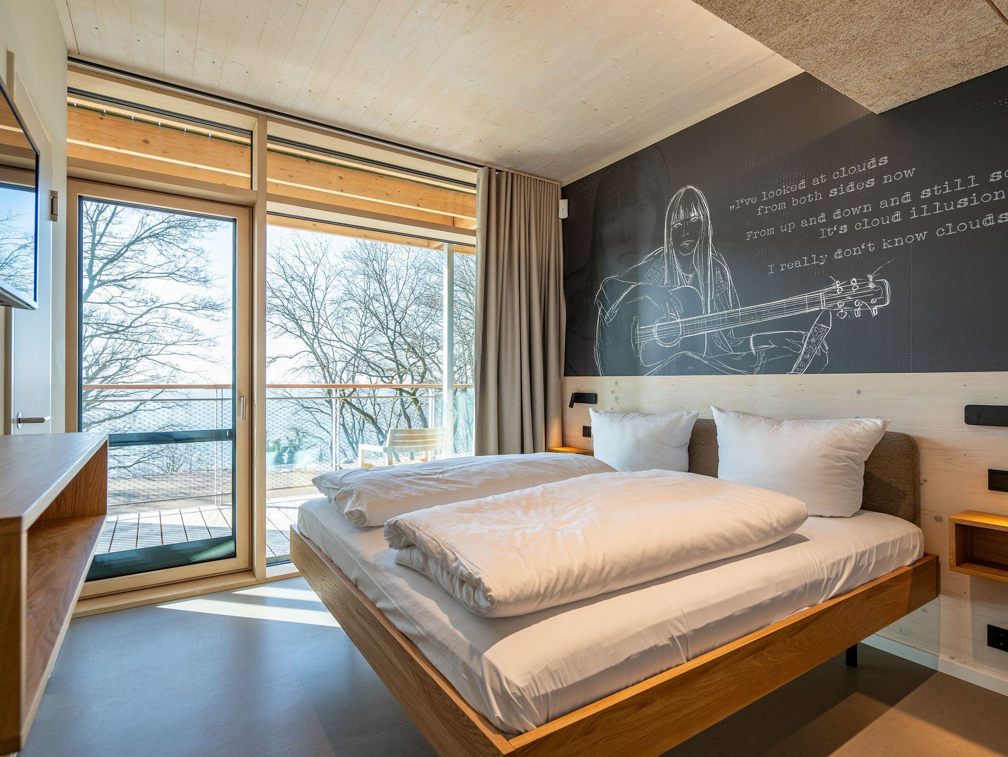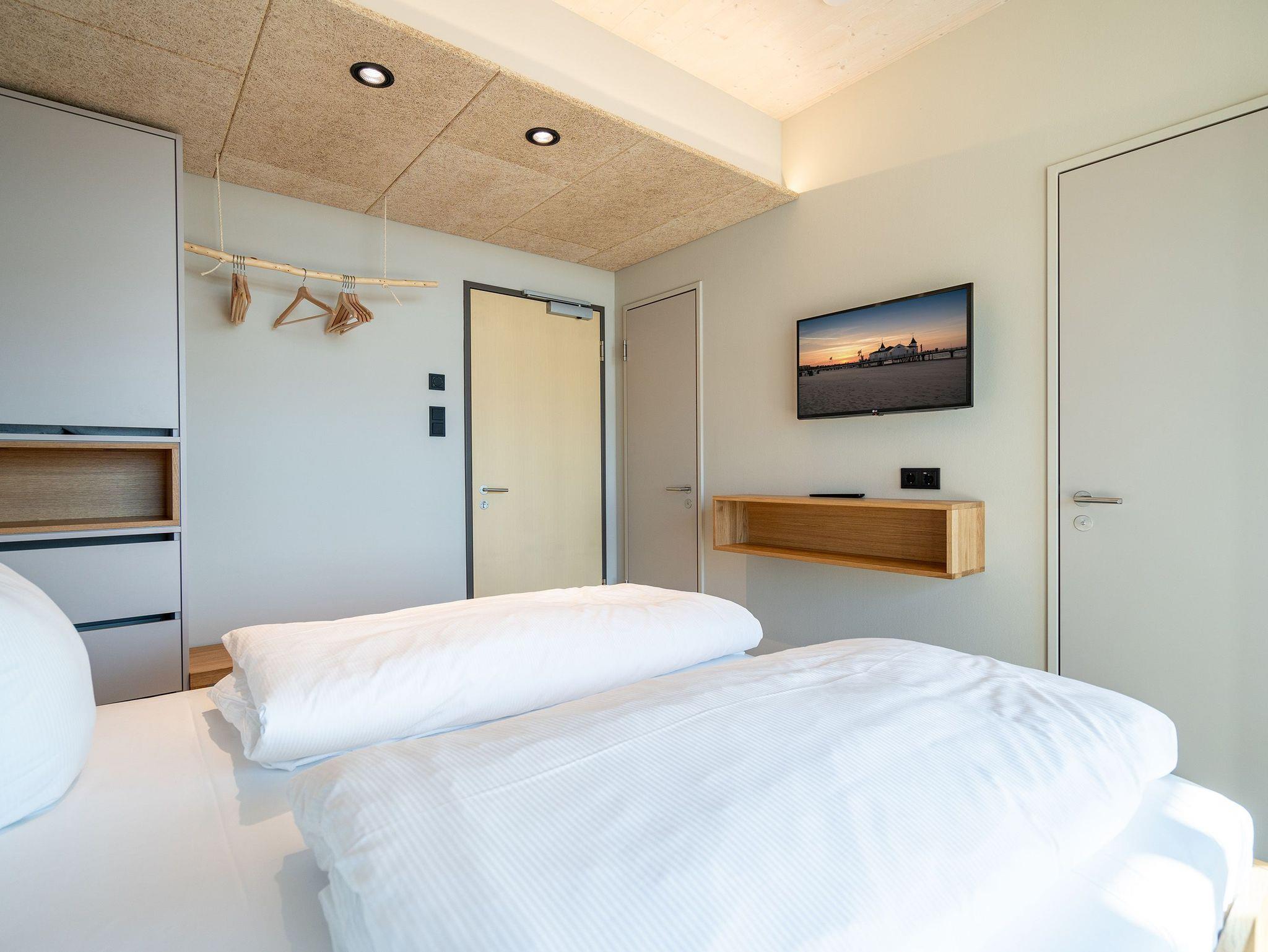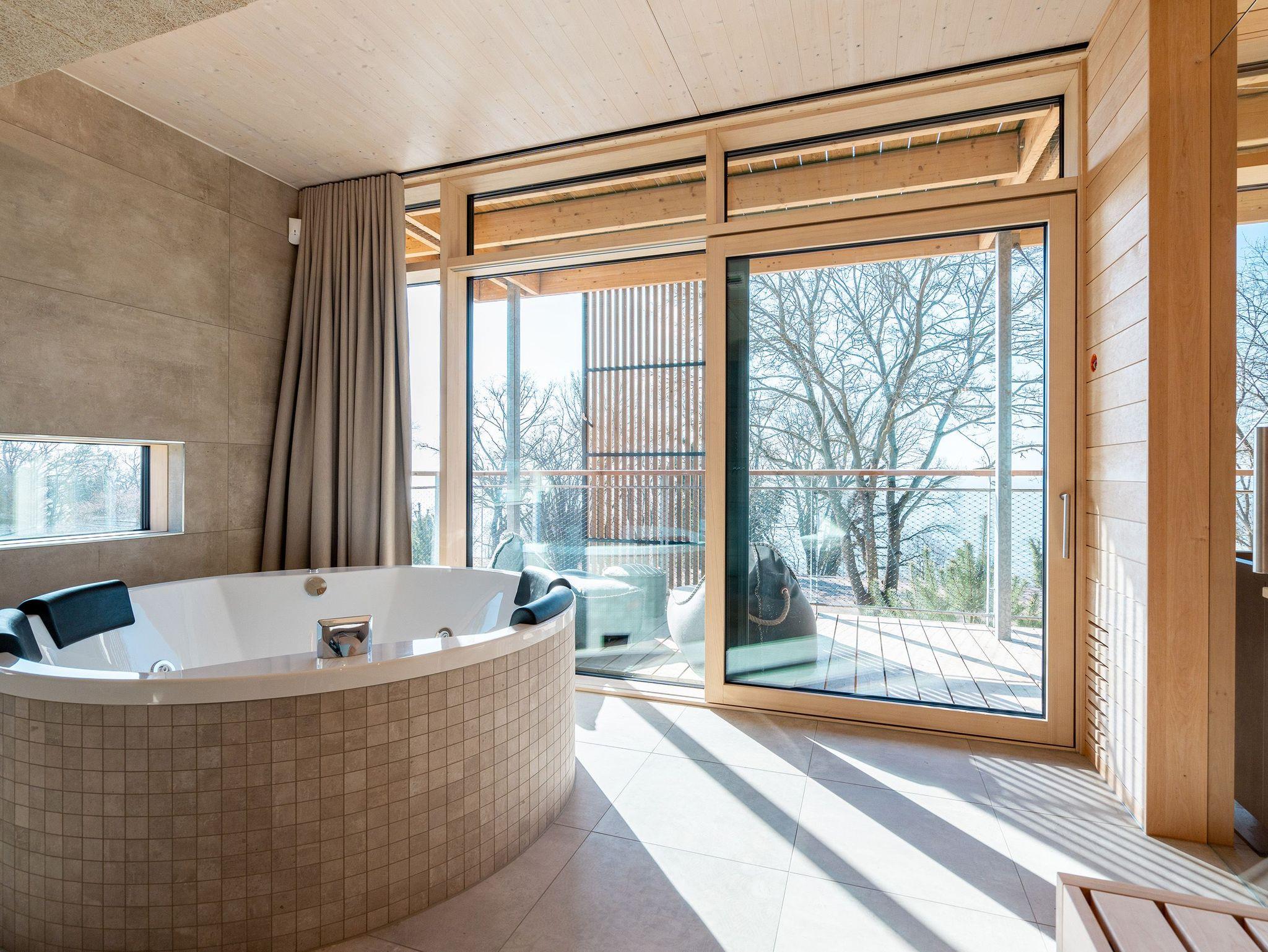 In dem 300 Quadratmeter großen Seminar- und Gästehaus mit großzügiger Außenanlage können bis zu 16 Personen nebst einem Kleinkind im Kinderreisebett beim Arbeiten oder Feiern, gemeinsam die Zeit genießen. In dieser besonderen Location kommen Bewohner nicht nur runter, sondern auf schöpferische Ideen voller Rhythm and Blues. Denn in der modernen Architektur des Hauses aus Stahl, Beton und Holz stecken jede Menge Reminiszenzen an die großen Künstler des Rock?n? Roll. Die Liebe zum musikalischen Detail steckt in vielen Kleinigkeiten. Wer mit offenen Augen durchs Haus schlendert, wird garantiert inspiriert. Legen Sie doch eine Platte auf dem Plattenspieler auf und träumen Sie sich in die Klänge großartiger Songs.Ein großer und offener Wohnbereich im Erdgeschoss ist perfekt dafür gemacht, Produktivität und Freizeit miteinander zu verbinden. Auch für große Familientreffen ist die Küstenkiste bestens geeignet. Im loftähnlichen Gemeinschaftsbereich lässt es sich wunderbar feiern, essen, gemeinsam kochen oder einfach nur zusammensitzen und das Leben genießen. Der Wohnbereich mit Ledersofas, Kamin und Klavier, der Essbereich mit riesiger Holztafel, die sich auch bestens zum Brainstormen, Diskutieren und Pläneschmieden eignet, und die supermoderne Küche sorgen für ein Gefühl von Freiheit und Nähe, von Unbeschwertheit und dem Fokus auf das Wesentliche. Auch im Innenhof und auf der Sonnenterrasse mit Grill laden zwei große Tafeln zum gemeinsamen Essen und Entspannen ein. Die Küche ist mit allem ausgestattet, was man sich für das Kochen in Gesellschaft nur wünschen kann. Sie verfügt über einen 6-Platten-Induktionsherd, einen Backofen sowie eine Mikrowelle-Backofen-Kombination. Auch mit 16 Mitbewohnern ist der Abwasch kein Problem. Denn den übernehmen zwei große Geschirrspüler. In den Schränken und in einem Serviceraum mit Waschmaschine, Trockner und zusätzlichem Kühl- und Gefrierschrank findet sich viel Stauraum für alle brauchbaren Utensilien, die dank Beschriftung, leicht zu finden sind. Die Gäste wohnen in acht Studios ? zwei im Erdgeschoss, sechs im 1. Obergeschoss ? mit Doppelbett, Kleiderschrank, Flat-TV, eigenem Tageslicht-Duschbad und separatem WC. Drei der Schlafzimmer verfügen über einen Zugang zum Balkon mit Haffblick. Aber auch alle anderen Zimmer haben aus dem Bett einen Blick ins Grüne. Jedes Zimmer ist einem anderen Musikgenie gewidmet. Entscheiden Sie selbst, ob Sie sich und ihre Träume lieber von Janis Joplin, Joni Mitchel oder von Bob Dylan beflügeln lassen wollen. Im Obergeschoss gibt es einen weiteren Loungebereich mit Flat-TV und Zugang zum Balkon. In einem Fitnessraum kann man sich an den hochwertigen Geräten der Firma Nohrd wunderbar auspowern, um anschließend in der Sauna oder im Whirlpool, die Energieakkus wieder aufzuladen. Doch das eigentliche Highlight des Anwesens ist der weitläufige Garten mit Beachvolleyballfeld auf echtem Strandsand, lauschigen Eckchen zum Sitzen, einem Hot Tub und einer großen Chillterrasse mit Haffblick. Parkplätze und eine Wallbox für Elektroautos (gegen Gebühr) gibt es vor dem Haus. Tierliebe Gäste können gegen Aufpreis bis zu zwei ihrer Lieblinge mitbringen.