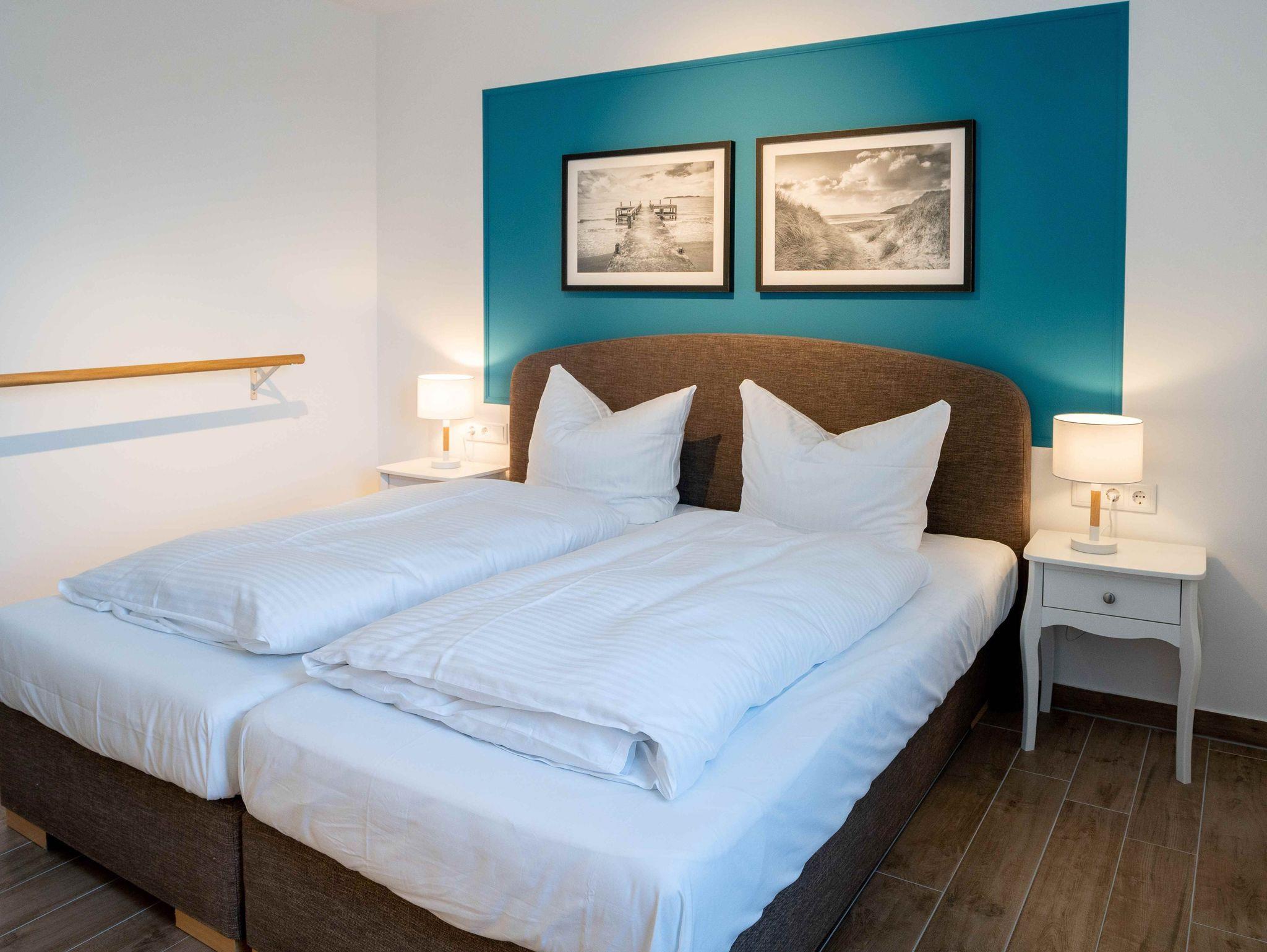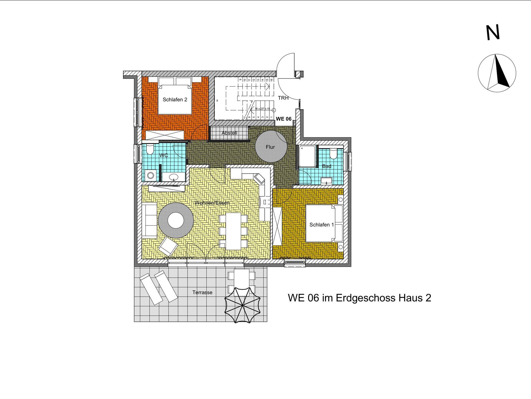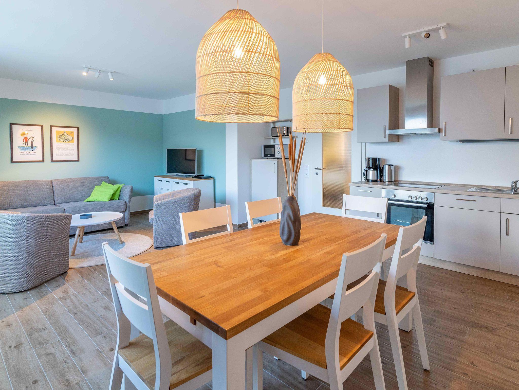 Unsere Ferienwohnung ist großzügig geschnitten und für bis zu 6 Personen geeignet, Erdgeschoß, 86 qm, 2 Schlafzimmer zzgl. Schlafcoach im Wohnzimmer, 1 Terrasse, 2 Bäder, Küche