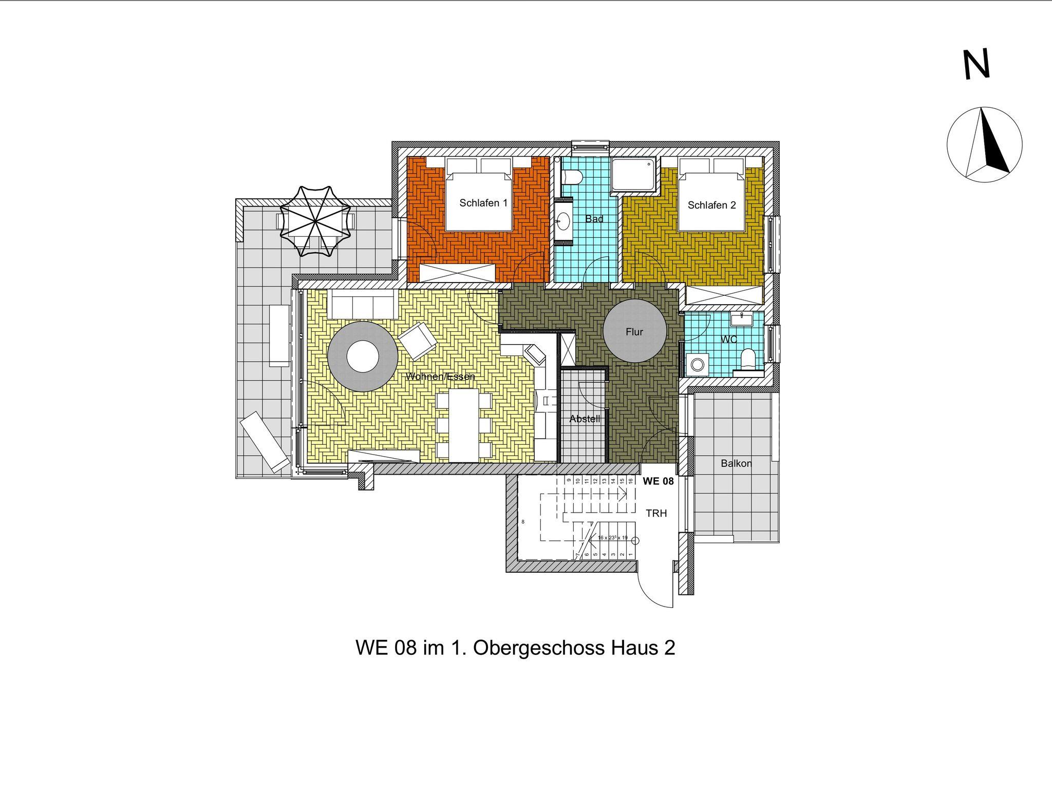 Unsere Ferienwohnung ist großzügig geschnitten und für bis zu 6 Personen geeignet, 1. OG, 90 qm, 2 Schlafzimmer zzgl. Schlafcoach im Wohnzimmer, 2 Balkone, 2 Bäder, Küche