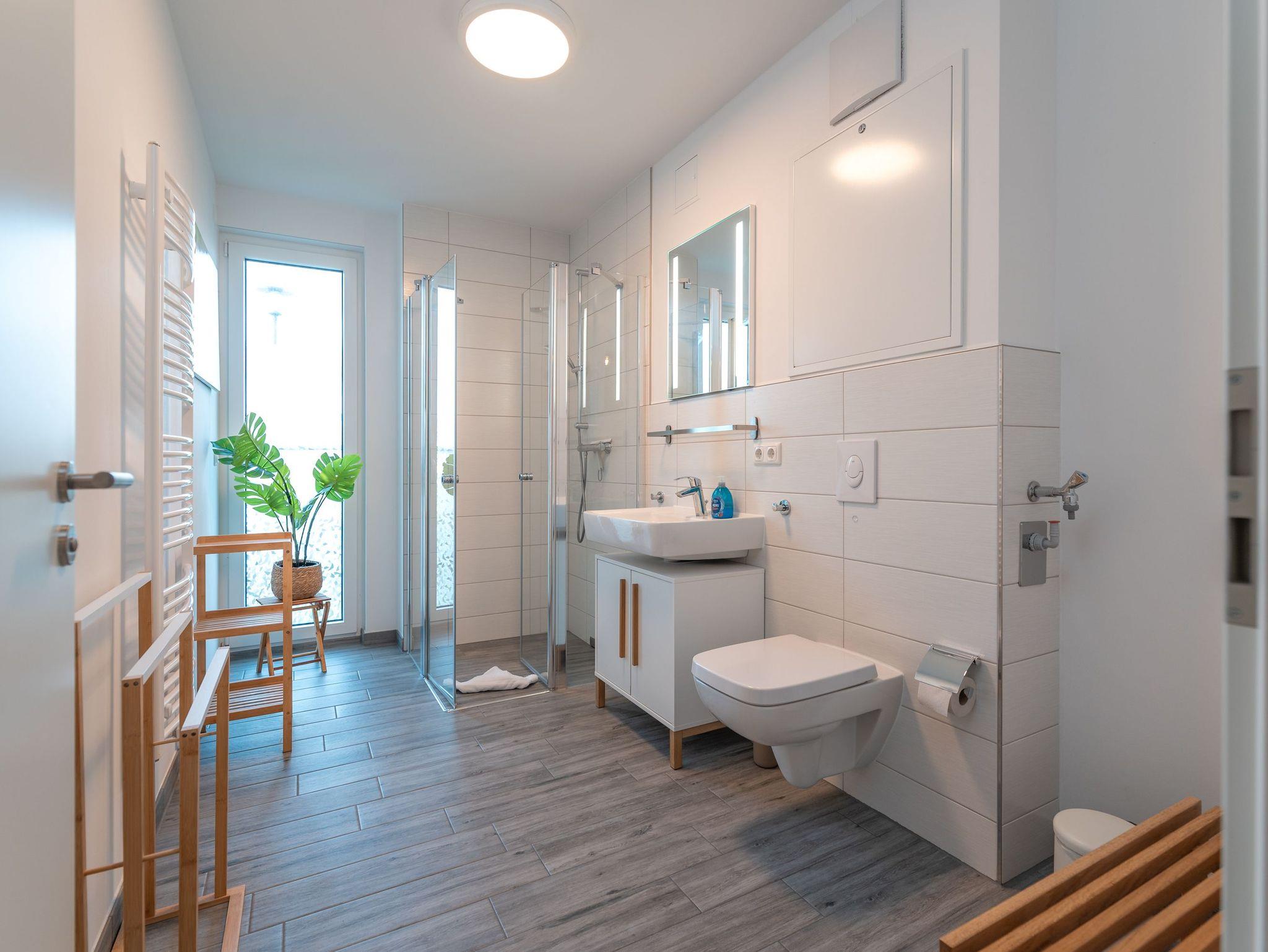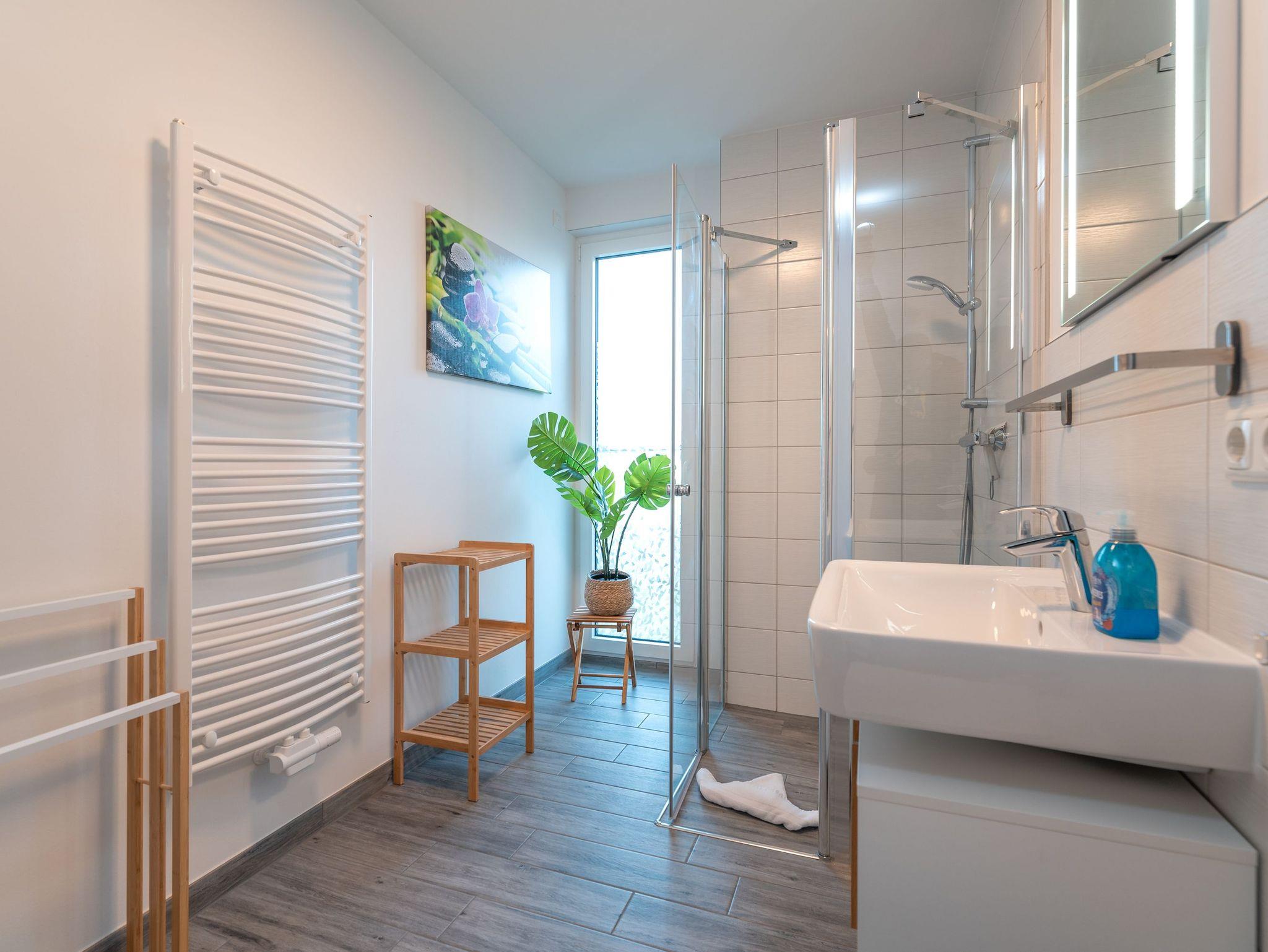 Das Badezimmer ist modern gestaltet mit einer ebenerdigen Dusche, WC, einem Waschtisch mit Spiegel, Fön und einer Handtuchheizung. Kostenfreies WLAN ist in der gesamten Wohnung verfügbar.