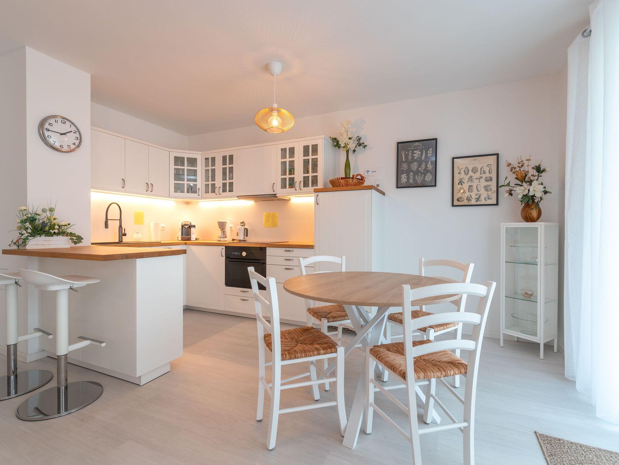 Das Herzstück der Wohnung ist der Wohn-/Essbereich mit einer voll ausgestatteten offenen Küche, die über ein Induktionskochfeld, eine Mikrowelle, einen Heißluftofen, einen Kühlschrank mit Gefrierfach und einen Geschirrspüler verfügt. Ein gemütlicher Essplatz mit vier Stühlen und eine bequeme Eckcouch laden zum Verweilen ein. Zur Unterhaltung stehen ein 50-Zoll-TV und ein Internetradio bereit. Die Couch kann bei Bedarf zu einem Schlafplatz (140 x 200 cm) umfunktioniert werden.