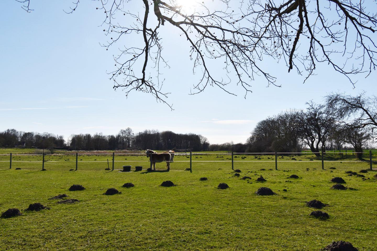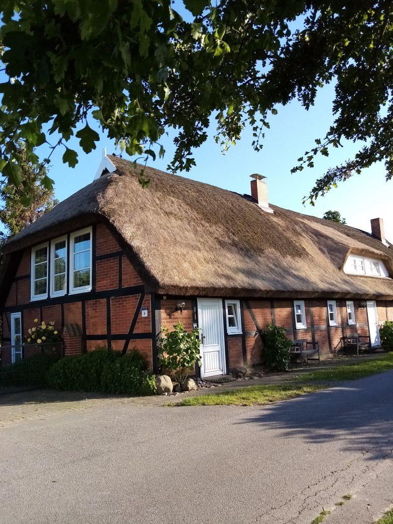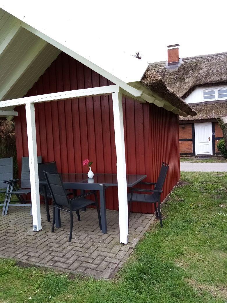 Vor dem Haus finden Sie einen Fahrradschuppen mit überdachtem Freisitz, ideal für kurze Pausen nach Radtouren oder Spaziergängen. Ein kleiner, seitlich gelegener, eingezäunter Gartenbereich kann ebenfalls genutzt werden.