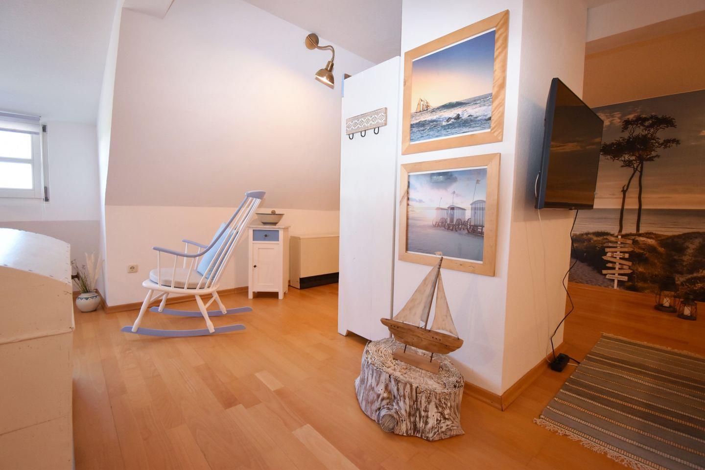 In der Nostalgischen Auszeit weht Ruhe durch alle Räume: helles Dachgeschoss, gemütliches Sofa, Leseecke und zwei komfortable Schlafzimmer laden zum Durchatmen ein. Die Umgebung mit Feldern, Bodden und stillem Wasser schenkt erholsame Momente. Ein kleiner, seitlicher Gartenbereich kann mit genutzt werden und ergänzt das Zuhause auf Zeit – ein Ort für Paare, Familien und Gäste mit Hund, die Natur und Stille lieben.
