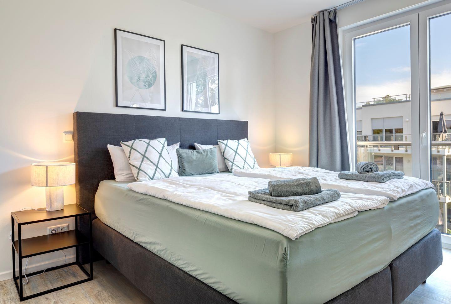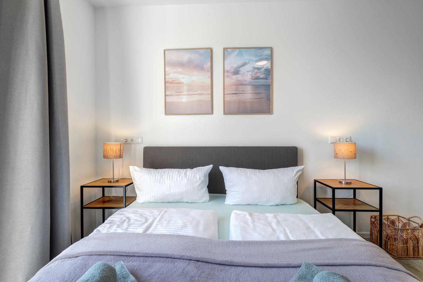 Die Ferienwohnung erstreckt sich über 93 Quadratmeter und bietet Platz für bis zu sechs Gäste.Das Wohnzimmer ist ein Rückzugsort mit bequemer Sofaecke und großen Fenstern.Die voll ausgestattete Küche ermöglicht Ihnen, kulinarische Köstlichkeiten zuzubereiten, die Sie dann auf dem sonnigen Balkon genießen können.Die Schlafzimmer sind ein Ort der Ruhe und Entspannung. Das komfortable Boxspringbett verspricht erholsame Nächte. Die beide Badezimmer sind modern gestaltet, mit einer geräumigen Dusche.